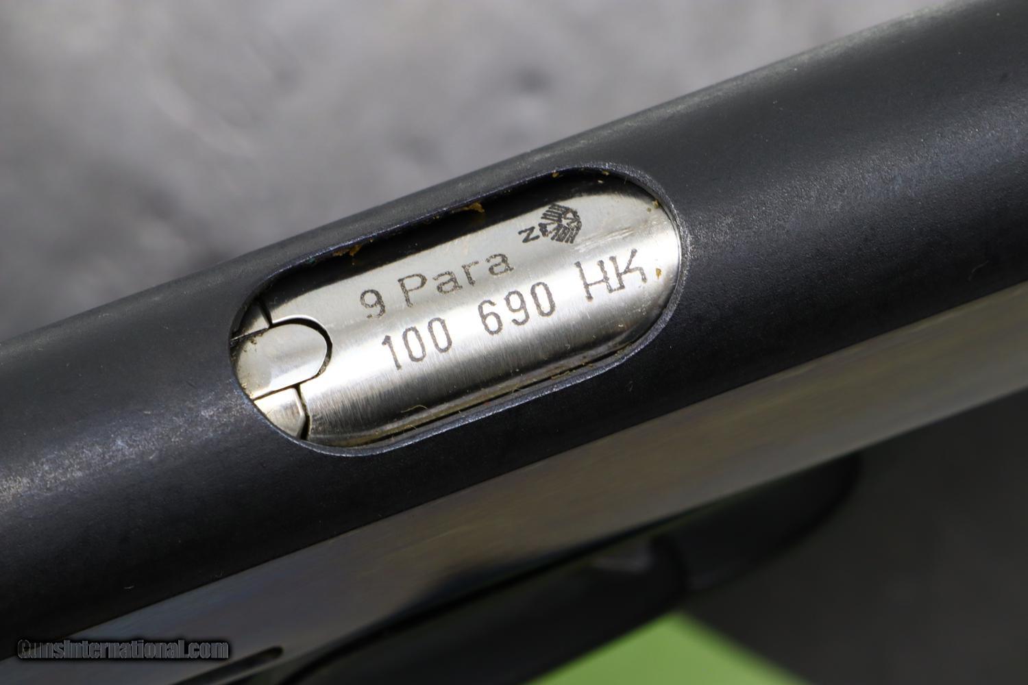 Near Exc, the only flaw related to a small chip on the left side of forward frame at muzzle. Comparable condition grip and magazines. Scuffed box with oil darkened styrofoam insert. Mirror bore. Perfect manual mechanics. A difficult to find H&K, particularly a high polished gun in the original box.