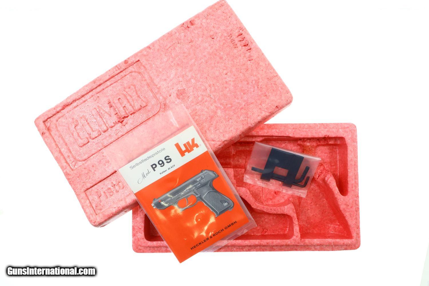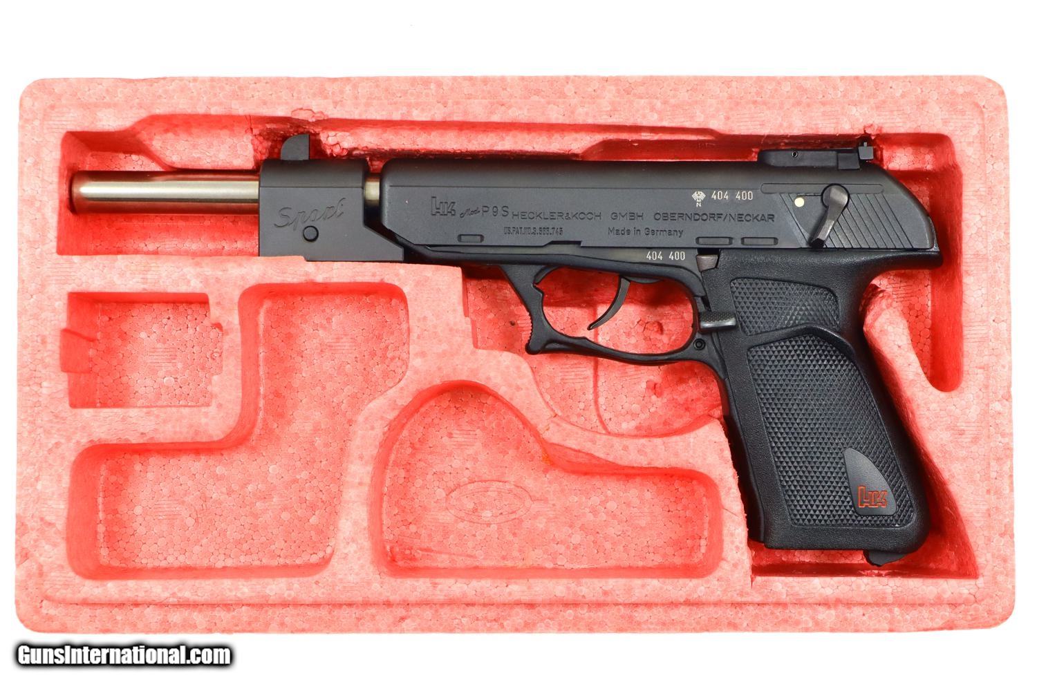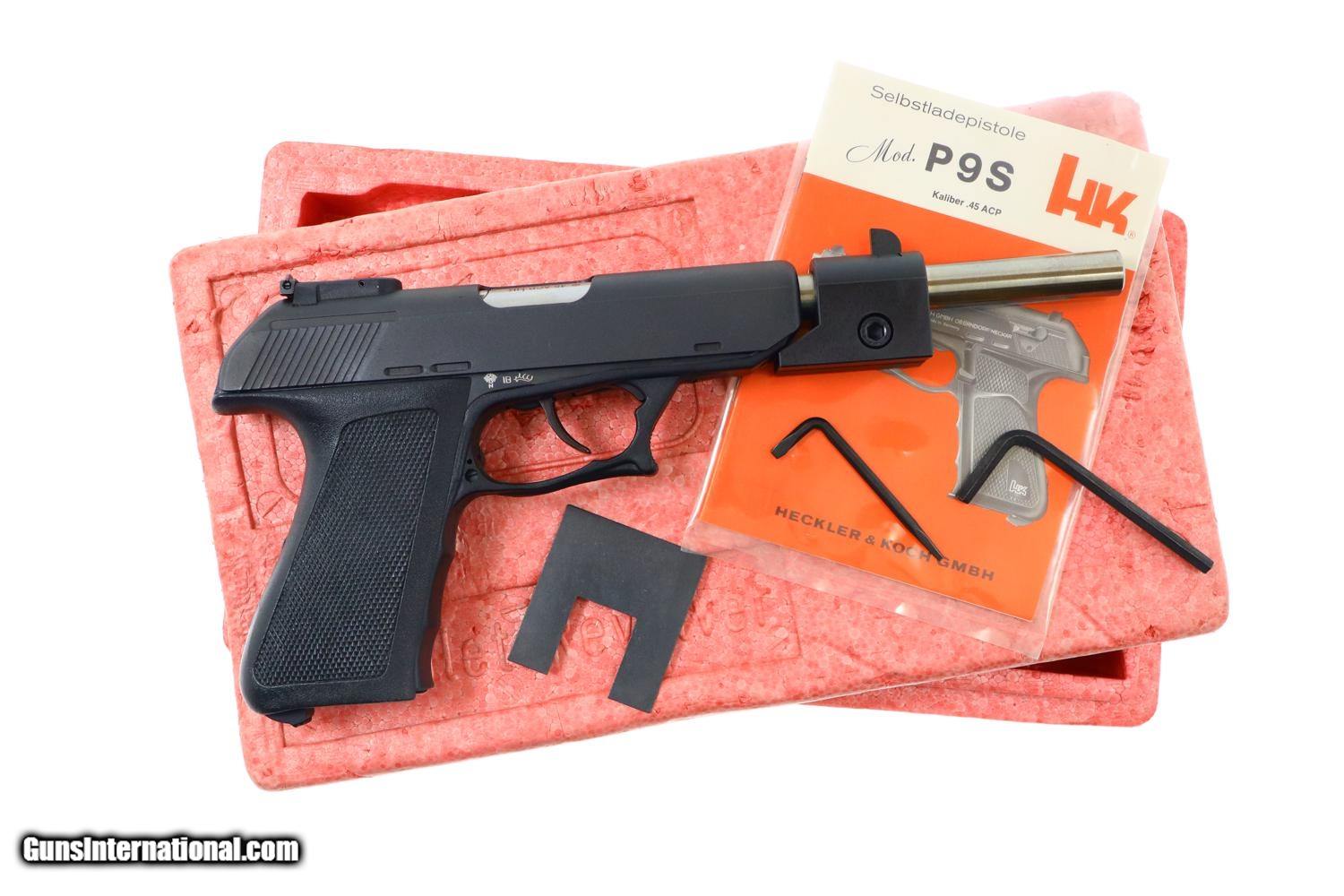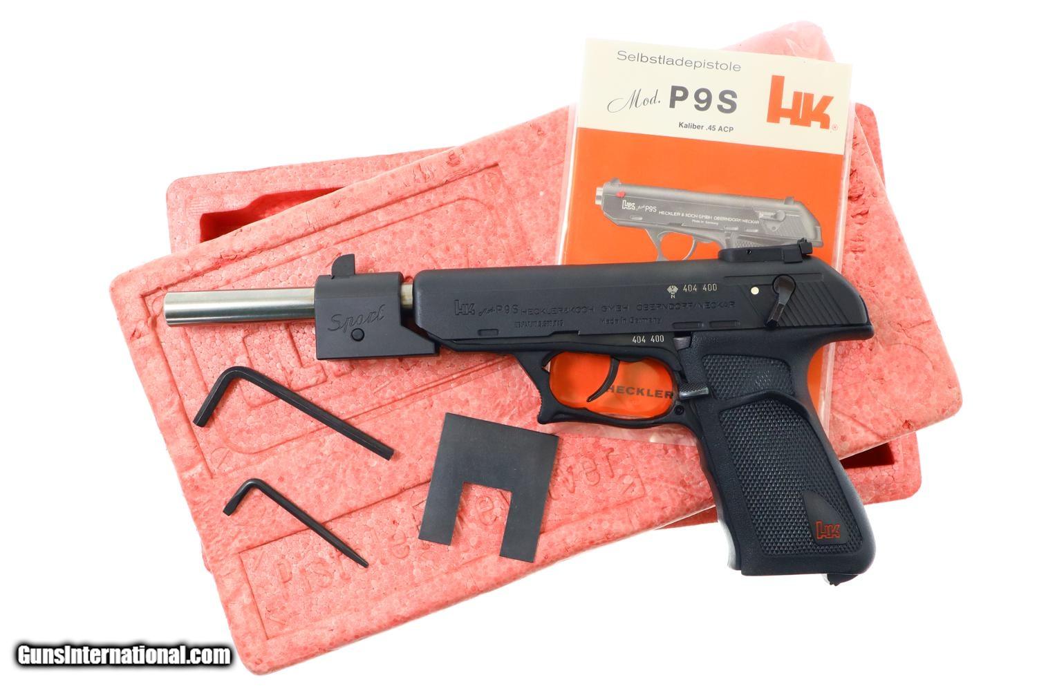 Description: Synopsis: H&K P9S, Target Sport Pistol, .45 ACP, Counterweight, #404400, FB00901 Description: Very scarce and super desirable H&K P9S Target Pistol in .45 ACP, made 1981, with extended barrel and "Sport" marked counterweight. SN: 404400. The pistol has a 7.5” barrel, fully adjustable sights and extended barrel with counterweight. Left side of slide marked with the usual H&K Mod P9S legend along with serial number and Eagle/N proofing. Serial number repeated on the left side of the frame. Barrel hood marked with caliber, manufacturer and proof. Right side of frame with usual proof marks. Polymer frame and grip secured on back with two screws. Original H&K magazine (not photographed) drilled with six indicator holes and having a detachable base. Complete with generic styrofoam shipping sleeve, original instruction booklet, and allen head wrench. Condition: EXC+ condition. Mirror bore. Perfect manual mechanics. A very impressive target pistol with literature and accessories! ~~Insured shipping fee of $65; most packages shipped using FedEx 2nd Day.~~ SOLD Manufacturer: H&K Serial Number: 404400 Caliber Info: .45ACP |