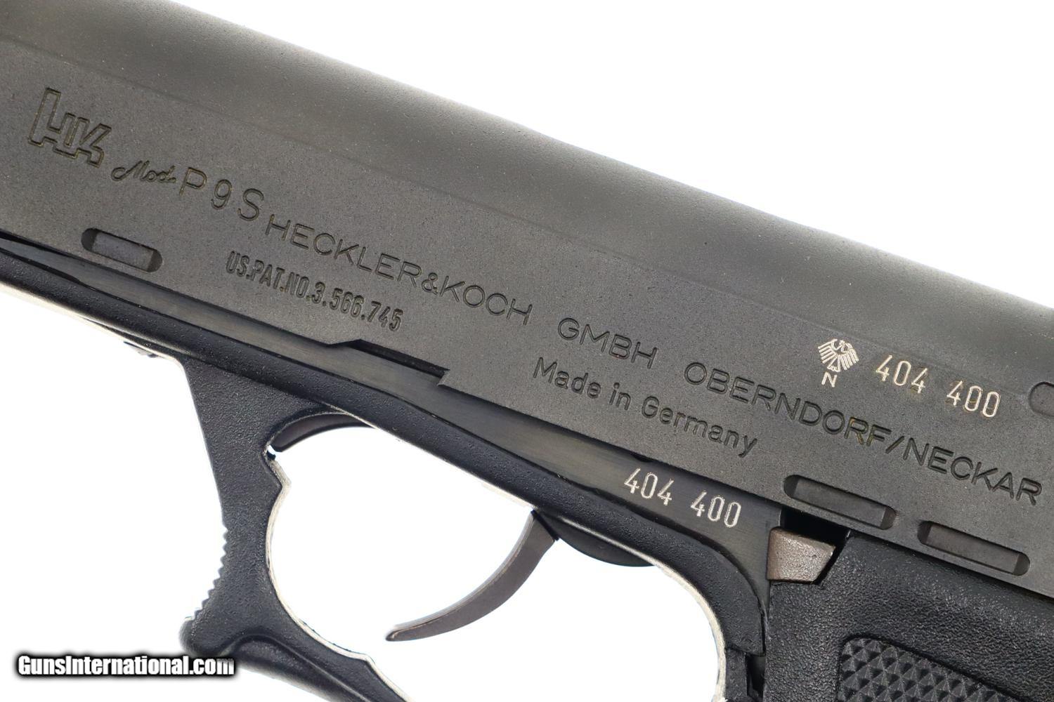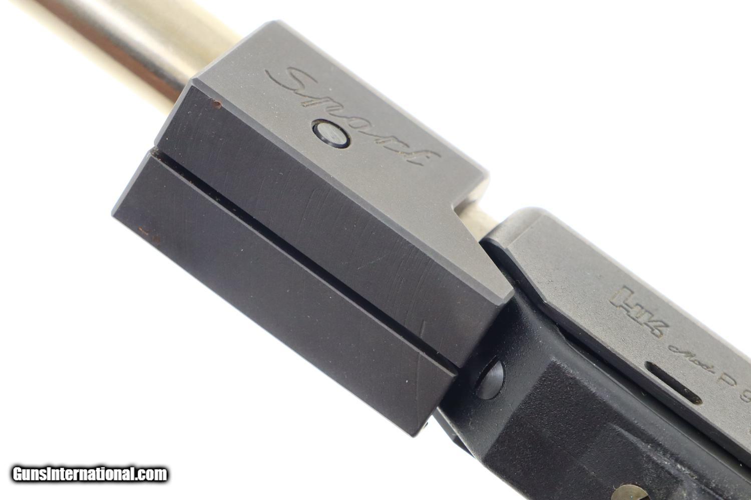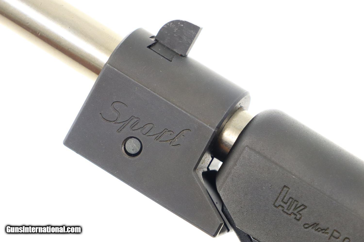 Description: Synopsis: H&K P9S, Target Sport Pistol, .45 ACP, Counterweight, #404400, FB00901 Description: Very scarce and super desirable H&K P9S Target Pistol in .45 ACP, made 1981, with extended barrel and "Sport" marked counterweight. SN: 404400. The pistol has a 7.5” barrel, fully adjustable sights and extended barrel with counterweight. Left side of slide marked with the usual H&K Mod P9S legend along with serial number and Eagle/N proofing. Serial number repeated on the left side of the frame. Barrel hood marked with caliber, manufacturer and proof. Right side of frame with usual proof marks. Polymer frame and grip secured on back with two screws. Original H&K magazine (not photographed) drilled with six indicator holes and having a detachable base. Complete with generic styrofoam shipping sleeve, original instruction booklet, and allen head wrench. Condition: EXC+ condition. Mirror bore. Perfect manual mechanics. A very impressive target pistol with literature and accessories! ~~Insured shipping fee of $65; most packages shipped using FedEx 2nd Day.~~ SOLD Manufacturer: H&K Serial Number: 404400 Caliber Info: .45ACP |