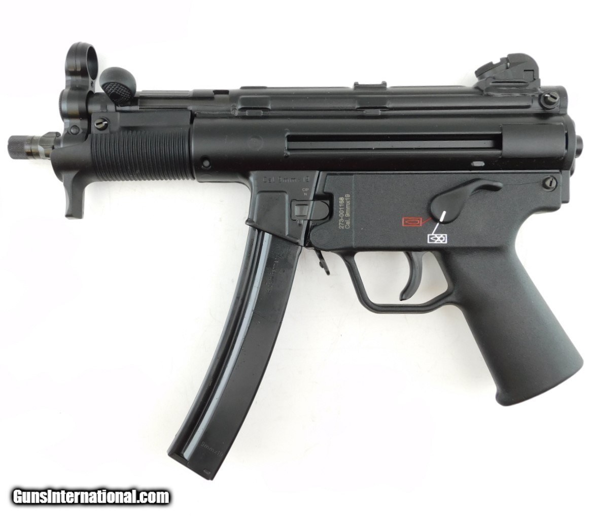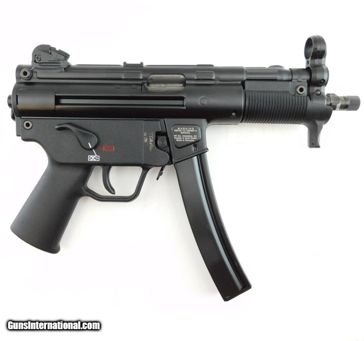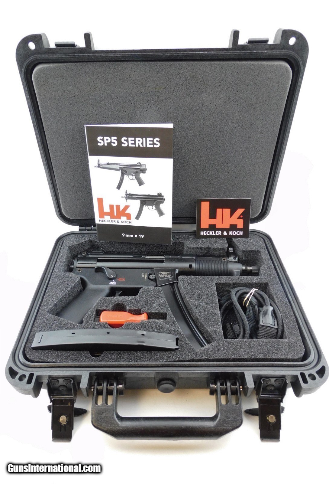 Description: H&K SP5-PDW (81000481) 9X19 NIB, 4.5" threaded bbl, adjustable rear aperture sight, hooded post front sight, black finish, sling loop, sling, tool, and two 30 round magazines. Pictures are representative. Add 3% for Credit Card Shipping $35.00 in the 48 contiguous United States Information from H&K: "The SP5K-PDW is semi-automatic civilian sporting version of the ultimate close quarters weapon – The HK MP5K. The “K” designation is from the German word for short – kurz; thus the K model’s shorter barrel and receiver. But no matter the size, all SP5 and MP5 models share the same HK roller-delayed blowback operating system, which is legendary for its accuracy, reliability, and smooth shooting dynamic. Originally perfected on the Heckler & Koch G3 rifle, this system has been used on many HK firearms still deployed around the world. The SP5K-PDW was designed and manufactured to meet the definition of a civilian pistol. It is loaded with authentic features, like a 4.5” barrel with Navy-style threaded tri-lug adaptor, paddle magazine release, and fluted chamber. SOLD |