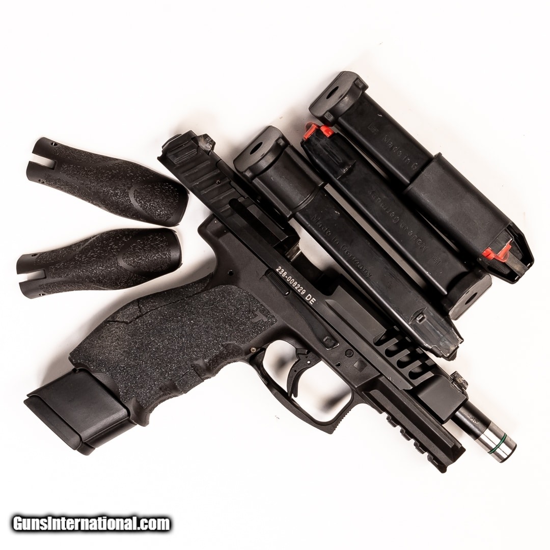 Description: Guns Listing ID: 513299 This Heckler & Koch VP9L is a competition version of the popular VP9. It‚‚s easy to shoot, smooth, and built to last. Front and rear sights are a bit \"beat up\". Some minor scratches on slide at front and rear sight install areas. Included are two 20-round magazines, two 17-round magazines, grip panels, backstraps, a manual, and the original case SOLD Manufacturer: HECKLER & KOCH Model: VP9L Caliber Info: 9MM LUGER (9X19 PARA) Condition: Used - Certified Barrels: 5 BARREL Finish: BLACK |