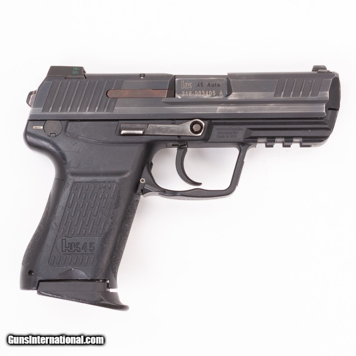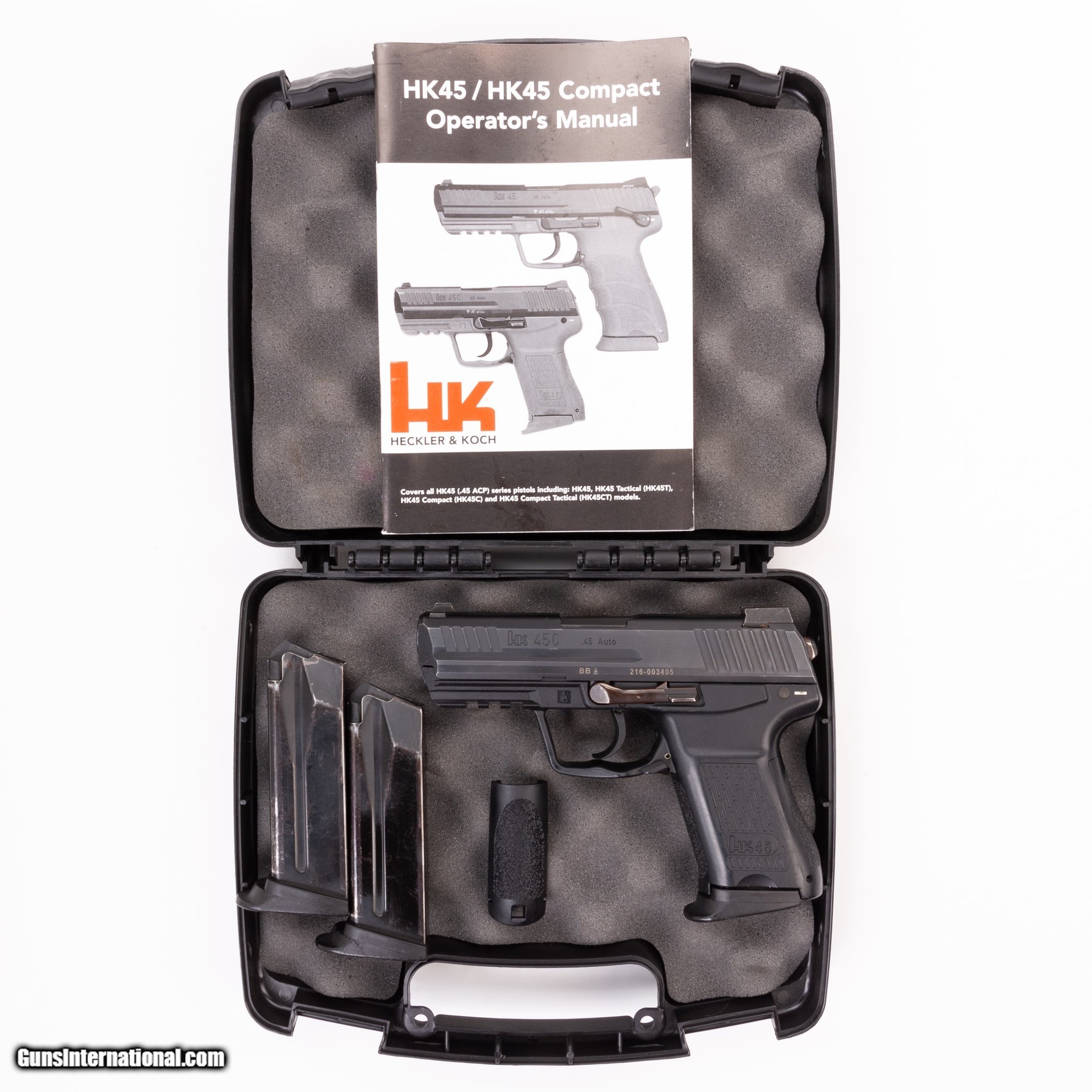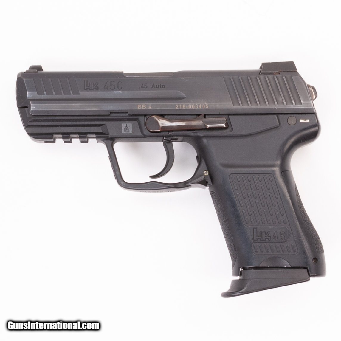 Description: Guns Listing ID: 399840 This HK 45C features night sights, \"O\" ring barrel for improved accuracy, and a law enforcement trigger. Purchase includes the original case, manual, three 8-round magazines, and an extra backstrap. Get the best bang for your buck when you get a Certified Used Firearm . When you see the Certified Used stamp on any of our firearms, you can be confident that you‚‚re getting exactly what you want – a gun only in very good to excellent condition and held to the highest quality standard. All Certified Used Guns come with a ‚‚no questions asked‚‚ return policy . PLUS, ALL CERTIFIED USED GUNS SHIP FR SOLD Manufacturer: HECKLER & KOCH Model: 45C Caliber Info: .45 ACP Condition: Used - Certified Barrels: 4 BARREL Action: SEMI AUTOMATIC Finish: BLACK Weight: 1.8 LBS. |
