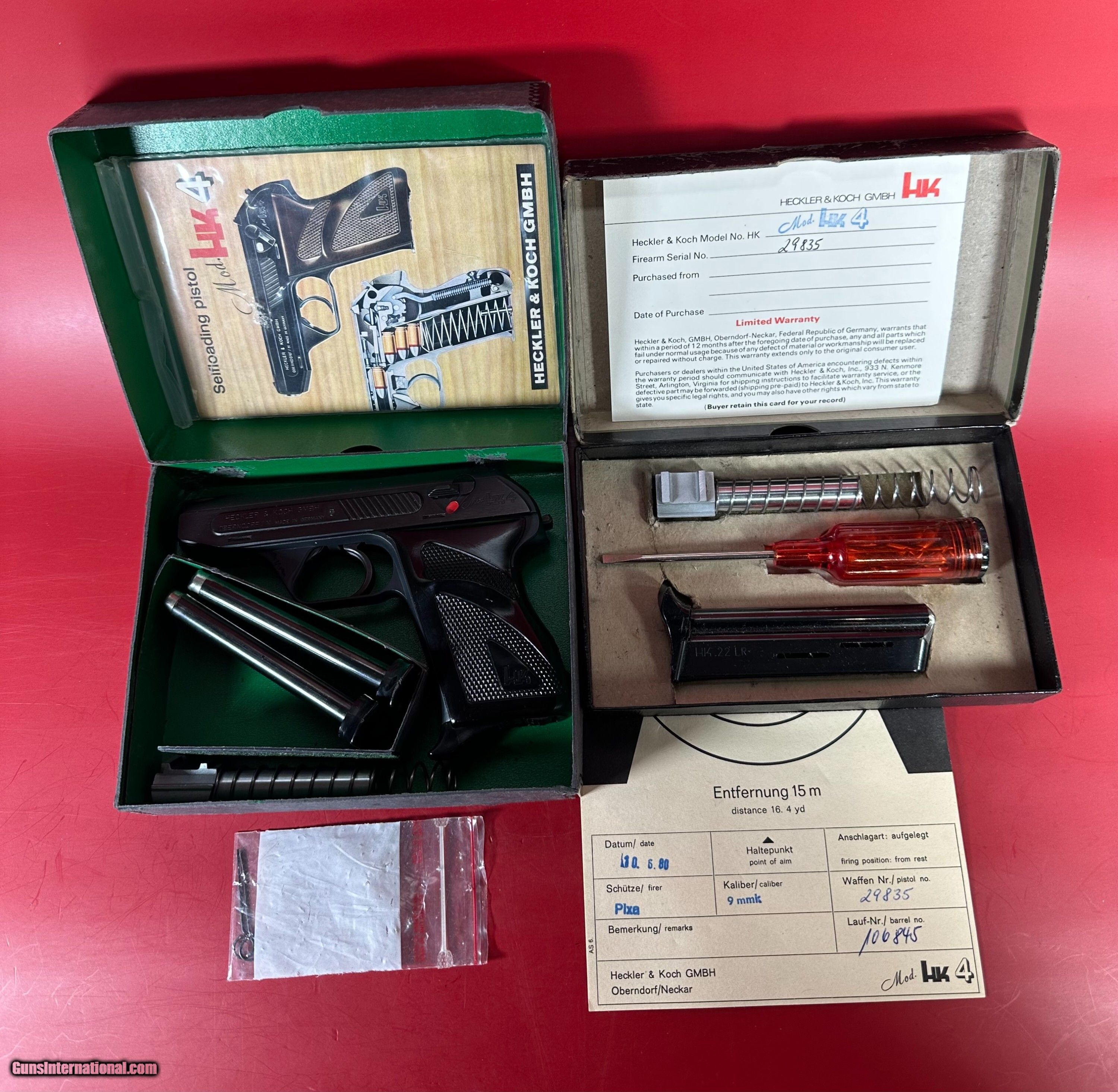 Description: The HK4 is a pocket pistol, first introduced by HK in either 1964 or 1967. It was distinctive for allowing shooters to swap barrels chambered for different cartridges without tools. The HK4 is largely a refined Mauser HSc self-loading pistol. Similar to the HSc, the HK4 utilizes a straight blowback action, with a double-action trigger and a slide-mounted safety. Additionally, the pistol has a internal safety mechanism that will keep the firing pin misaligned from the hammer until the trigger is pulled. Switching between the three different centerfire chamberings (6.35mm Browning aka .25 ACP, 7.65mm Browning aka .32 ACP, 9mm short aka .380 ACP) merely requires swapping the barrel and recoil spring assembly and the magazine. Switching between the centerfire chamberings and rimfire chambering (.22 LR) also involves a further step of loosening a screw on the breech face and rotating the removable breech face to either the centerfire or rimfire position. The example was manufactured in 1980 and is in excellent condition. The pistol comes with the box, manual, warranty card, test target, 2 original magazines. It's chambered in 380 ACP. The metal is about 98%. The grips don't have any cracks and about 98%. The conversion kit 32 ACP comes with one magazine and barrel. Barrel is excellent. Don't miss your chance to own piece of history, great plinker, fun gun and amazing self defense weapon. It will make great addition to any collection. Layaway and payment plan are available. Handgun Caliber: .380 ACP (9x17mm Browning Short) Price: $1,699.00 Shipping: $39.00 Contact Seller |