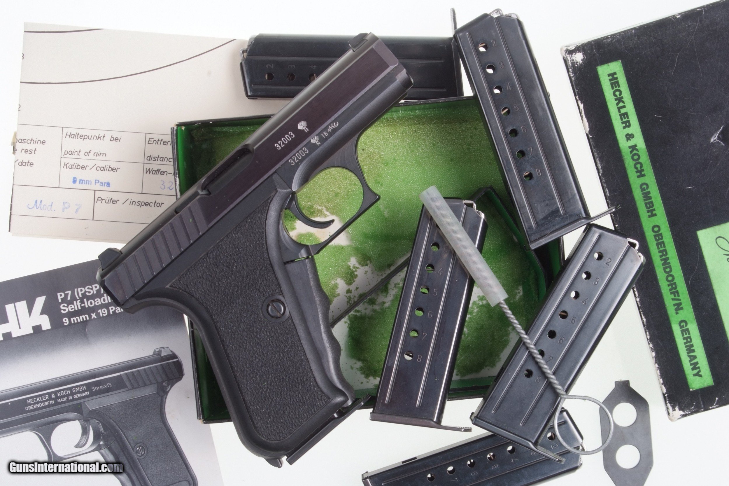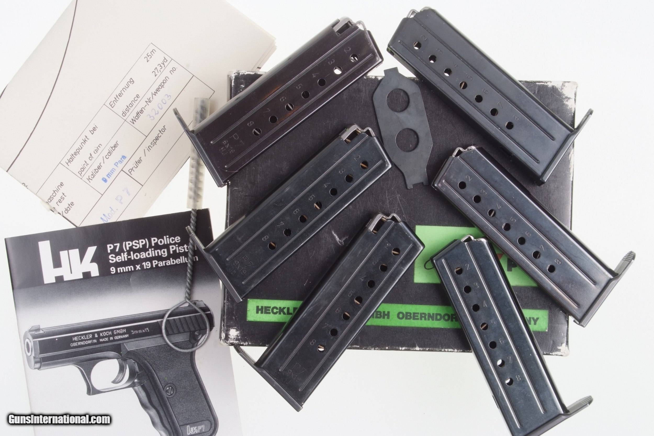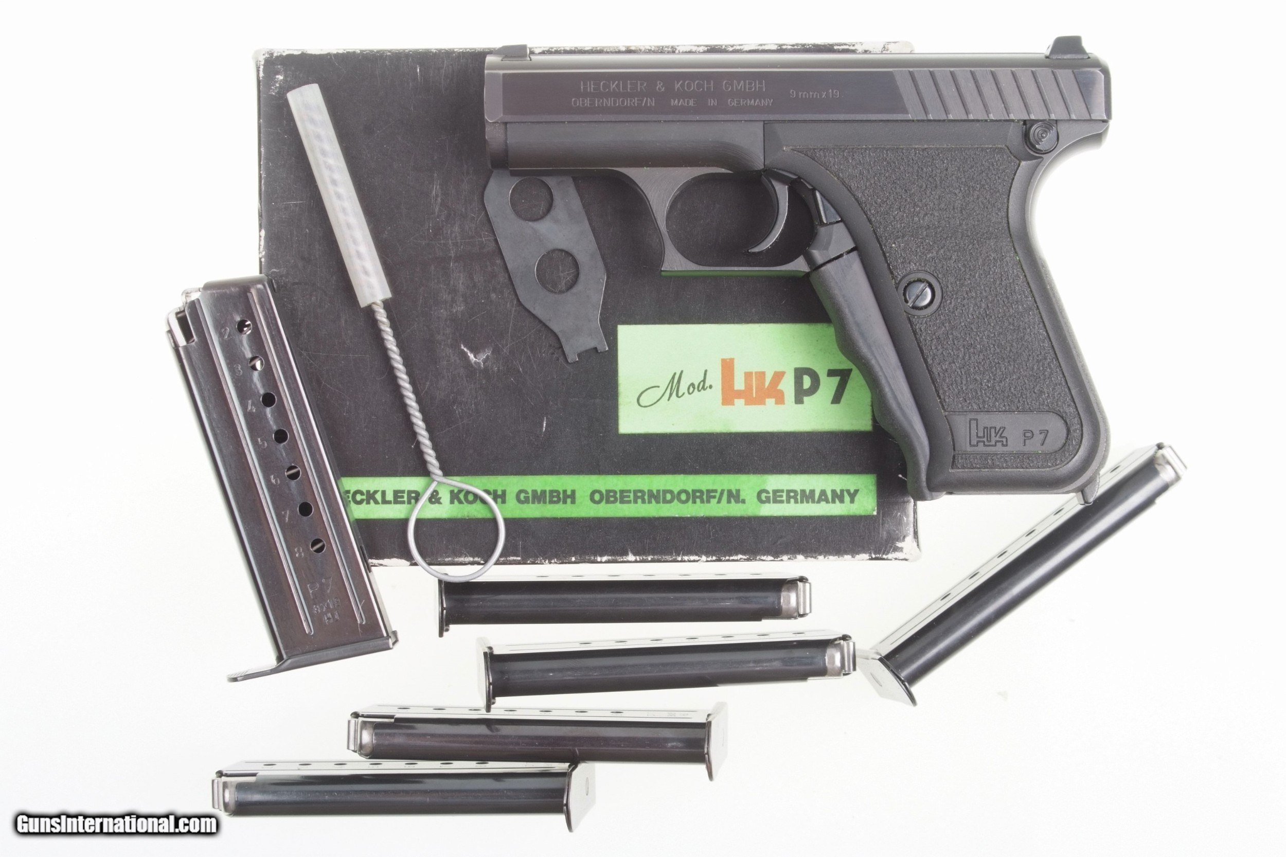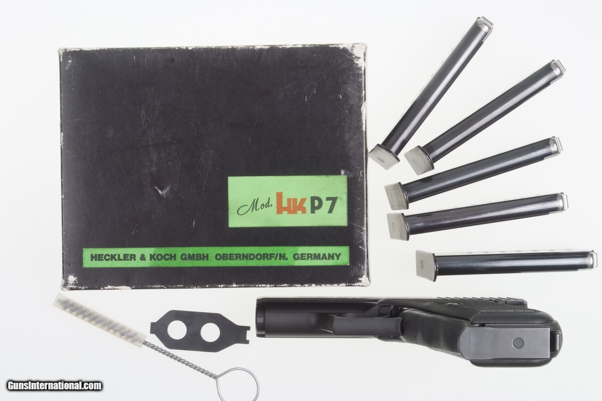 Description: Fantastic H&K P7, as new in original box, with matching test target, instruction booklet, cleaning rod, disassembly tool, and FIVE SPARE MAGAZINES! Standard configuration H&K P7 with 4.1 inch barrel and white-dotted night sights. Left side of slide with company address, model, and caliber. Full serial number on the right side of slide and frame, each suffixed by the E/N proof, the frame additionally marked 1B followed by the antler symbol. Separate textured grips, the left panel marked “HK P7”. Magazines drilled with 7 indicator holes sequentially numbered 2-8, the left side marked “P7 9x19/variously coated ‘IJ’, ‘IB’, ‘HJ’”. Original cleaning brush and disassembly tool. Crisp test target dated 13 November, 1981. Shipping box with matching SN on end label. Condition: Pistol presents as virtually new: no-wear on exposed chamber and no sharp edge wear. Magazines nearly as good. Crisp literature. Cleaning brush still has its original plastic sleeve. Intact box with shelf-worn edges as photographed. An absolutely wonderful P7 with matching test target and box and five spare magazines! A HISTORIC INVESTMENT $3295.00 SOLD Manufacturer: Heckler & Koch |