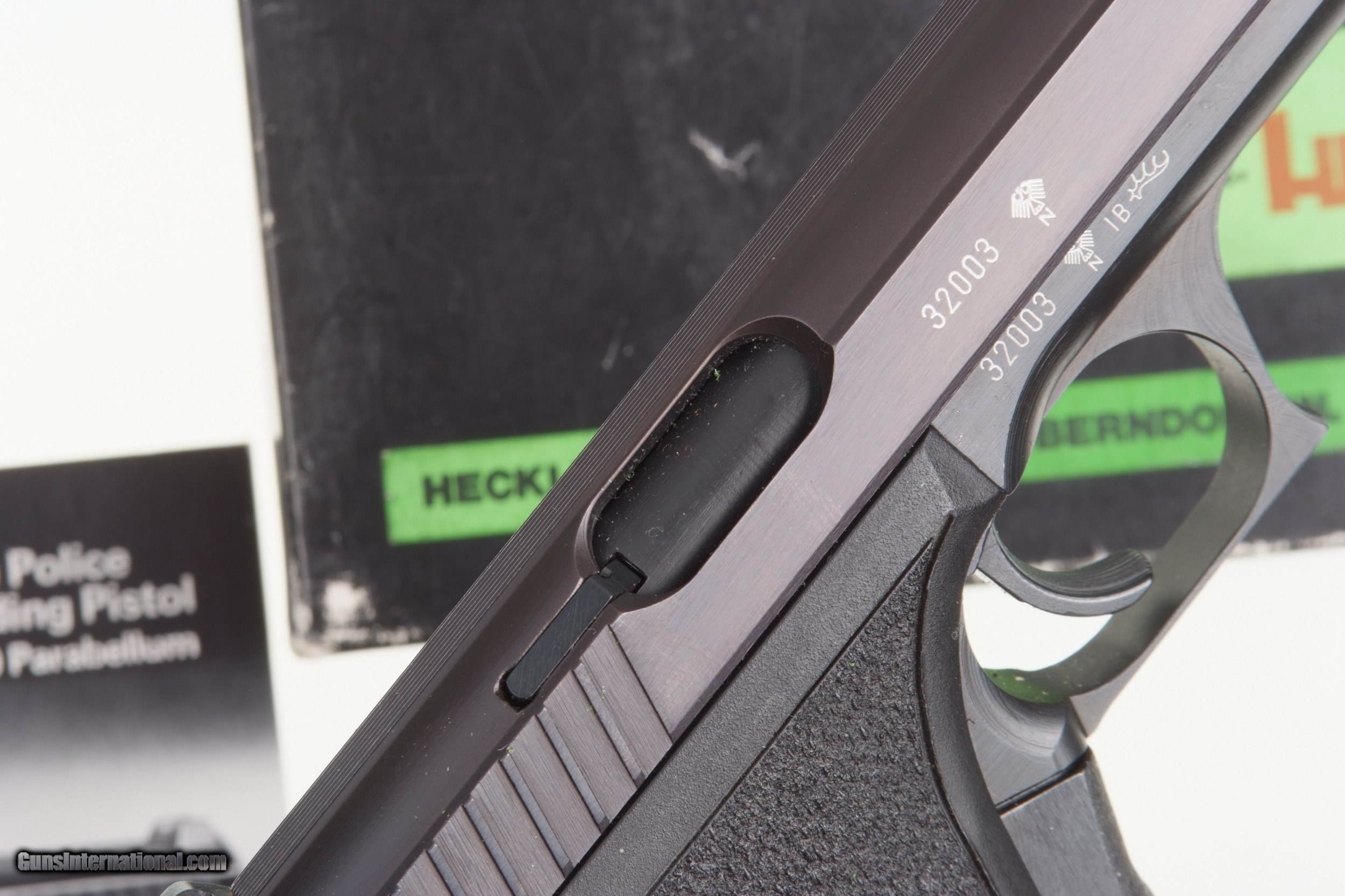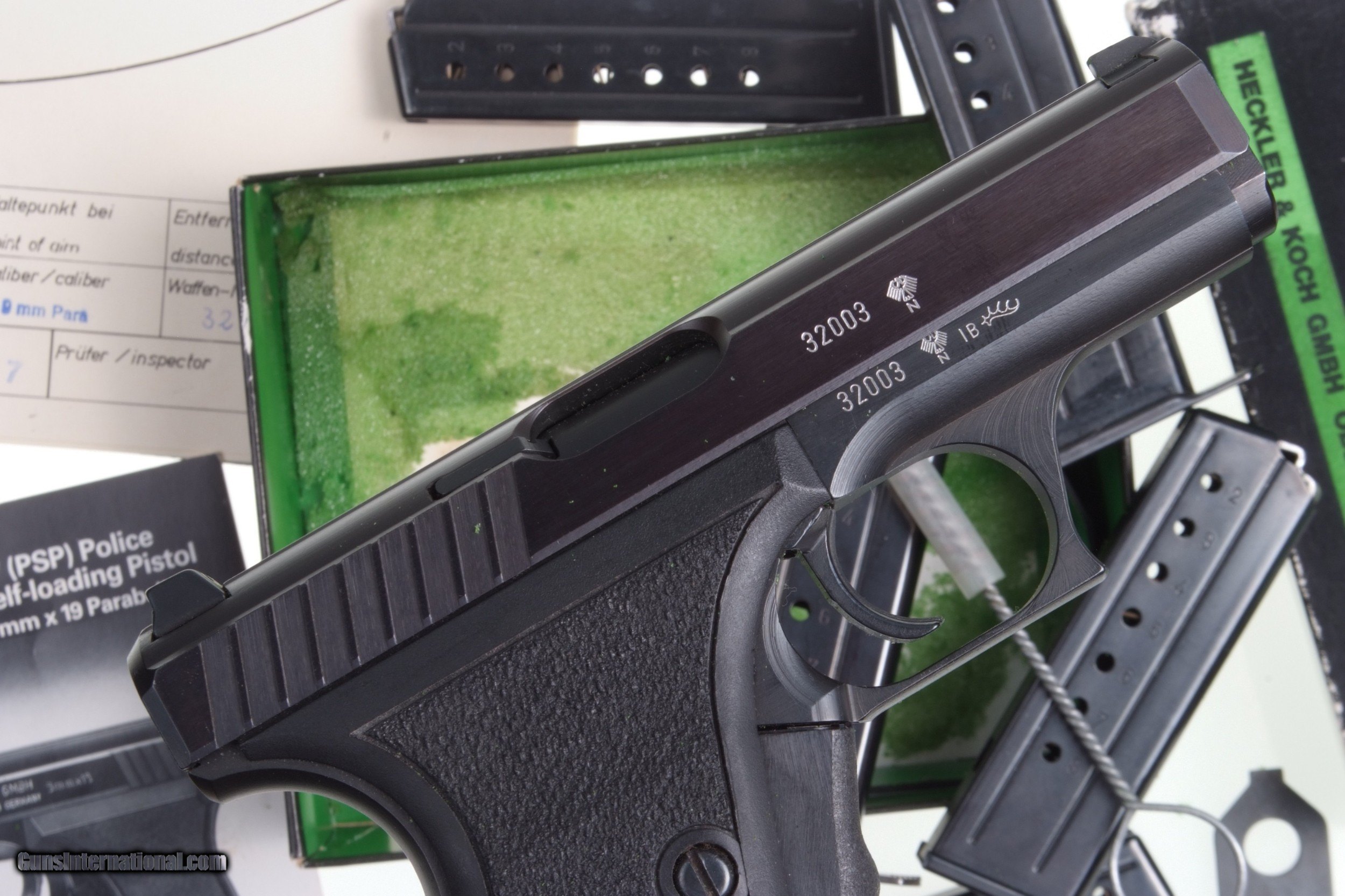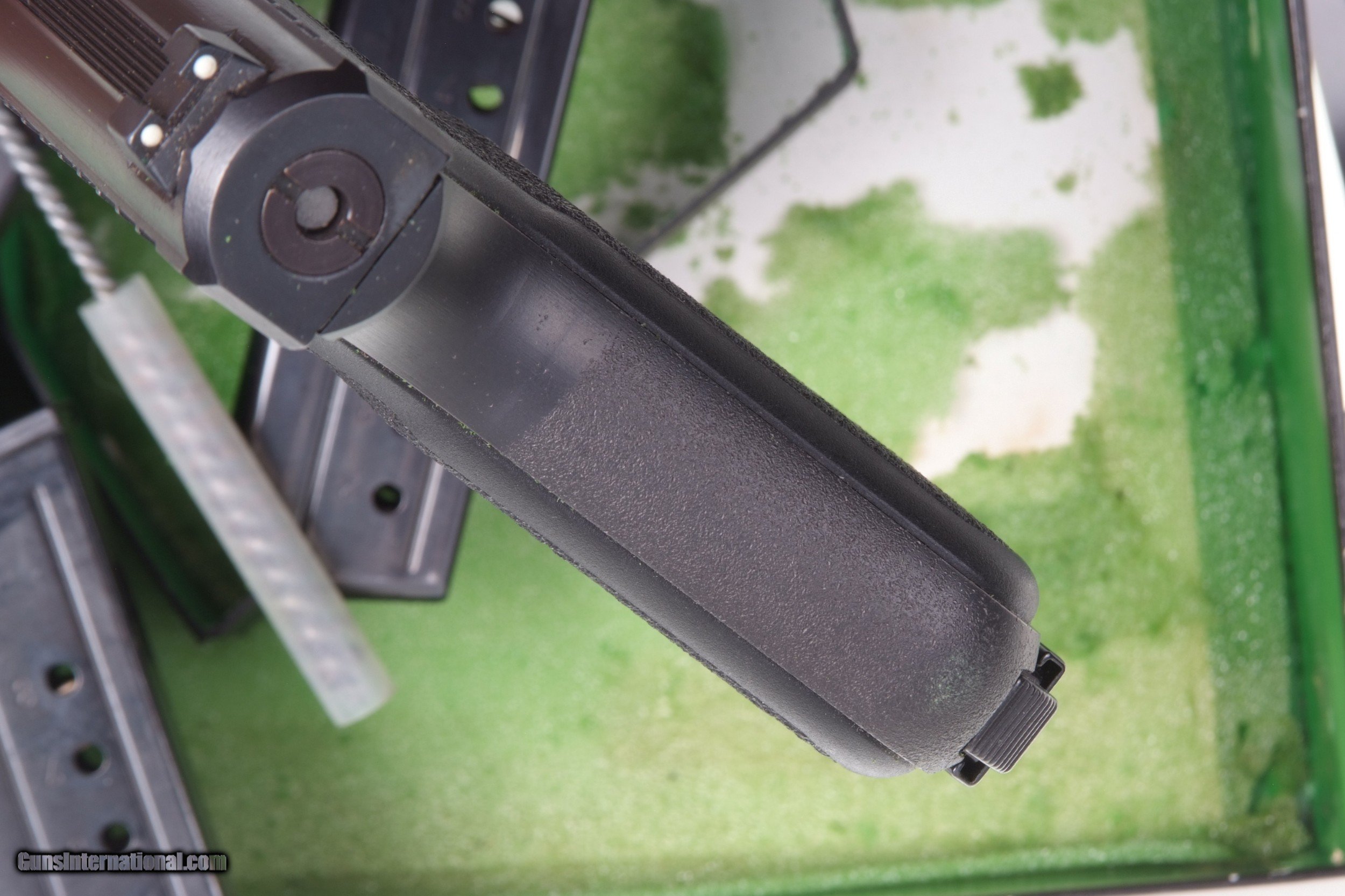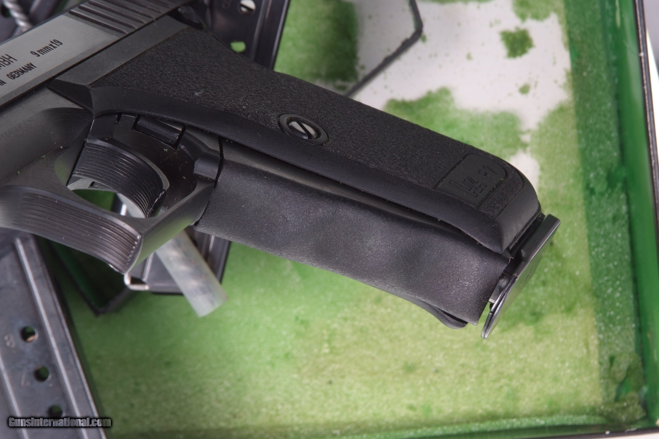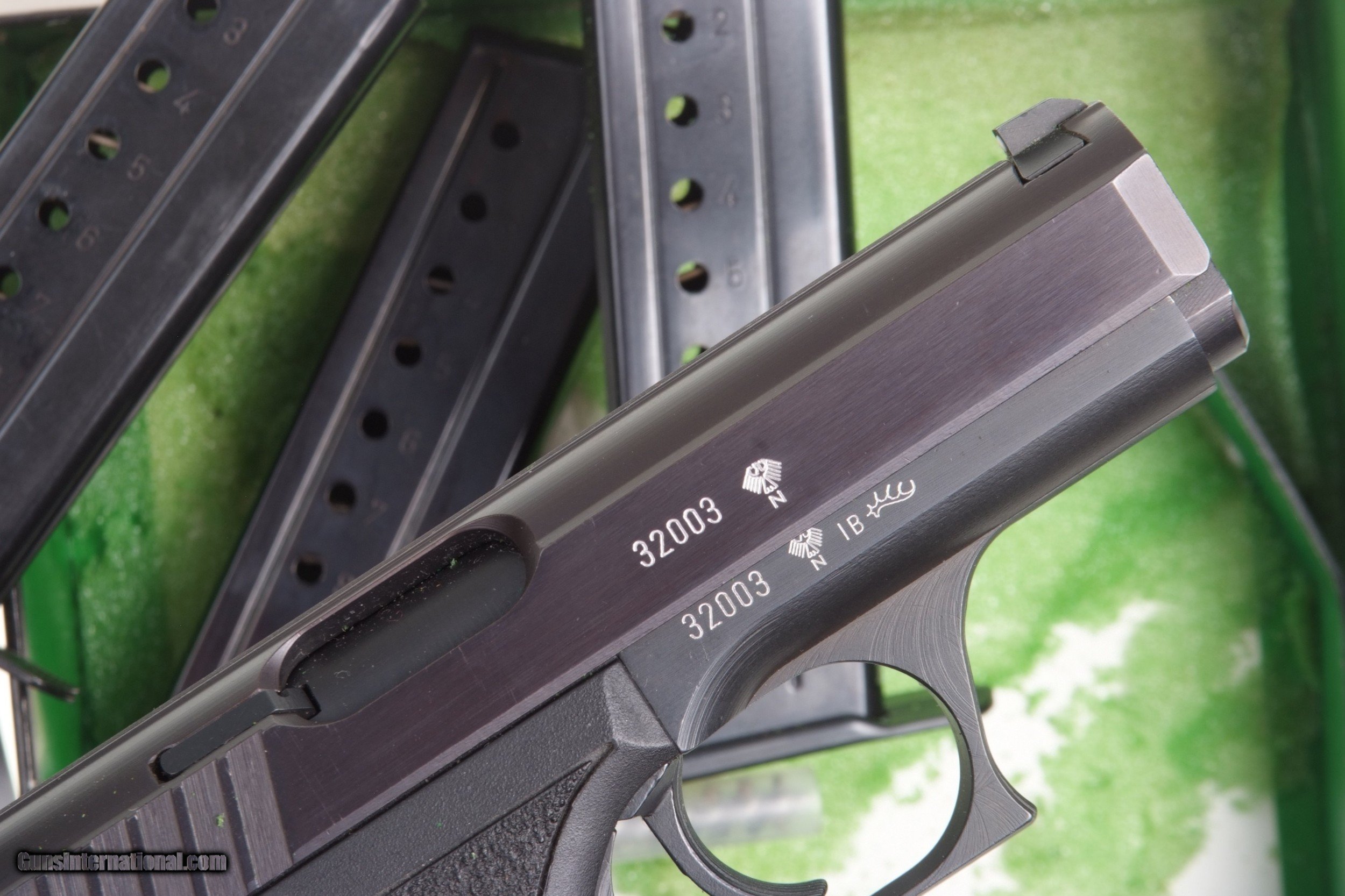 Description: Fantastic H&K P7, as new in original box, with matching test target, instruction booklet, cleaning rod, disassembly tool, and FIVE SPARE MAGAZINES! Standard configuration H&K P7 with 4.1 inch barrel and white-dotted night sights. Left side of slide with company address, model, and caliber. Full serial number on the right side of slide and frame, each suffixed by the E/N proof, the frame additionally marked 1B followed by the antler symbol. Separate textured grips, the left panel marked “HK P7”. Magazines drilled with 7 indicator holes sequentially numbered 2-8, the left side marked “P7 9x19/variously coated ‘IJ’, ‘IB’, ‘HJ’”. Original cleaning brush and disassembly tool. Crisp test target dated 13 November, 1981. Shipping box with matching SN on end label. Condition: Pistol presents as virtually new: no-wear on exposed chamber and no sharp edge wear. Magazines nearly as good. Crisp literature. Cleaning brush still has its original plastic sleeve. Intact box with shelf-worn edges as photographed. An absolutely wonderful P7 with matching test target and box and five spare magazines! A HISTORIC INVESTMENT $3295.00 SOLD Manufacturer: Heckler & Koch |