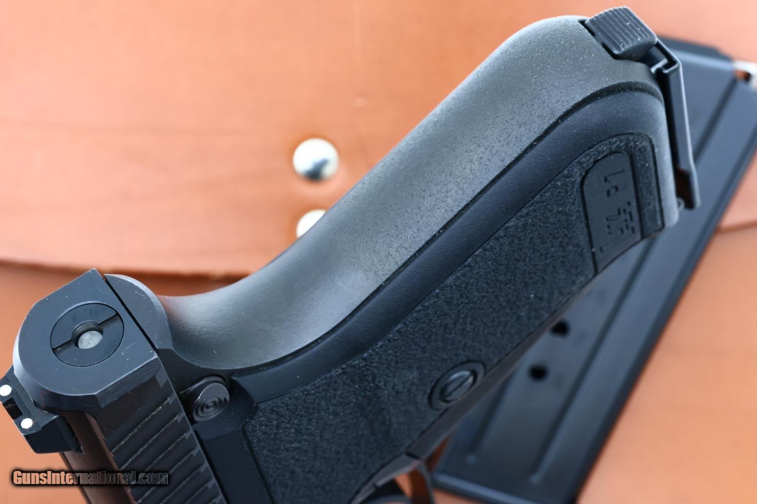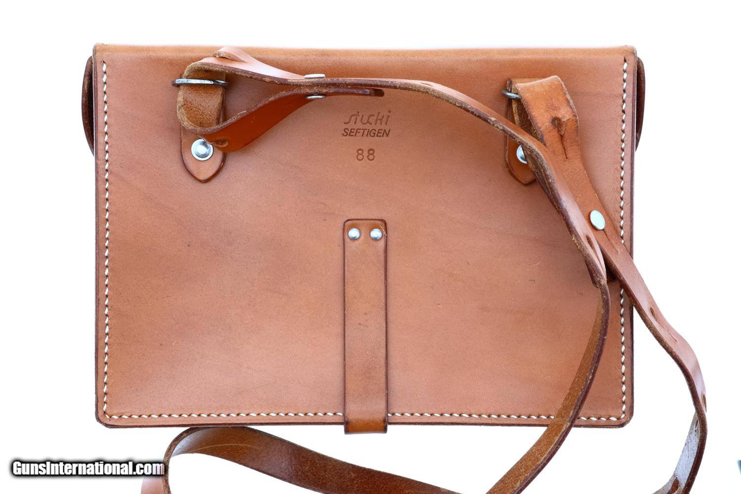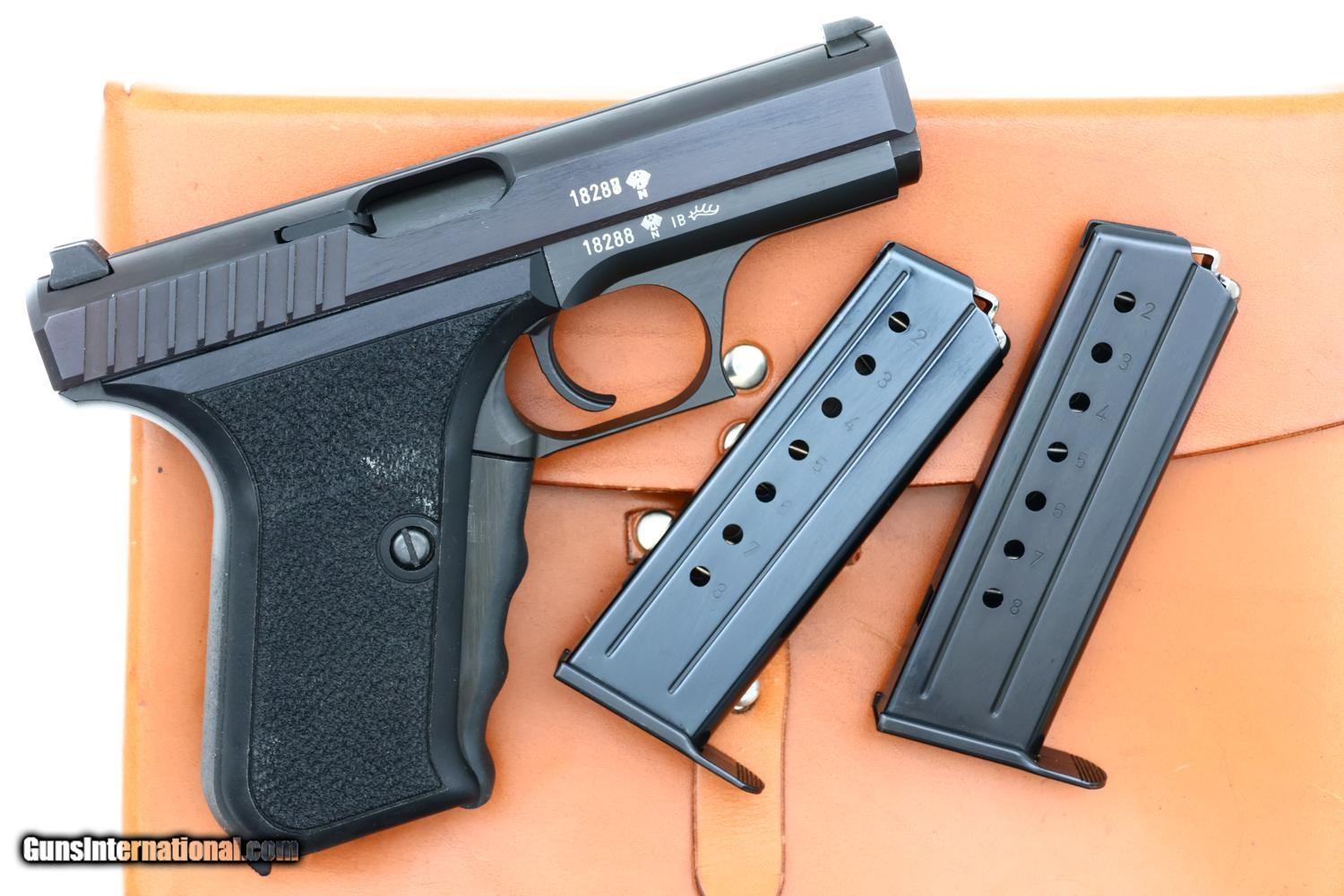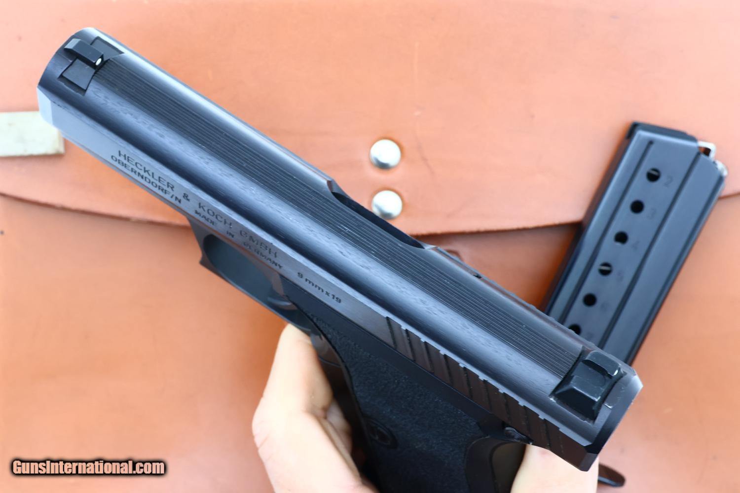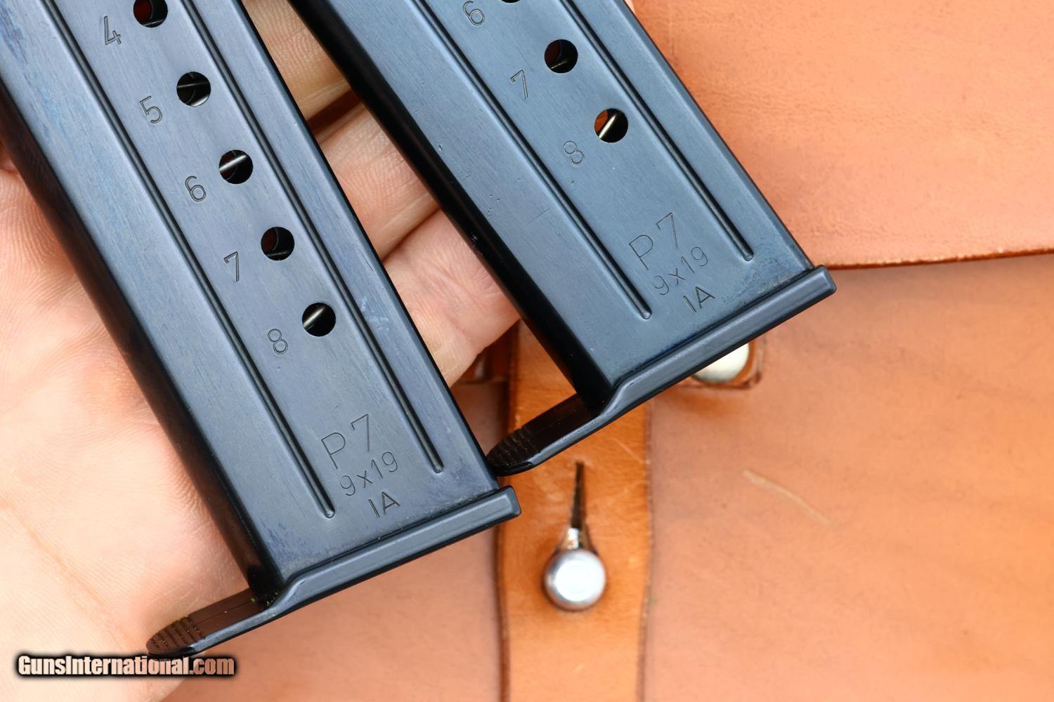 Standard configuration H&K P7 with 4.1 inch barrel and white-dotted night sights. Left side of slide with company address and caliber. Full serial number on the right side of slide and frame along with assembly code of “IB" reflecting proofing of 1981. Separate textured grips, the left panel marked “HK P7”. Bottom magazine release, the magazines drilled with 7 indicator holes sequentially numbered 2-8, the left side marked “P7 9x19", both coded "IA". Complete with holster made by Sickinger and large leather carrying case made by Stucki in Switzerland in 1988.