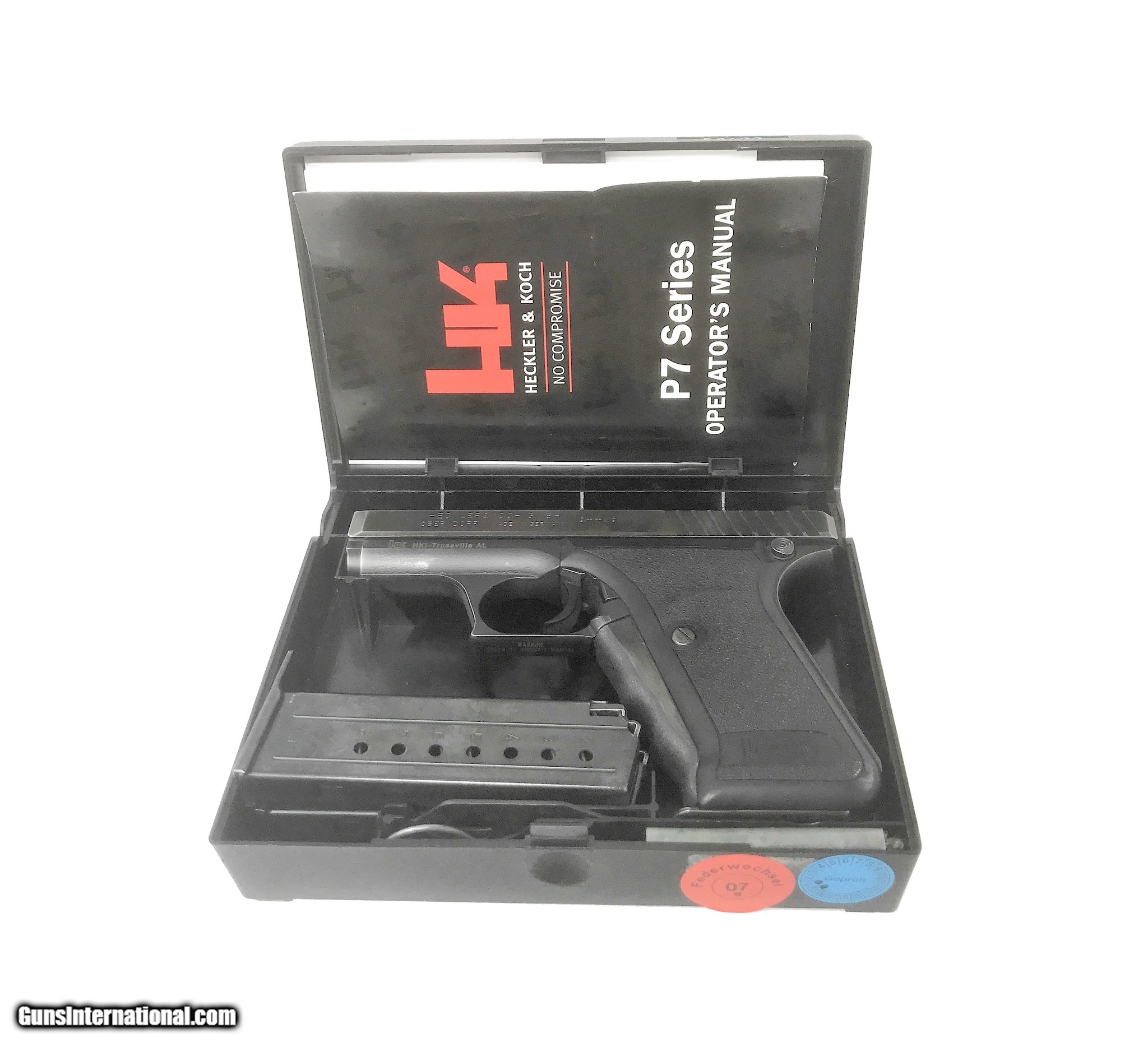 Description: Guns Listing ID: 807656 Manufacturer: Heckler & Koch (HK) Model: P7 Type: Semi Automatic Pistol Caliber: 9mm Serial No.: 58472 Capacity: 8+1 Safety: Finger Grooved Cocking Bar Barrel Length: 4.13\" Front Sight: Fixed Bar With Contrasted Dot Rear Sight: Fixed Notch With Two Contrasted Dots Action: single-action trigger. Grip: Black Frame Finish: Black Overall Length: 6.5\" Weight: 30.4 oz SKU: 22030006 Features: In Original Box Three 8 Rounds Maagazines Two Additional Tools Introduced in the 1970s, the Heckler & Koch P7 was called \"the best combat pistol\" on the market at the time and is a solid collectible pistol today. Although The Heckler & Koch - HK P7 Is Graded As-Used, Is In Very Good Condition, It Has minimal Signs Of Use, (See Photos), If you have any questions do not hesitate to ask or request more photos. SOLD Manufacturer: HECKLER & KOCH Model: HK P7 Caliber Info: 9MM LUGER (9X19 PARA) Condition: Used - Non-Certified Barrels: 4.13 BARREL Finish: BLACK |