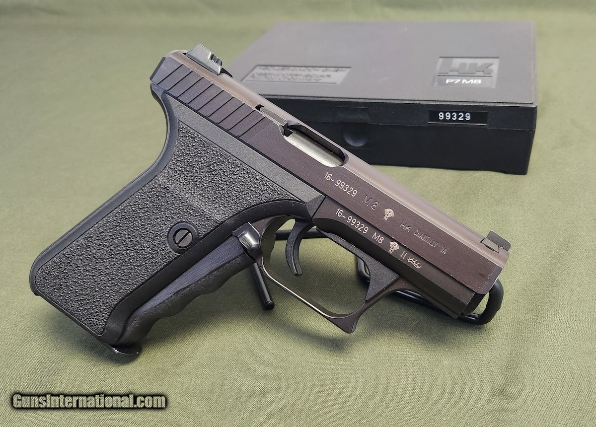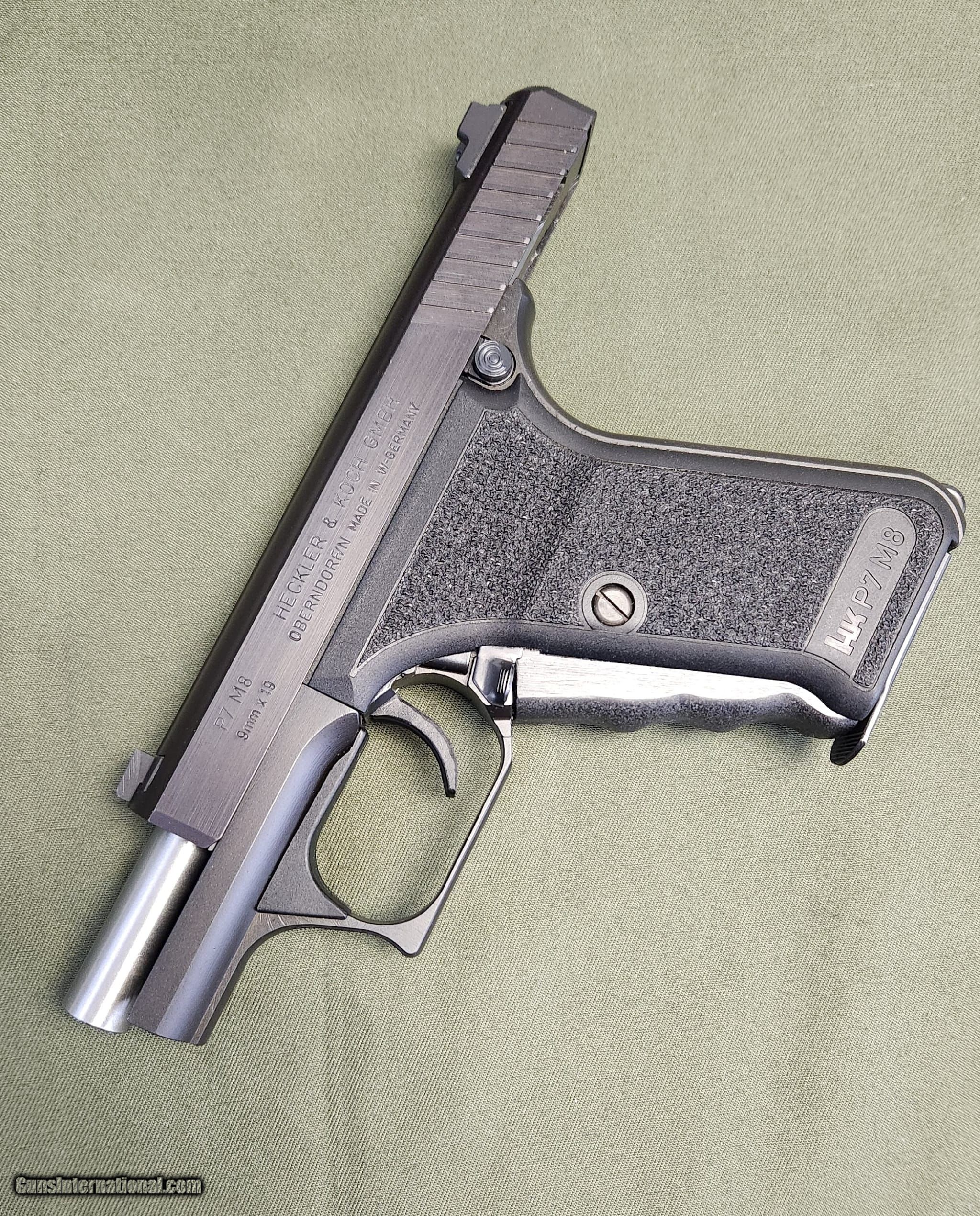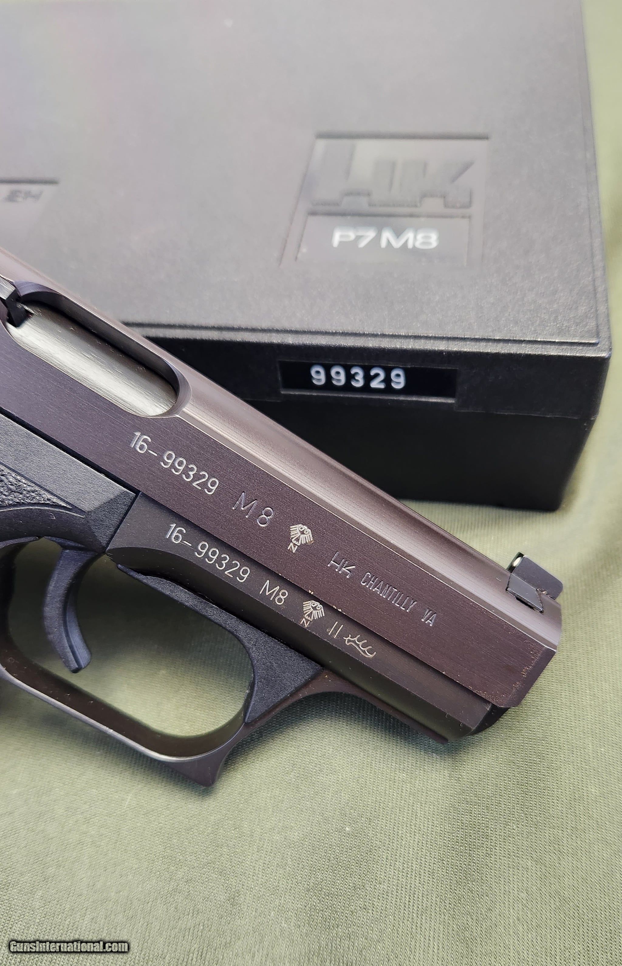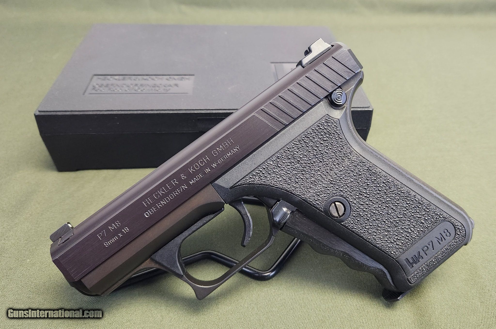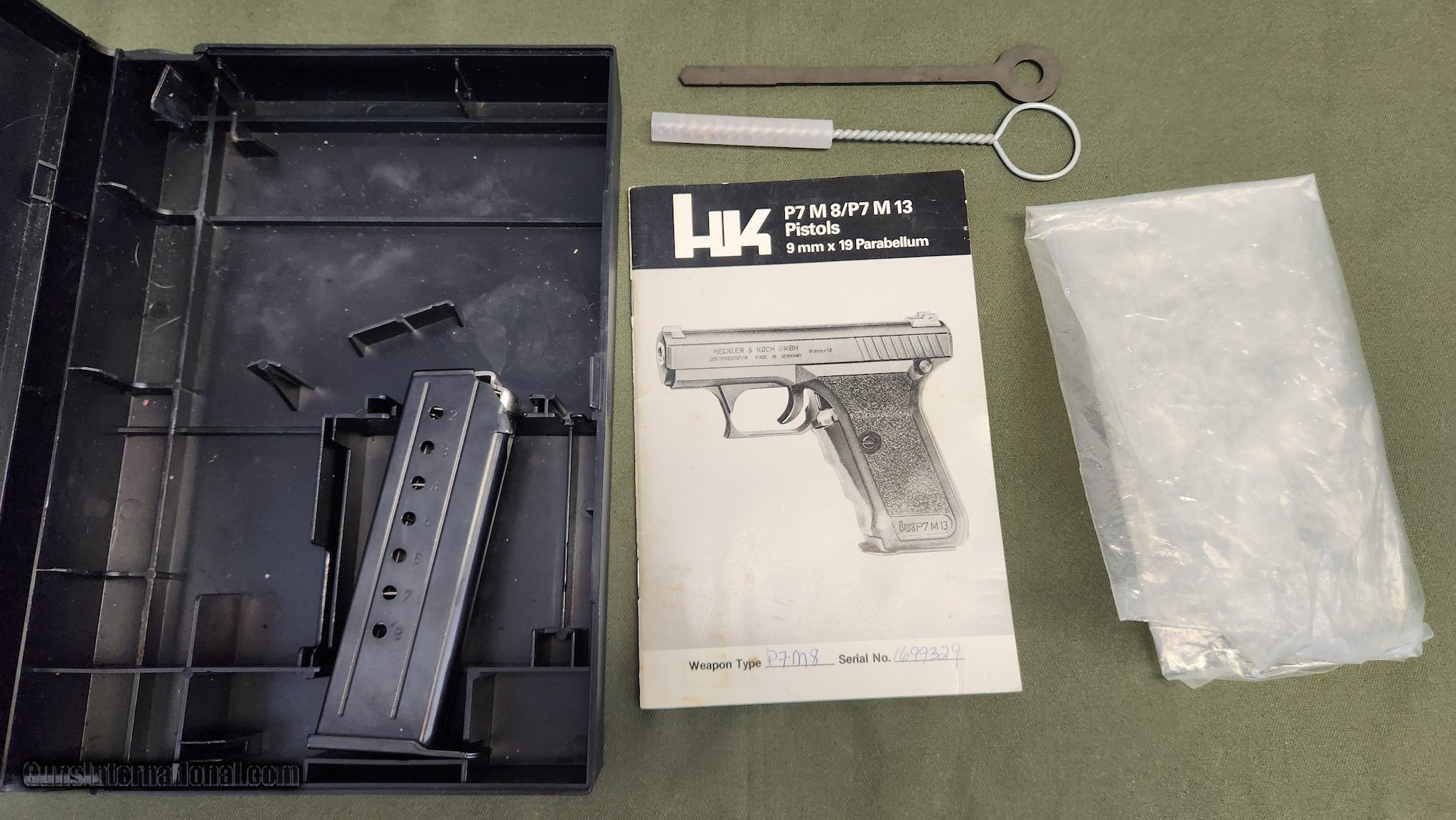 Description: Guns Listing ID: 654085 H&K P7M8 9mm, Chantilly, VA import. The P7M8 features a unique gas-piston/blowback operation as well as a squeeze cocking mechanism on the grip that cocks/decocks when squeezed/released and also serves as a safety. This system creates a nice, short and light weight trigger pull. Made in West Germany. The date code \"II\" indicates a manufacture date of 1988. Includes original, serialized box, owner‚‚s manual, cleaning tools and two magazines (even has the plastic gun wrap). This would make an excellent addition to any firearm collection SOLD Manufacturer: HECKLER & KOCH Model: HK P7M8 Chantilly Caliber Info: 9MM Condition: Used - Non-Certified Barrels: 4 BARREL Finish: BLACK |