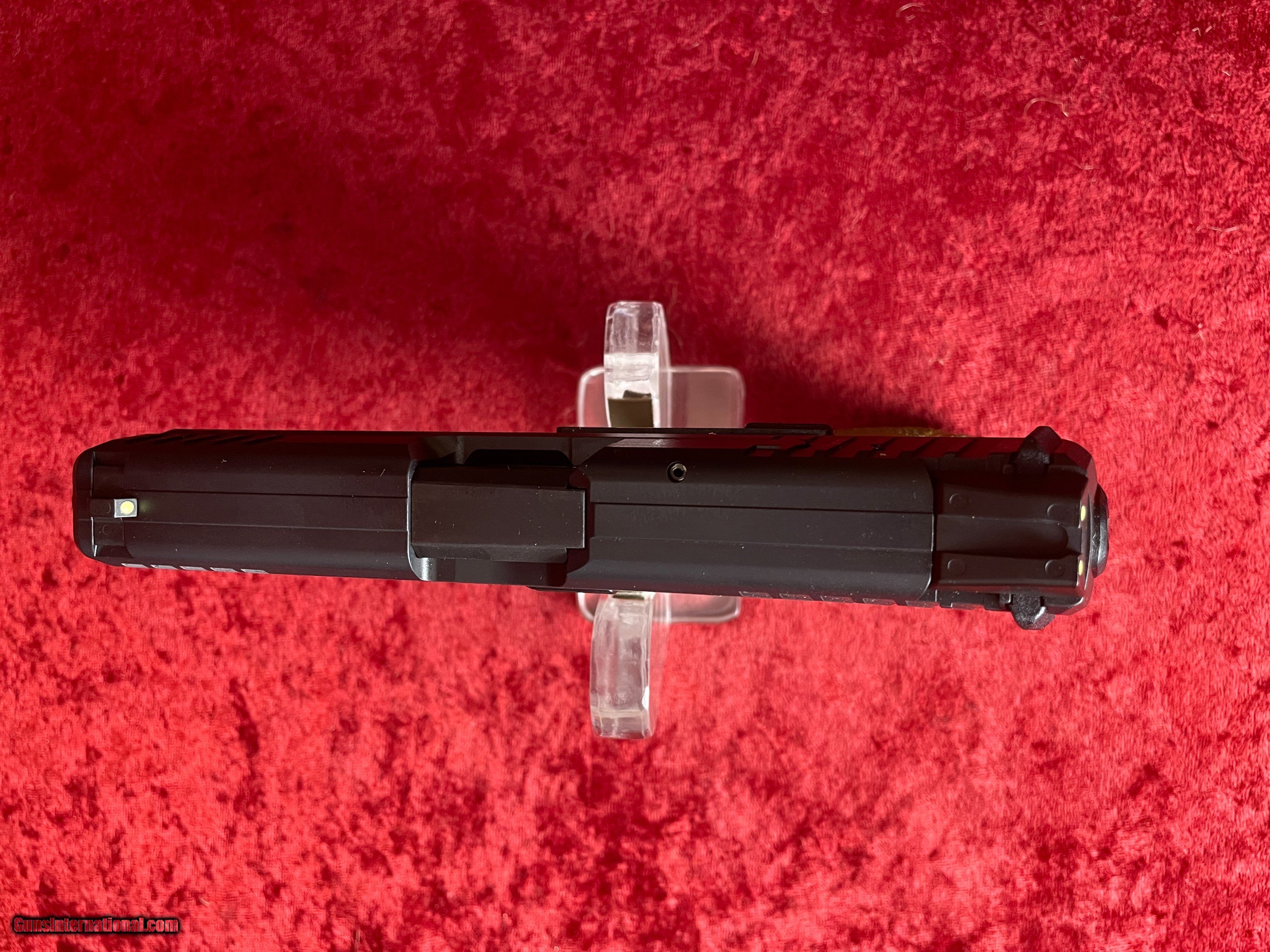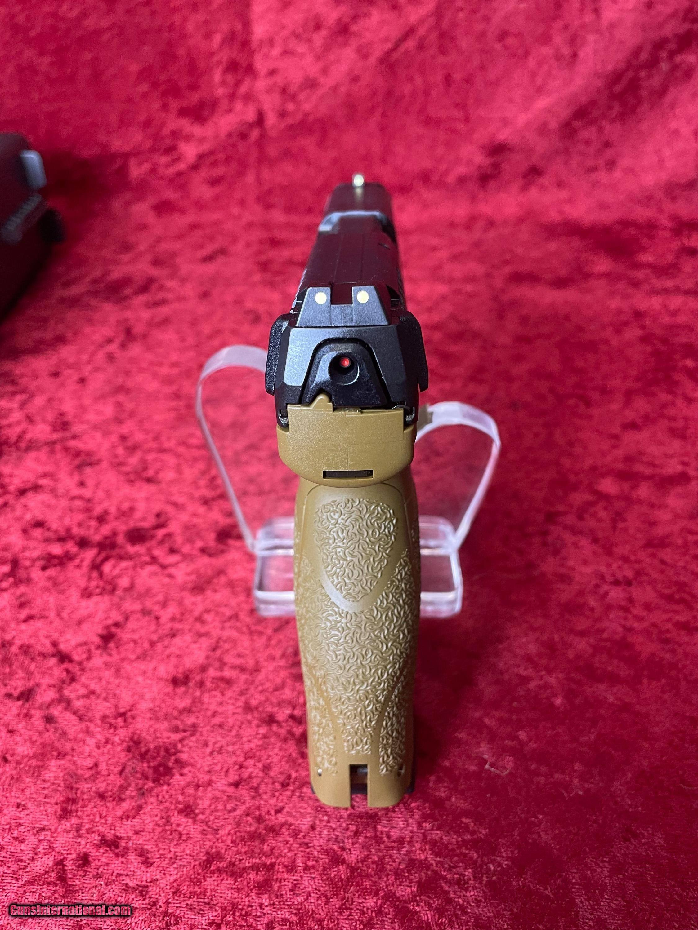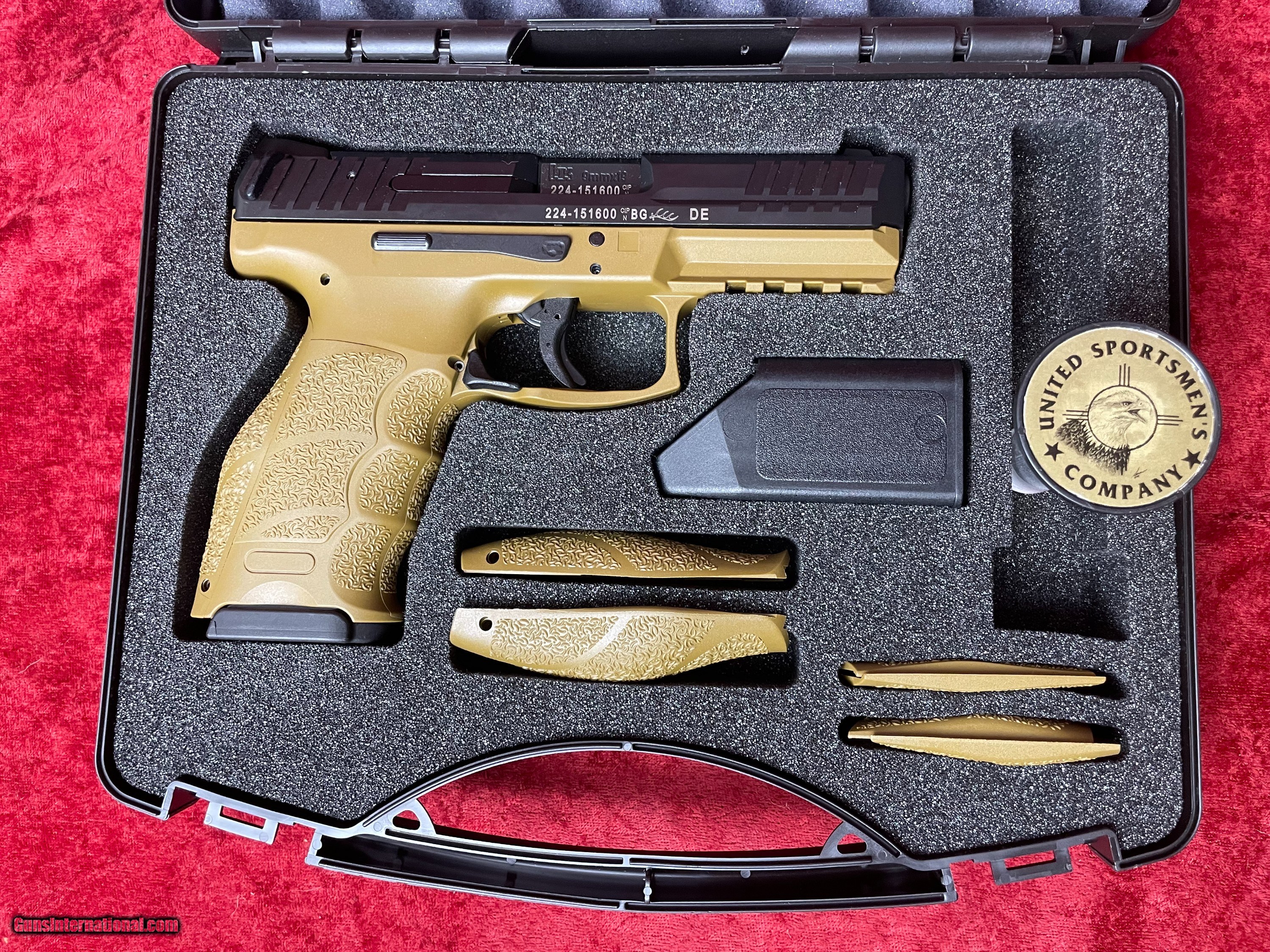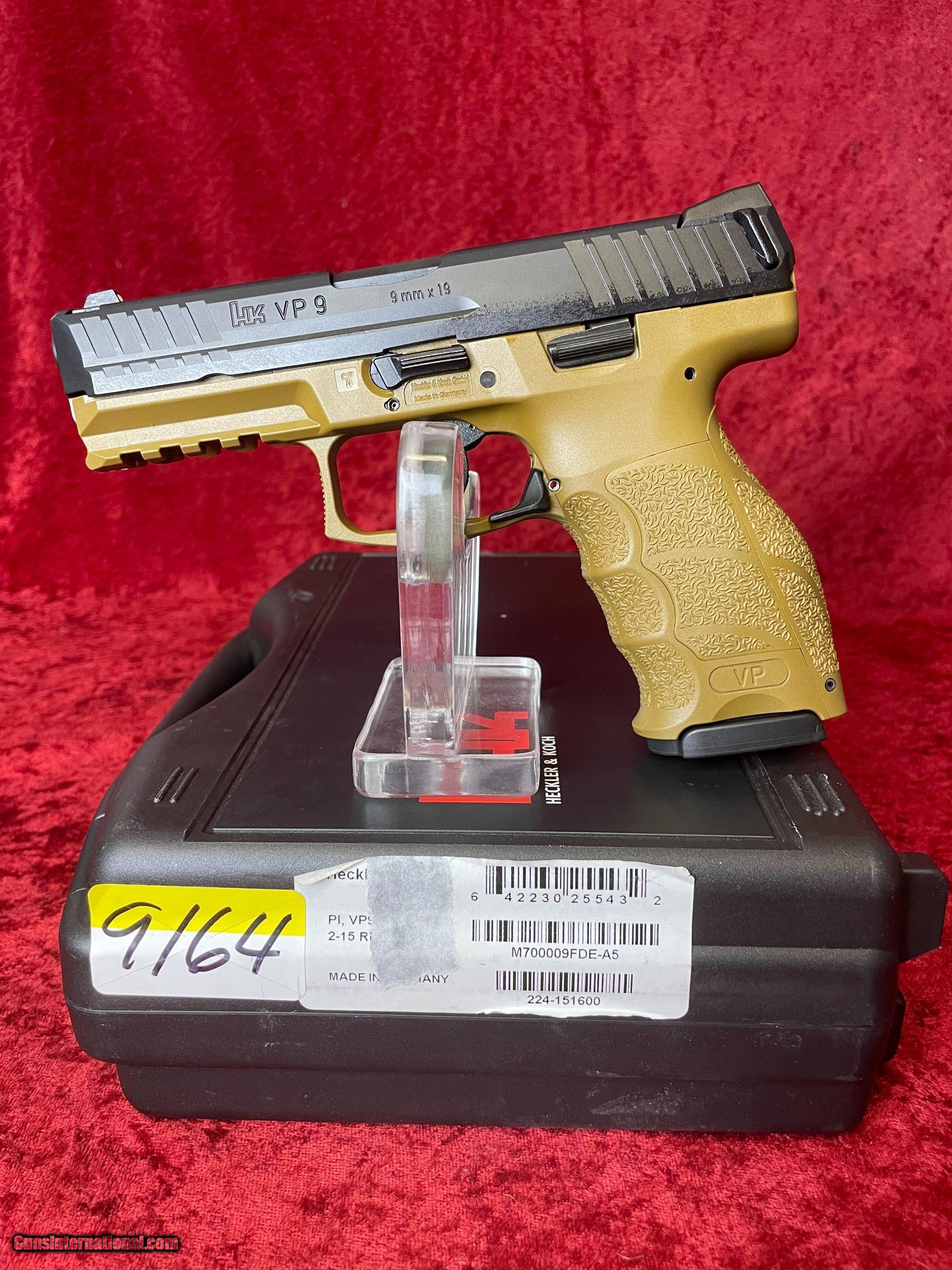 Description: HK VP9 9mm semi-auto pistol 4.09" bbl Black/FDE frame w/rail This pistol is Like NEW in the box (Appears unfired--NO Manual included) The VP Series integrates a striker firing system with an enhanced, HK "light pull" trigger. HK's cold hammer-forged barrel made from cannon grade steel ensures long service life, as does the polygonal bore profile which also provides a slight increase in muzzle velocity. Molded finger grooves in the pistol's grip position an operator's hand for optimal shooting. An extended Picatinny MIL-STD-1913 rail molded into its polymer frame for mounting lights and accessories. All controls are completely ambidextrous. A unique VP feature is HK's patented rear-mounted charging supports on each side of the slide provide better gripping leverage for racking the slide rearward. The machined steel slide is protected from corrosion and wear by HK's hostile environment finish and all metal components, including springs and pins have superior metallurgy. VP pistols use proven HK P30 steel magazines. Includes one 15-rd magazine, two additional backstraps and two additional sets of lateral grip plates.