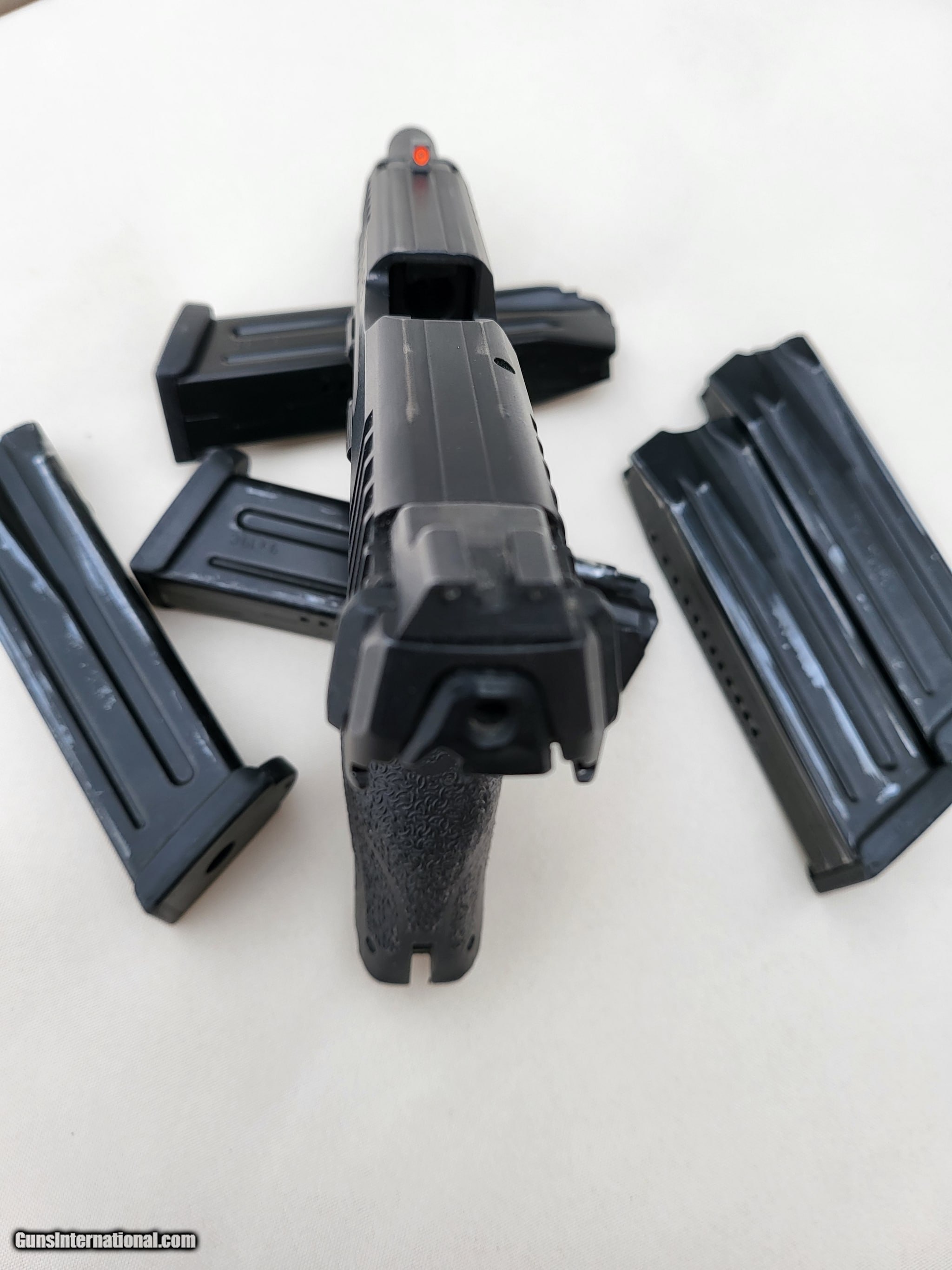 Description: Guns Listing ID: 487222 Heckler & Koch VP9 LE 9mm Luger 4.09\" Barrel, 15+1 Capacity, Overall Black Finish, Picatinny Rail Frame, Serrated Steel Slide & Finger Grooved Interchangeable Backstrap Grip, Paddle Mag Release, Includes 5 Mags and upgraded Trijicon Night Sights. Made in Germany! Good gun, barrel in good shape with grooves visible. Well maintained but has some exterior blemishes from duty use. SOLD Manufacturer: HECKLER & KOCH Model: HK VP9 LE Caliber Info: 9 MM LUGER Condition: Used - Non-Certified Barrels: 4 BARREL Finish: BLUE STEEL |