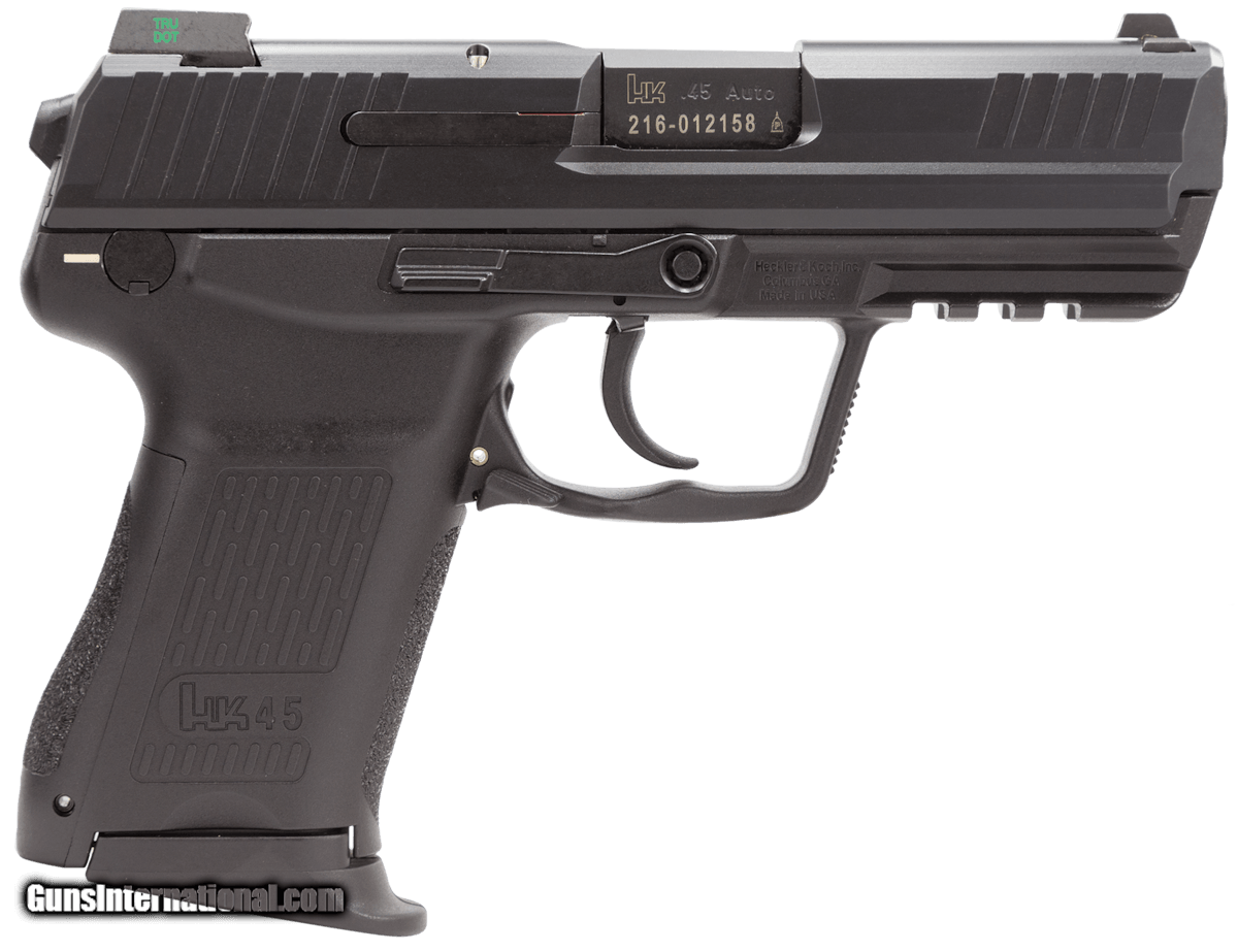 Description: Guns Listing ID: 1554 The Heckler Koch HK45 Compact is a semi-automatic handgun that is .79 shorter and 2.72 oz lighter than the full-sized HK45. This ergonomic pistols polymer frame sports interchangeable grip panels. Additional features include cold-hammer forged steel 3.94 barrel with polygonal rifling contoured and radiused slide low profile adjustable three dot sights picatinny rail ambidextrous controls including an extended slide release and internal mechanical recoil reduction system. Additionally the HK45 Compact has a more conventional straight grip as opposed to the full-sized HK45s grooved one. Details HK 745037LEA5 HK45C Compact V7 DAO 3Mags 45ACP 3.9 81 Syn Grip Black SOLD Manufacturer: HECKLER & KOCH Model: HK45C COMPACT Caliber Info: 45 ACP Condition: new |
