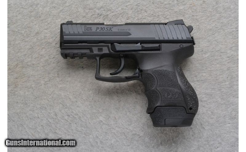 Description: This Heckler & Koch Model P30 SK is a right hand double action semi-auto sub-compact pistol in 9mm Cal. It has a 3.25 inch barrel with a front and rear serrated slide. A blade front sight and notch rear sight with 3 dot enhanced luminous night sights. The grip is a textured black polymer with finger grooves and interchangeable back strap and side panels. It has an ambidextrous magazine release and lower accessory rail. 9mm Parabellum SOLD Chambers: 13 round and 10 round magazines. Metal Condition: Excellent. Bore Condition: Excellent. Barrels: 3.25 inch barrel. Triggers: Double Action. Weight: 24 oz. Sights: Blade front. Notch rear. 3 dot enhanced luminous night sight. Item Location: Richfield, WI |