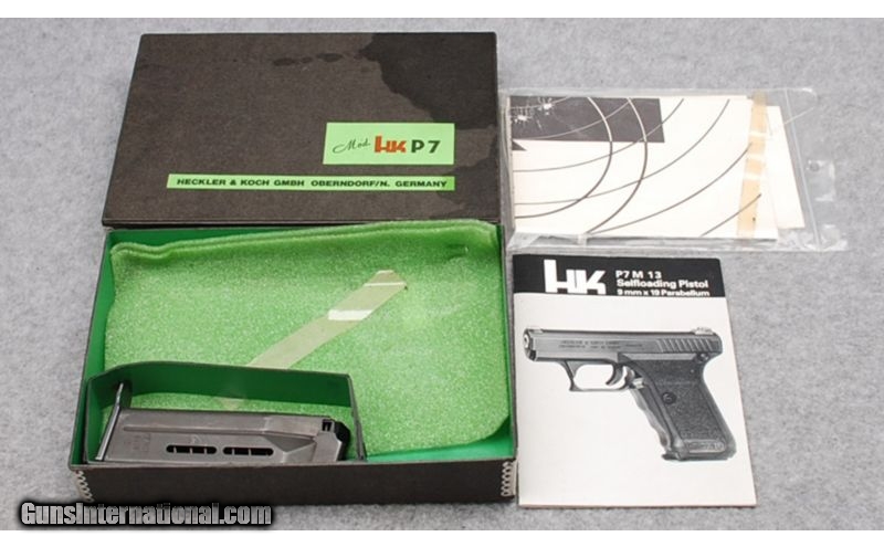 Description: This is a Heckler & Koch P7M13 pistol in 9mmx19. This pistol is in Very Good to Excellent condition showing a few handling marks on the slide and the edges of the frame. The bore is shiny. This pistol comes with the Heckler & Koch factory box that contians an extra magazine, the factory manual, and the test target. SOLD Caliber Info: 9mmx19 Metal Condition: Very Good to Excellent with light handling marks Bore Condition: Bright and Shiny Barrels: 4 Sights: Factory 3 Dot sights Extras: Comes with factory box including extra magazine, manual and test target Item Location: Reno, NV |