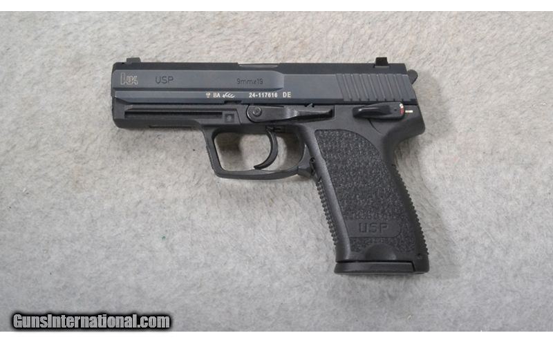 Description: This Heckler & Koch Model USP is a double action right hand semi-auto pistol in 9mm Cal. It has a 4 inch barrel with a rear serrated slide. A blade front sight and notch rear sight with 3 white sight dots. The grip is a textured black polymer. It has a lower accessory rail and a trigger guard magazine release. 9mm Parabellum SOLD Chambers: 15 round magazine. Metal Condition: Excellent. Bore Condition: Excellent. Barrels: 4 inch barrel with a rear serrated slide. Triggers: SA/DA Weight: 26 oz. Sights: Blade front. Notch rear. 3 white sight dots. Item Location: Richfield, WI |