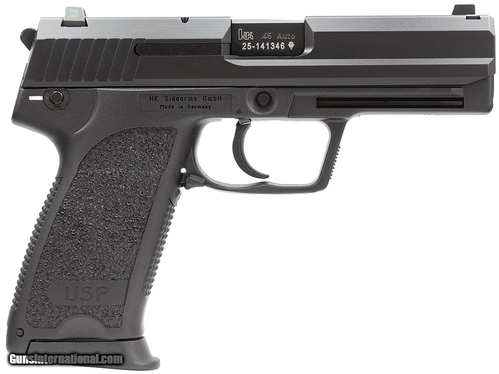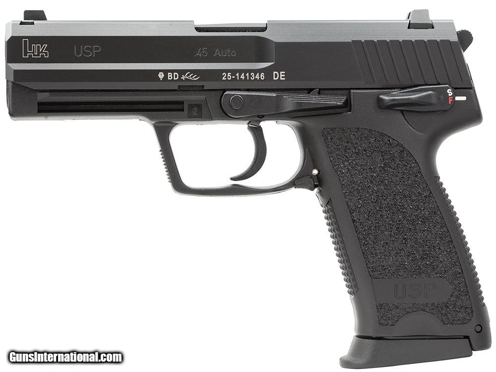 Description: Guns Listing ID: 820 The Heckler Koch USP (Universelle Selbstladepistole or universal self-loading pistol) is a short-recoil semi-automatic pistol. Its mechanical recoil system buffers its slide and barrel lowering recoil by up to 30. The USP features a cold hammer forged barrel with polygonal bore profile machined nitro-carburized steel slide with extended release fiber-reinforced polymer frame lock-out safety and ambidextrous magazine release. The USP can be converted to any of nine different firing modes and several variants are available with different features and barrel lengths. Details Caliber .45 ACP - Capacity 10rds - Barrel 4.41 - Sights Fixed - Action DASA - Frame Black Polymer - Slide Blued Steel - Length 7.87 - Width 1.26 - Height 5.55 - Weight 1.96 lbs (unloaded) - Additional Features Corrosion proof fiber-reinforced polymer frame - Polygonal bore profile for increased velocity easier cleaning and longer barrel life - Can be converted to any of nine trigger firing modes - Corrosion resistant Hostile Environment blued finish - Oversized trigger guard for use with gloves - One piece machined slide made from nitro-carburized steel - Universal mounting grooves for installing accessories - Ambidextrous magazine release lever - Extended slide release - Patented Lock-Out Safety device Part No. 704501-A5, UPC 642230244535 – USP45 (V1) DA/SA, safety/decocking lever on left, two 10rd magazines SOLD Manufacturer: HECKLER & KOCH Model: USP45 V1 Caliber Info: .45 ACP Condition: new Barrels: 4.4 BARREL |