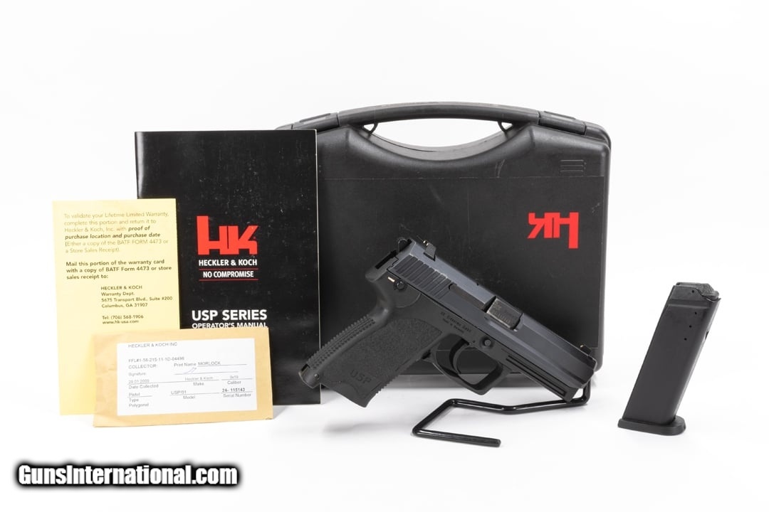 Description: Guns Listing ID: 1371018 Heckler & Koch HK USP V1 9mm 15+1 DA/SA w/ Case, Mfd 2009 Manufacturer: Heckler & Koch (HK) Model: USP9 V1 Condition: Very good Caliber: 9x19mm Action: DA/SA Barrel Length: 4.25\" Overall Length: 7.68\" Capacity: 15+1 Features: Full size, right-handed manual safety with decocker, ambi paddle-style mag release, 3-dot sights (not night), accessory rail Notes: Made in Germany. Manufacture date is 2009. Inventory: Firearm, (1) 15-rd polymer magazine, original hard case, manual. • Please be aware that we have not test fired this gun. Unless otherwise stated, expect this firearm to fire and function safely. SOLD Manufacturer: HECKLER & KOCH Model: USP9 V1 Caliber Info: 9MM LUGER (9X19 PARA) Condition: Used - Non-Certified Barrels: 4.25 BARREL Finish: BLACK |