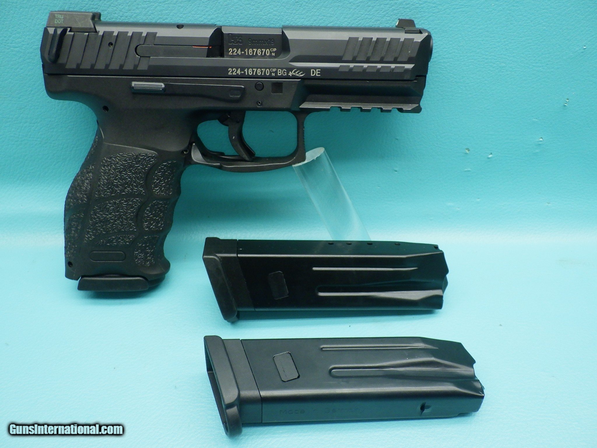 Description: Make: Heckler & Koch Model: VP9 Finish: Black Caliber: 9x19mm Action: Semi automatic Barrel length: 4 inch Bore: Shiny with sharp rifling Grips: Textured polymer Sights: 3 dot night MFG Date: 2016 (Date code BG) Features: Ambidextrous controls, lightweight polymer grip frame with backstrap interchangeability, double action only firing, cold hammer forged barrel, machined steel slide with front & rear serrations, "light pull" trigger with safety, firing pin indicator, extended Picatinny rail, and three factory 10 round magazines. Extras: None Condition: Great shape Shipping Cost: $25.00 Tech: JT1924.549 The pistol functions as it should with a smooth action and strong ejection. Please refer to the photos for the overall condition. FFL is required. No handgun sales in MA. SOLD Handgun Caliber: 9x19mm Parabellum (9mm Luger, 9x19mm NATO) Manufacturer: Heckler & Koch Model: VP9 Serial Number: 224-167670 |