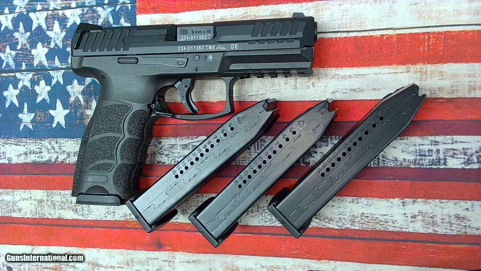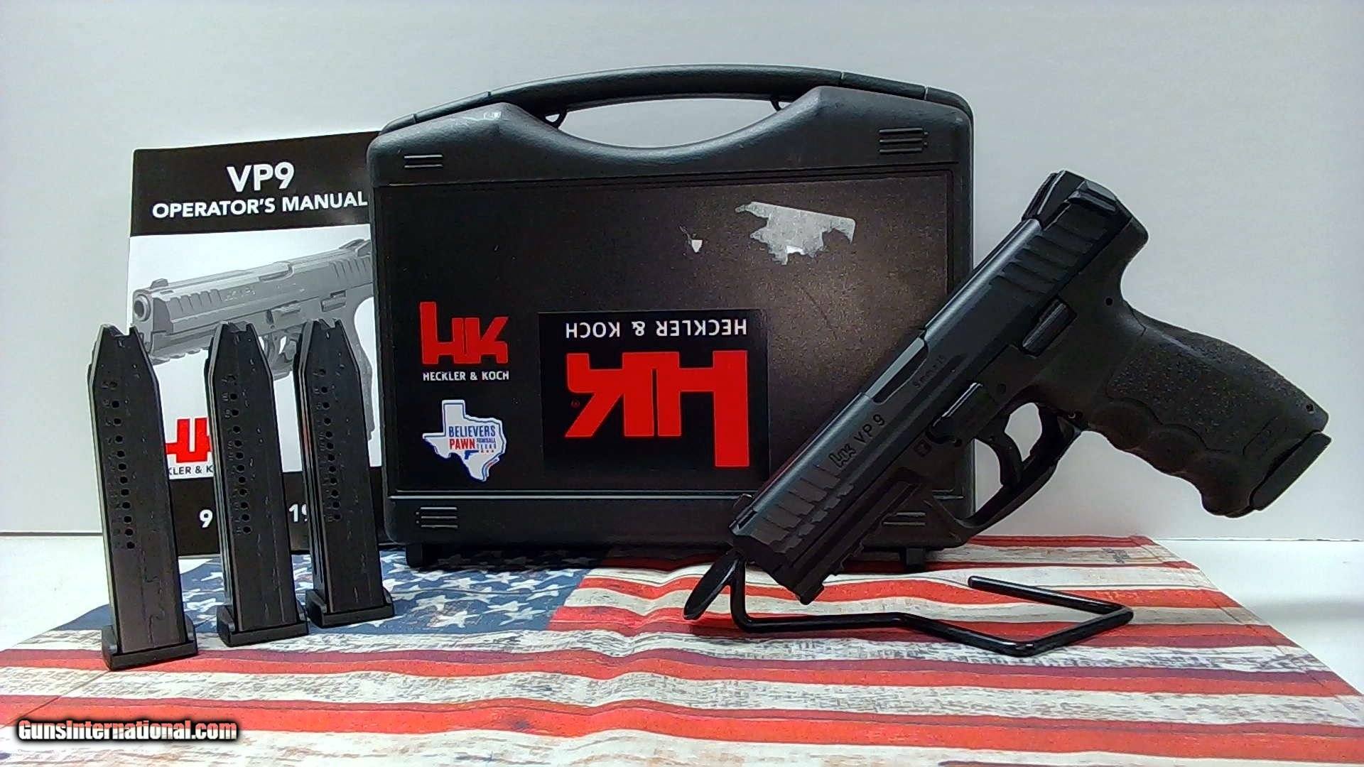 Description: Guns Listing ID: 523729 Pre-owned H&K VP9 in very good condition. This pistol has been well taken care of. The action is tight, the bore is clean and the finish is in near perfect condition. Includes original hard case and four 15 round magazines. Blue Book Description: 9mm Para. cal., SFO, polymer frame, 4.09 in. cold hammer forged barrel, 15 round steel mag., machined steel slide, enhanced HK \"light pull\" trigger, fixed 3-dot luminous, ergonomic handgun grip, molded finger grooves, trigger has safety latch, ambidextrous controls, extended Picatinny rail, cock firing pin indicator, features patented charging supports (components mounted on each side of slide to provide better gripping leverage), front and rear slide serrations, black, 1.6 lbs. Mfg. in Oberndorf, Germany (mfg. 2014-2020) These photos represent the exact firearm for sale. As with many used firearms, this item may contain scratches and/or signs of wear. This is not always the case but should not be unexpected. SOLD Manufacturer: HECKLER & KOCH Model: VP9 Caliber Info: 9MM LUGER (9x19 PARA) Condition: Used - Non-Certified Barrels: 4.09 Action: SEMI AUTOMATIC Finish: black |
