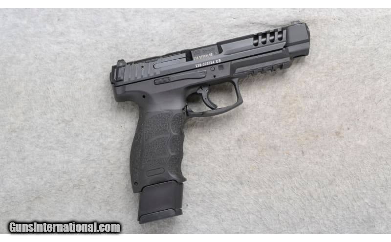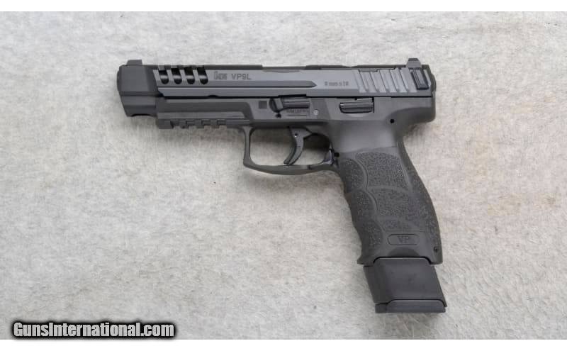 Description: This Heckler & Koch Model VP9L is a right hand semi-auto pistol in 9mm Cal. It has a 5 inch barrel with a rear serrated slide. A blade front sight with a luminous sight dot and notch rear sight with sight dots. The grip is a textured black polymer with finger grooves. It has a lower accessory rail and loaded chamber indicator. The magazine release is in the trigger guard. 9mm Parabellum SOLD Chambers: 20 round magazine. Metal Condition: Excellent. Bore Condition: Excellent. Barrels: 5 inch barrel with a rear serrated slide. Weight: 28 oz. Sights: Blade front with a luminous sight dot. Notch rear with sight dots. Item Location: Richfield, WI |