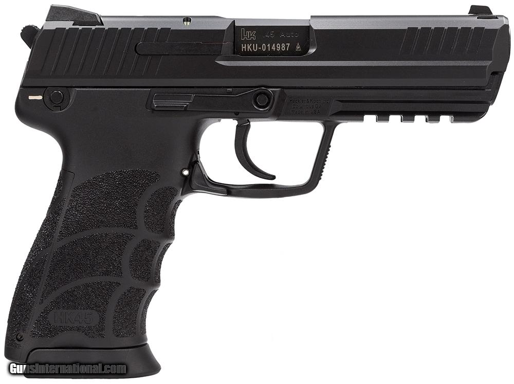 Description: Guns Listing ID: 285515 The HK45 is fullsized like the USP but with ergonomic styling like the P2000. The HK45 adds front end grip serrations on the slide a Picatinny rail and an Oring polygonal barrel for increased accuracy and more consistent lockup of the slide and barrel during cycling. HKs unique internal mechanical recoil reduction system reduces recoil by as much as 30 and the polymer frame with a textured ergonomic grip allows the pistol to sit lower into theof the hand contributing to recoil management and greater control of the weapon. This pistol features interchangeable backstraps 3dot sights and an extended ambidextrous slide release. This HK45 model Variant 7 has the double action law enforcement modification LEM trigger without a manual safety or decocking lever. The HK45 has been extensively tested and operationally proven and it is wellsuited for personal defense use. SOLD Manufacturer: HK Model: HK45 Caliber Info: .45 ACP Condition: new Barrels: 4.5 BARREL Finish: BLACK |