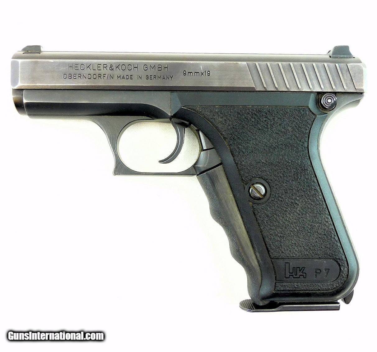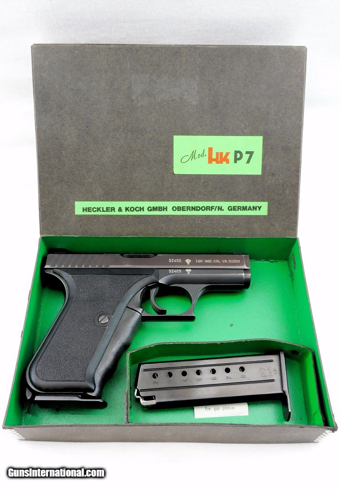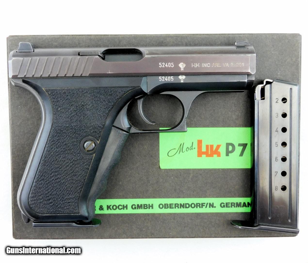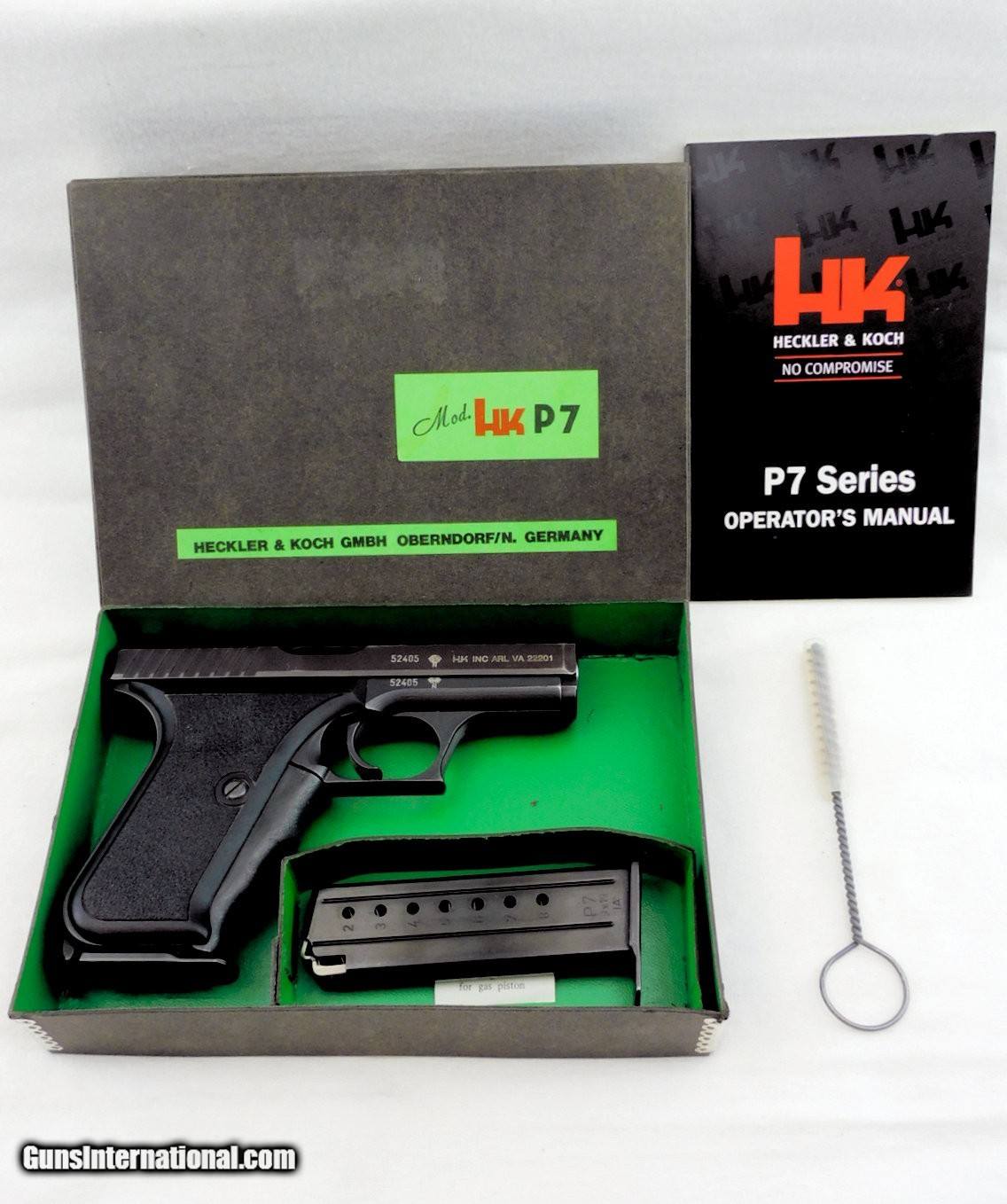 Description: Striking HK P7 PSP MFG 1983 9MM W/Box, 4" bbl, three dot sights, blued finish, ambidextrous magazine release, cocking lever in front of grip, serrated trigger - trigger guard, black textured HK P7 grips, two 8 round magazines, cleaning tool, and documentation. What a find! Add 3% for Credit Card Shipping $35.00 in the lower 48 SOLD |