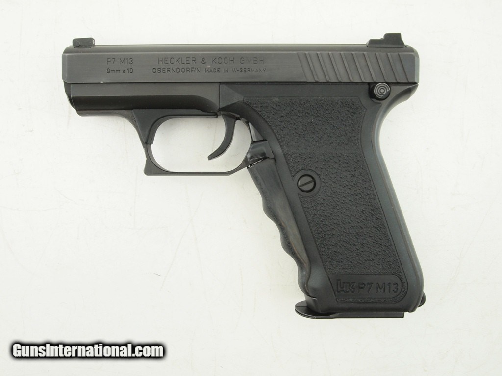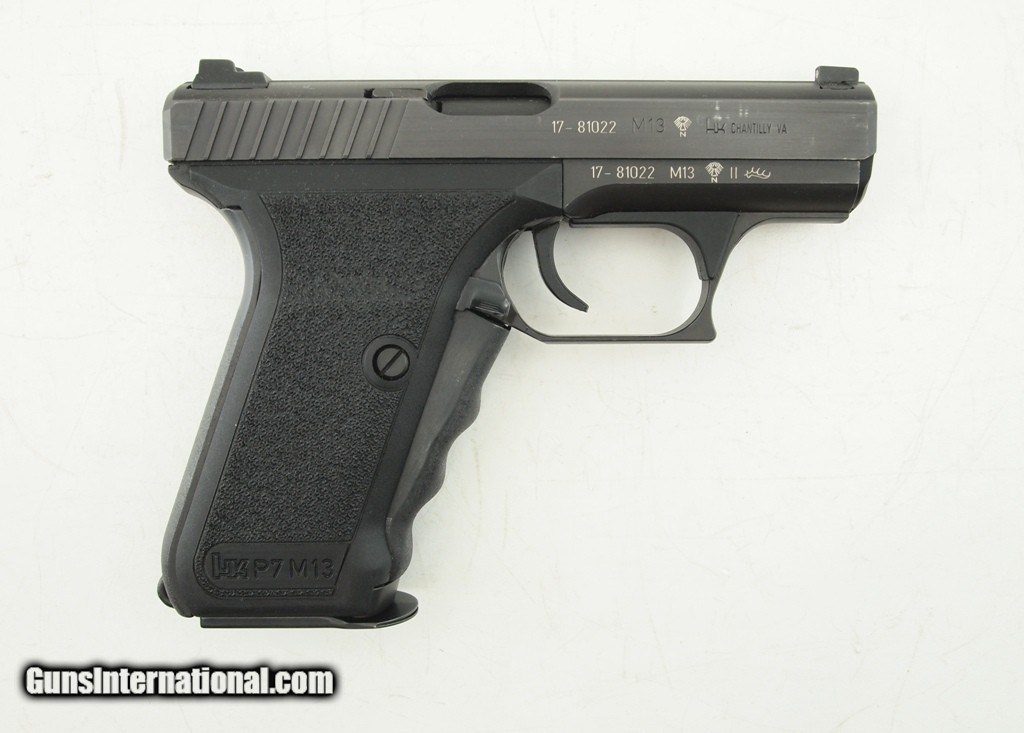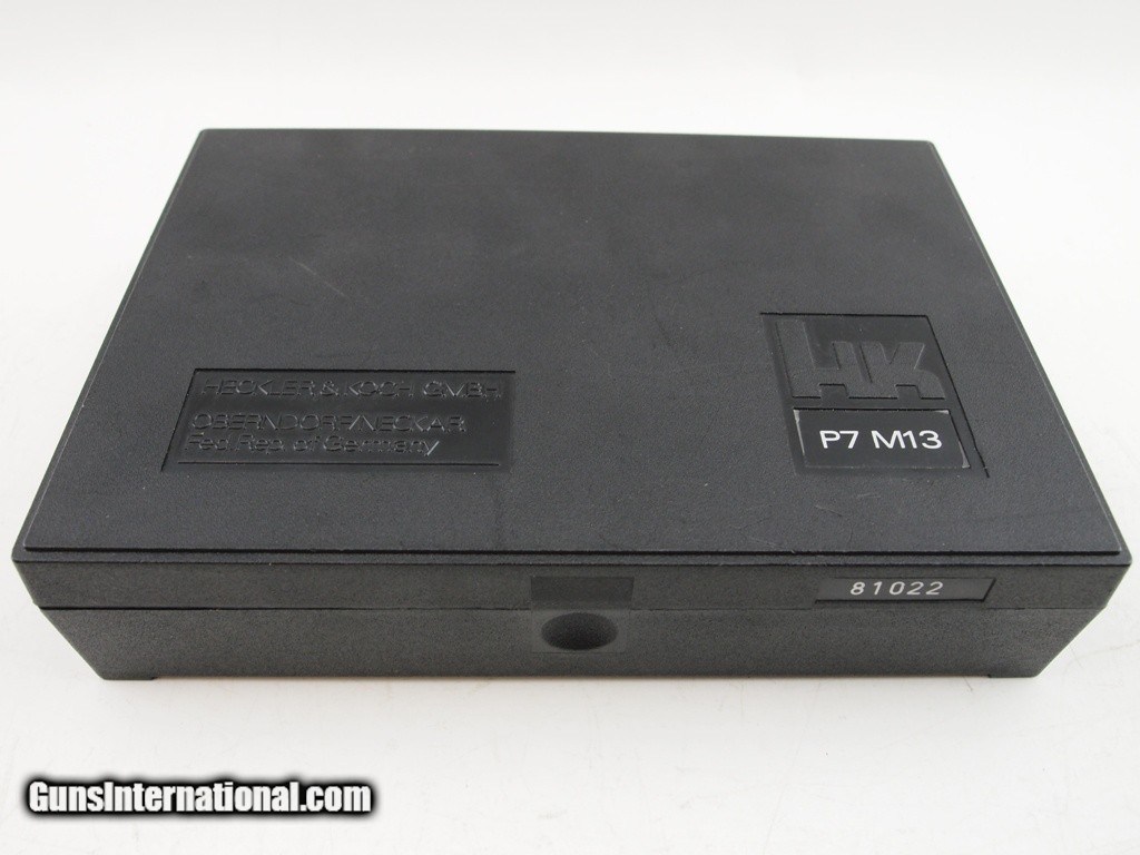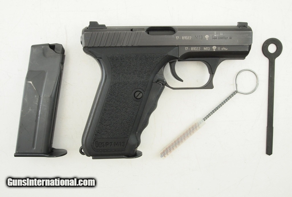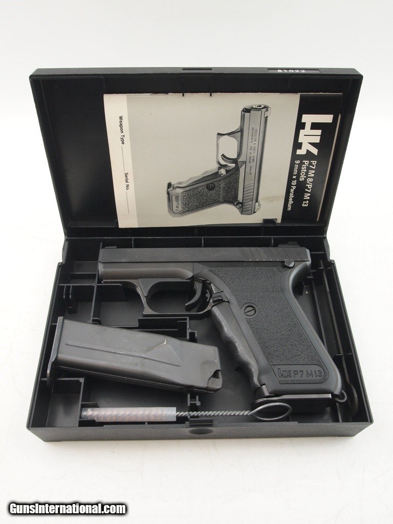 Description: Pristine HK P7M13 9MM WBox Unfired, 4" bbl, three dot night sights, blued finish, ambidextrous magazine release, cocking lever in front of grip, serrated trigger guard, lanyard loop, two 13 round magazines, cleaning tools, and documentation. What a find! Add 3% for Credit Card Shipping $25.00 SOLD |