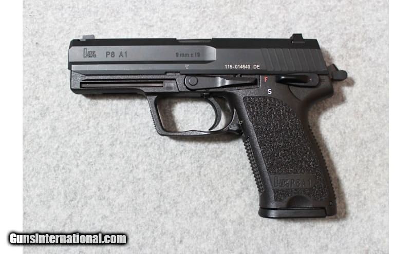 Description: HK P8 A1 double action / single action semiautomatic pistol, chambered in 9mm Luger. It has a 4.25" barrel and rear slide serrations. The sights are fixed 3-dot night sights, the controls are right-hand, and the frame has an accessory rail. Includes factory hard case, two magazines, and manual. Free shipping to any Bass Pro Shops or Cabela's store. 9mm Luger SOLD Metal Condition: Very Good Bore Condition: Bright And Clear Barrels: 4.25 inch Triggers: Double Action / Single Action Weight: 27 oz Sights: Fixed 3-Dot Night Sights Item Location: Allen, TX |