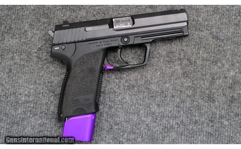 Description: For your consideration, a Heckler & Koch USP chambered in 9x19. The magazine release has been replaced with a purple anodized, extended unit. A matching +5 magazine extension has been affixed as well. These components are of unknown make, but suspected to be from HKparts. This piece is configured with a variant 1 trigger with DA/SA and safety-decocker, and dates to 1994. 9mm Luger SOLD Metal Condition: Very Good Wood Condition: Excellent Bore Condition: Excellent Barrels: 4 Triggers: Smooth Face Weight: 1.75 lbs Sights: Iron Sights Item Location: Hamburg, PA |