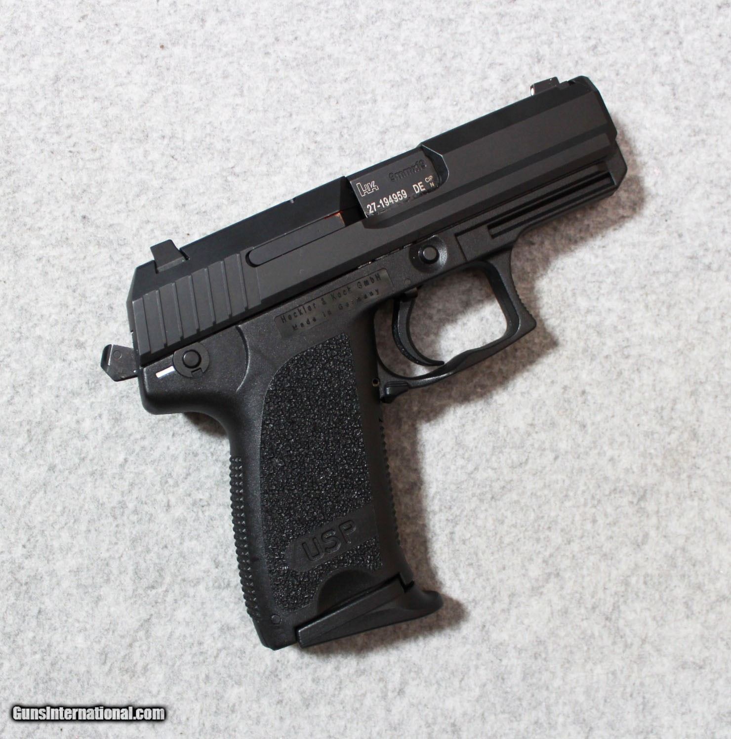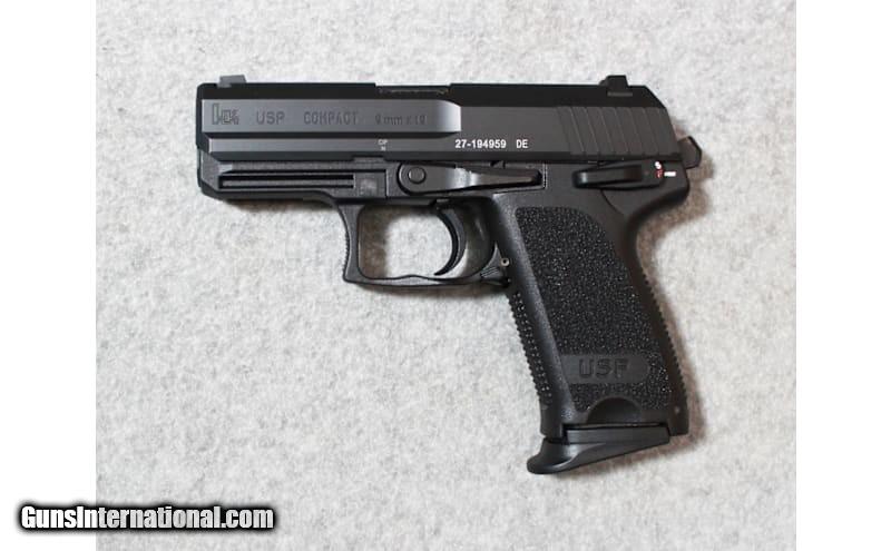 Description: HK USP Compact double action / single action semiautomatic pistol, chambered in 9mm Luger. It has a 3.5" barrel, and rear slide serrations. The sights are fixed 3-dot white dot, and the controls are right-hand. The frame has an accessory rail. Includes factory hard case, three magazines, and manual. Free shipping to any Bass Pro Shops or Cabela's store. 9mm Luger SOLD Metal Condition: Very Good Bore Condition: Bright And Clear Barrels: 3.5 inch Triggers: Double Action / Single Action Weight: 26 oz. Sights: Fixed 3-Dot White Dot Item Location: Allen, TX |