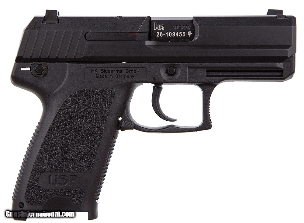 Description: Guns Listing ID: 278999 The HK USP Universal Selfloading Pistol is an accurate and ultrareliable handgun. It utilizes a fiberreinforced polymer frame stiffened by stainless steel inserts at areas subject to stress and friction. The control lever a combination safety and decocking lever is frame mounted and quickly accessible unlike the slidemounted safeties. The modular design of the USPs internal components allows the control lever function to be switched from the left to the right side of the pistol for lefthanded shooters. The USP Compacts are smaller and lighter than large frame USPs. The reduction in trigger reach and grip circumference increases concealability and enhances shooting ergonomics. It utilizes a narrow fullhand grip frame with a choice of interchangeable extended or flushfitting magazine floorplates. The USP Compact features a polygonal bore barrle onepiece steel slide with contoured extended release bobbed hammer universal mounting grooves and ambidextrous magazine release lever. This V1 model has a black frame with blued slide captive recoil spring assembly with polymer absorber bushing fixed sights and comes with two 12round magazines. SOLD Manufacturer: HECKLER & KOCH Model: USP Caliber Info: .40 S&W Condition: new Barrels: 3.6 BARREL Finish: BLUED |