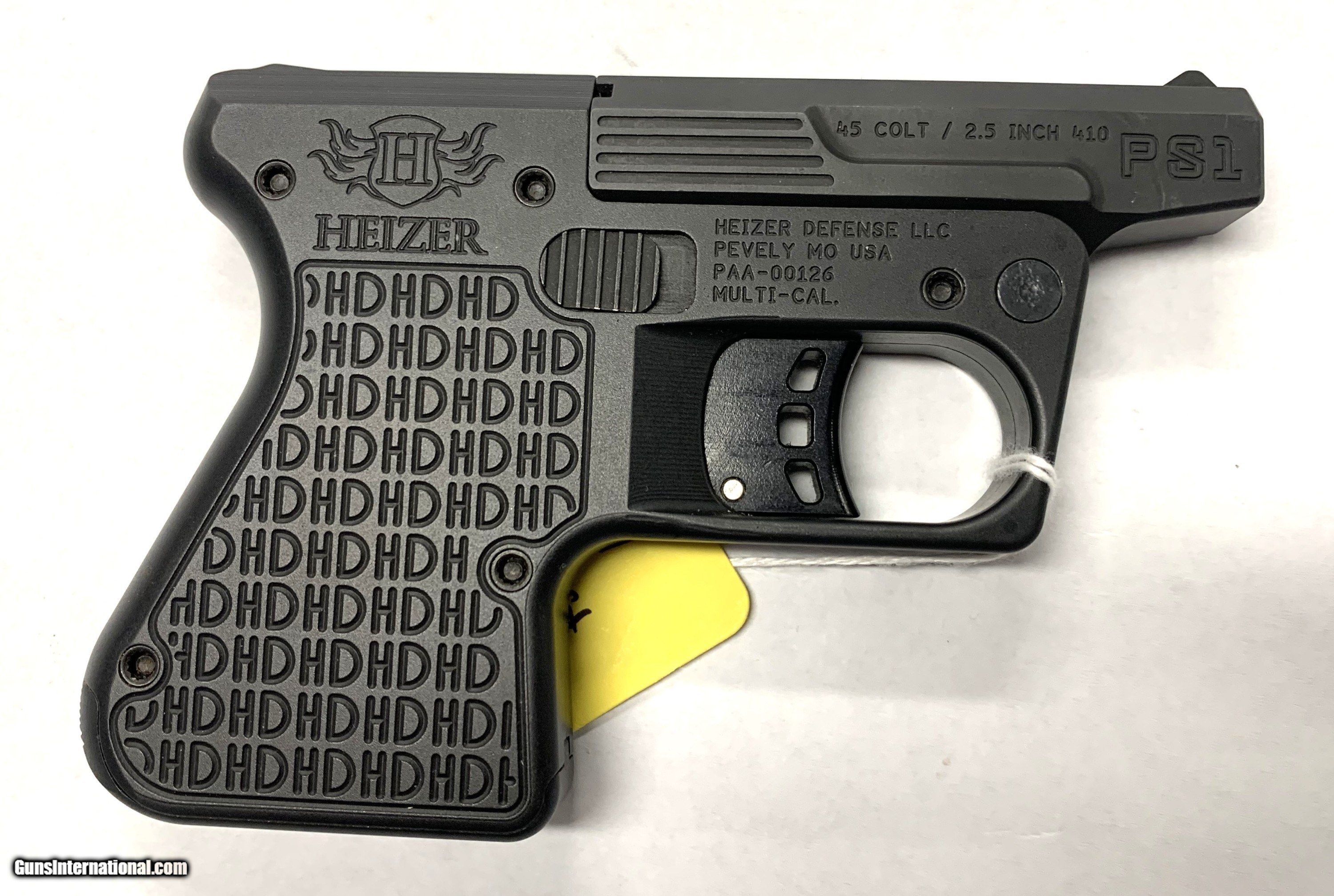Description: Heizer Defense model PS1 45 colt/410 single shot pistol. Comes with additional .223 caliber barrel, box and soft case. $249.99 plus shipping. No credit card fees. No CA sales. SOLD |