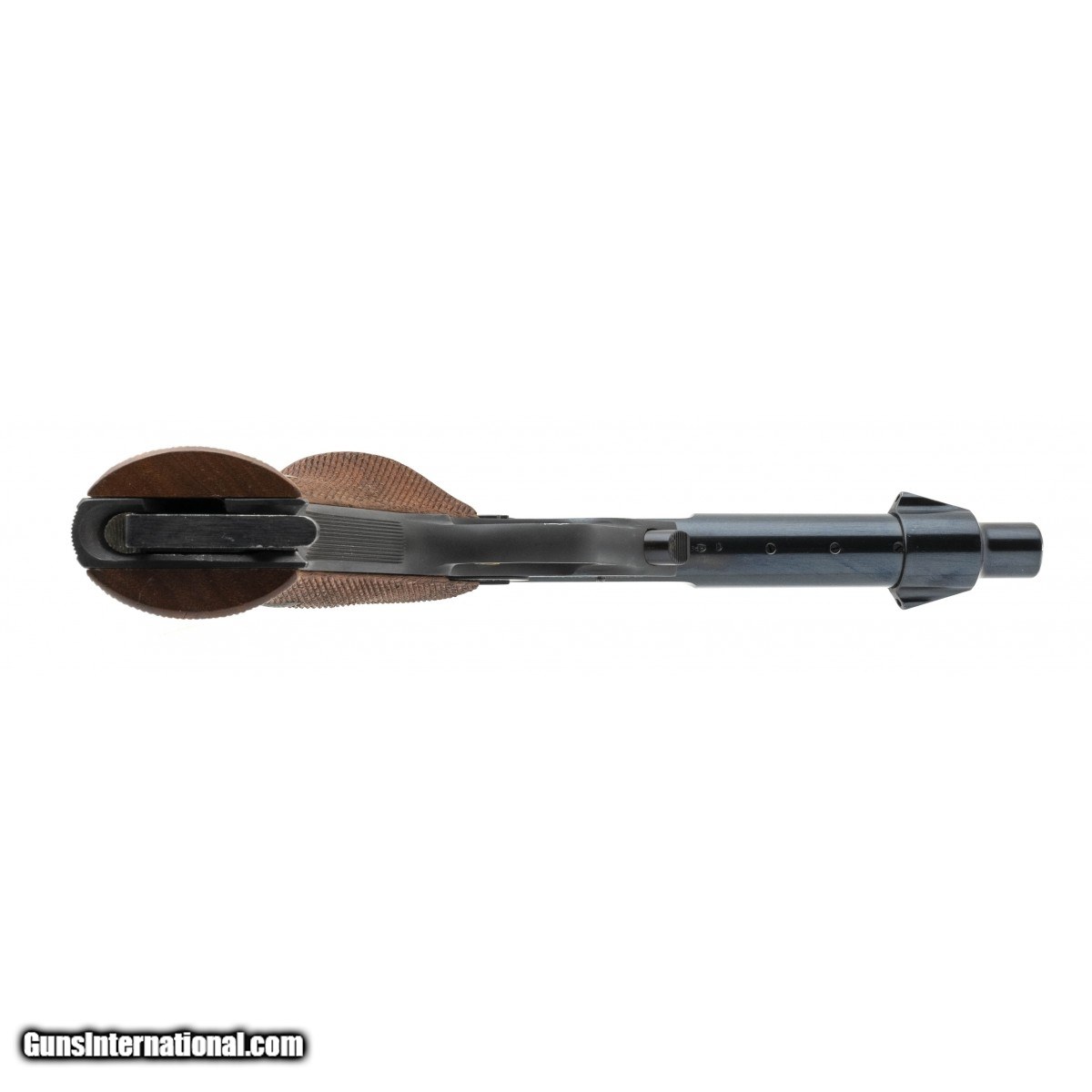 Description: " SN:131007. 1944 vintage left hand, semi-automatic 6.5"" target plinking pistol of Houstonian origins with a bull barrel, adjustable target sights, finely checkered grips & brass small parts. In excellent condition. SOLD |