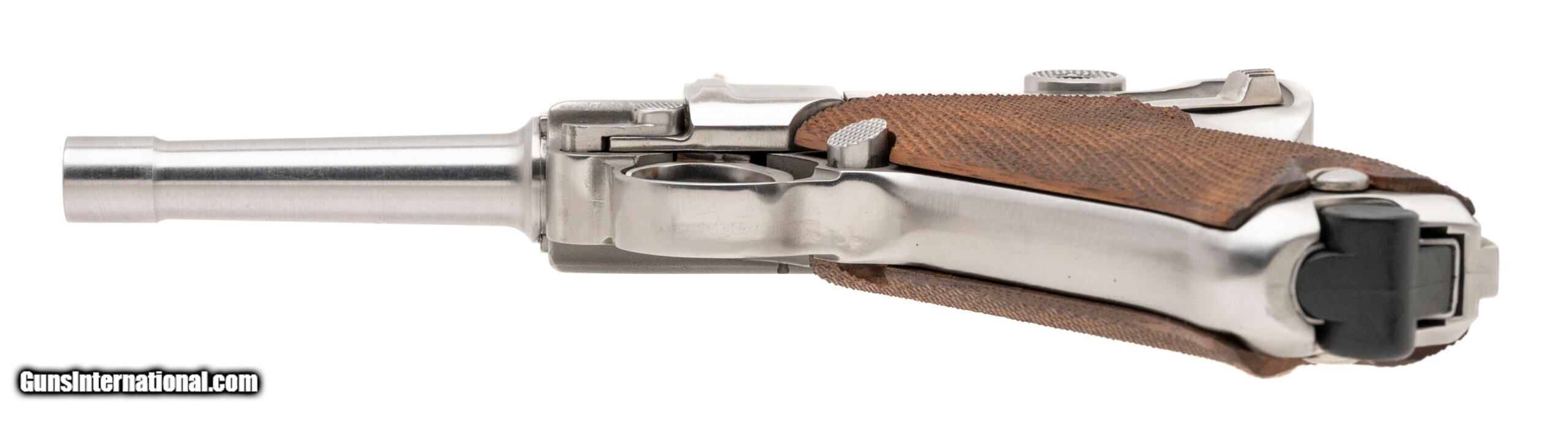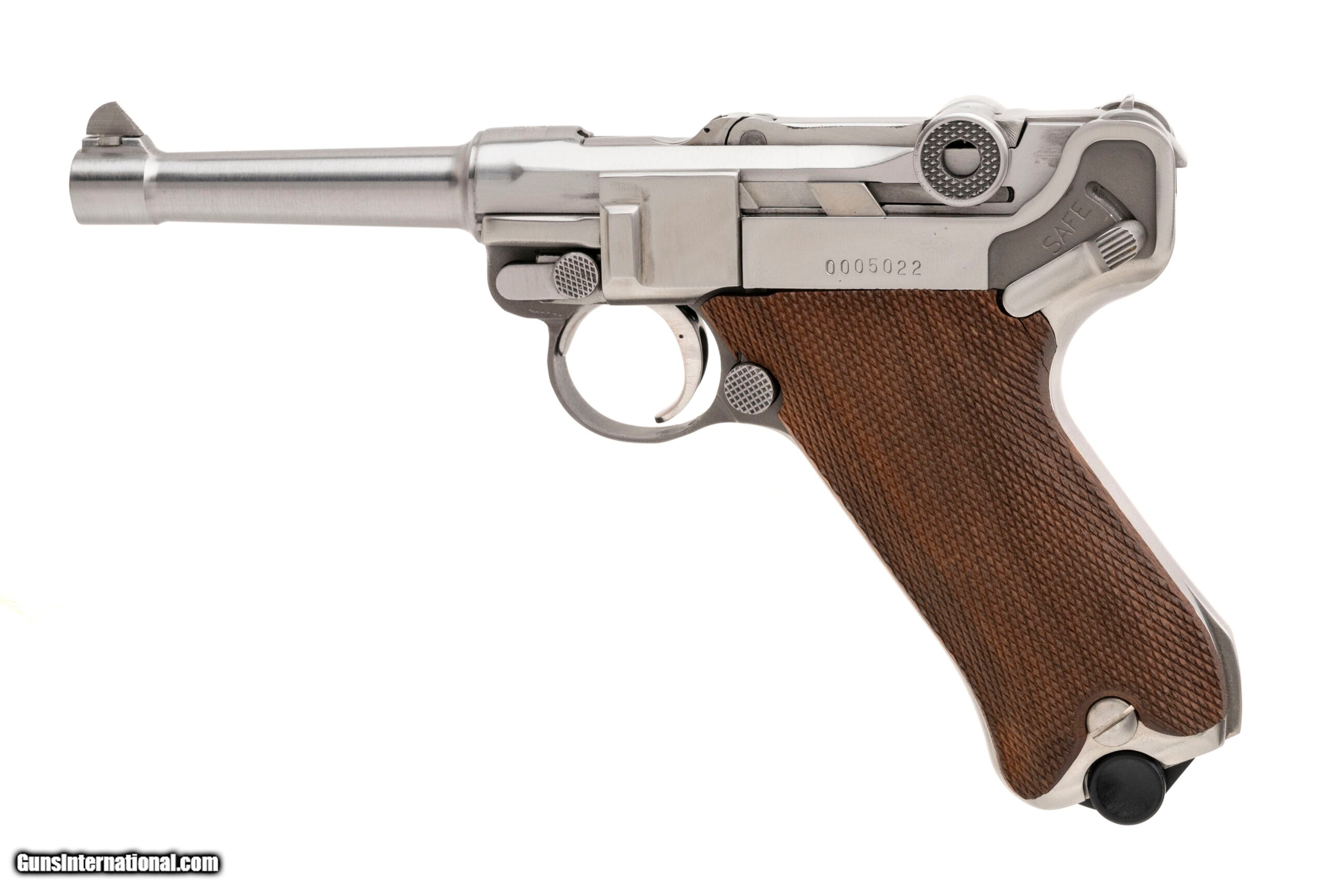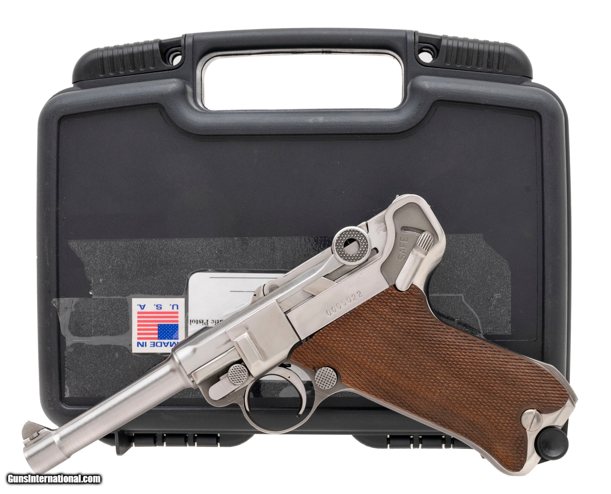 Description: "SN: 0005022. Modern production 9mm with a 4"" barrel. Stainless steel Luger pistol in excellent condition. Comes with plastic case and manual. A neat modern take on a classic pistol. SOLD |
