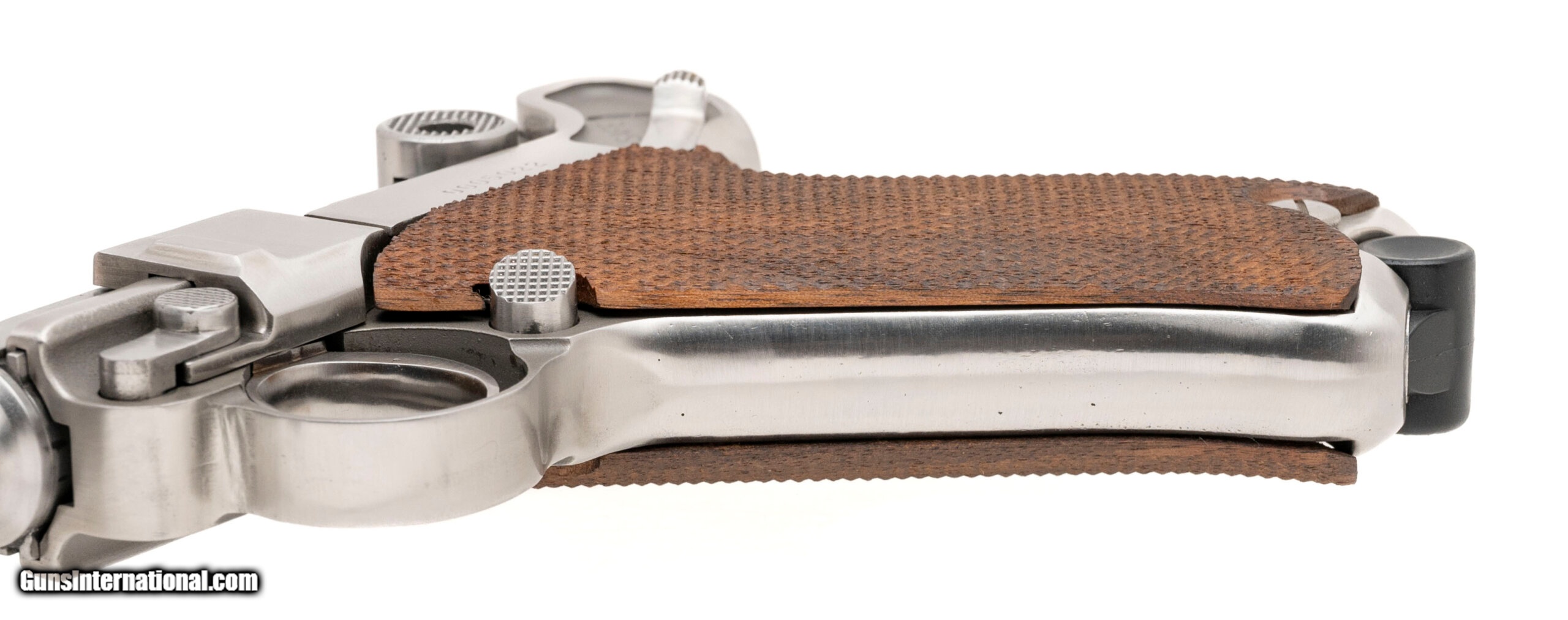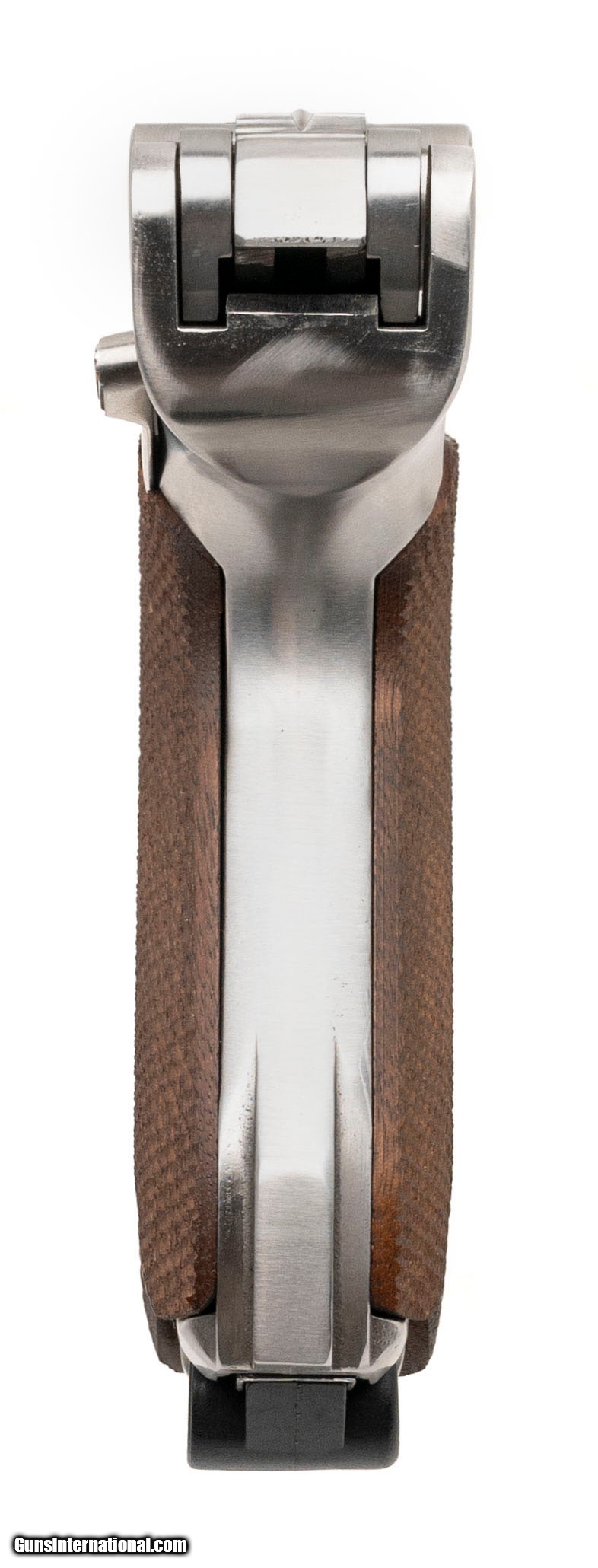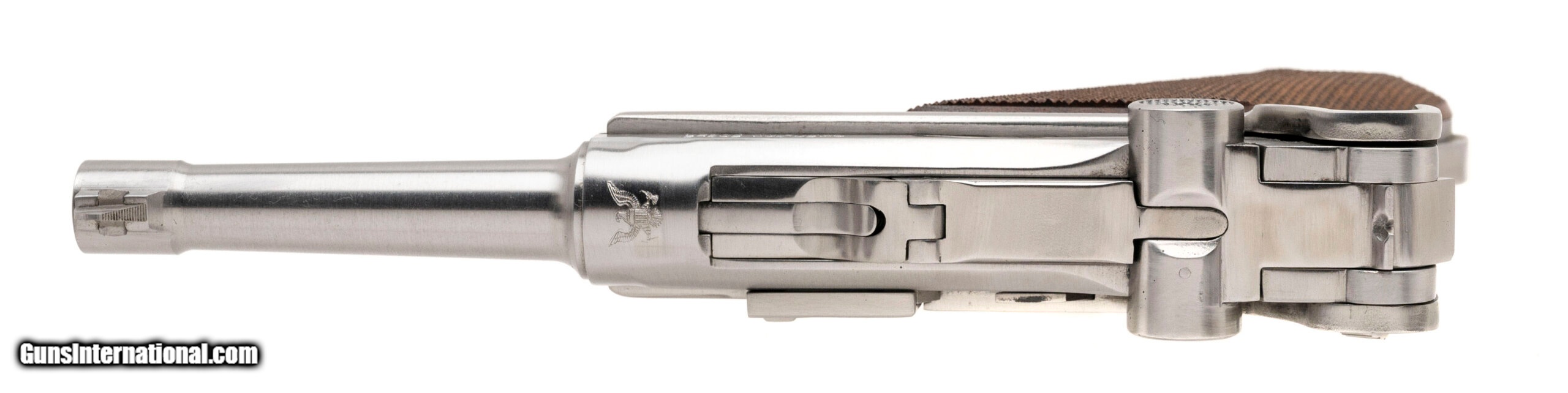 Description: "SN: 0005022. Modern production 9mm with a 4"" barrel. Stainless steel Luger pistol in excellent condition. Comes with plastic case and manual. A neat modern take on a classic pistol. SOLD |