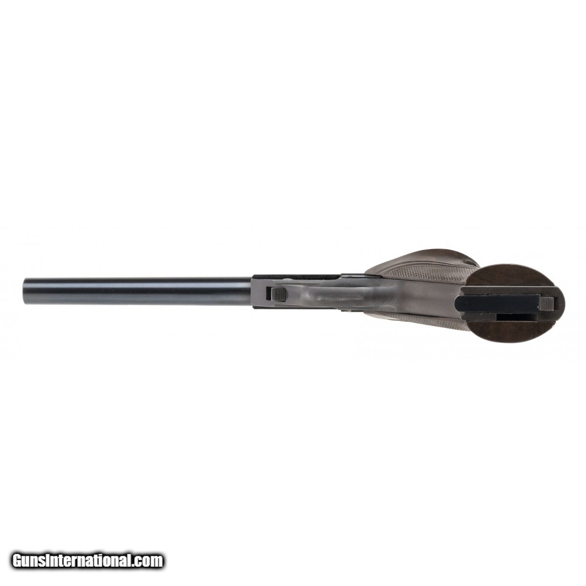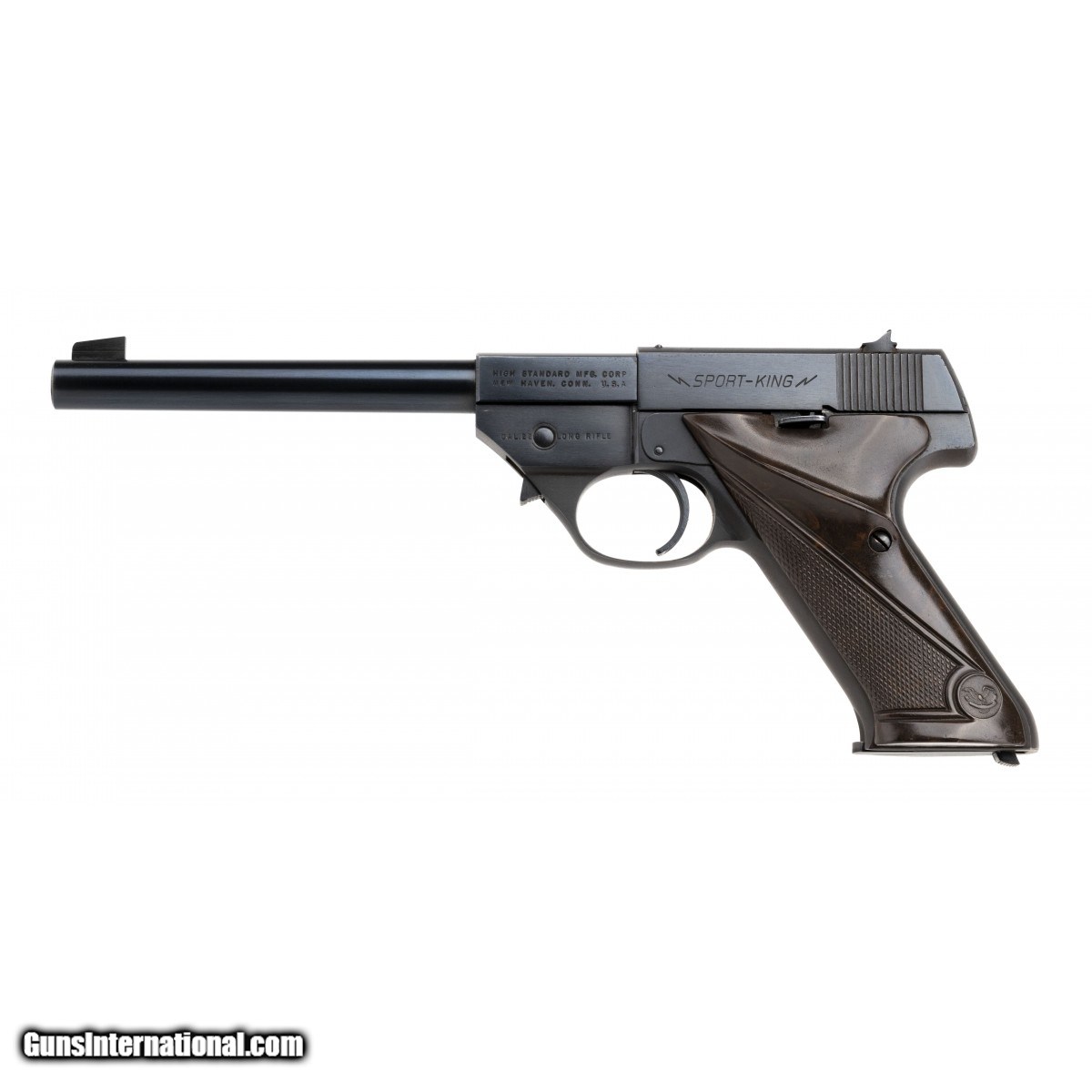 This .22LR first model Hidh Standard Sport-King is circa 1950 to 1954. The 6.75"" barrel has an excellent bore with bright, strong rifling. This gun has the desiravle slide hold back when the magazine is empty. The gun has approx. 99% blue overall. The checkered plastic grips are excellent with no cracks or chips. The action functions correctly. Don't miss this desirable long barrel Sport King.