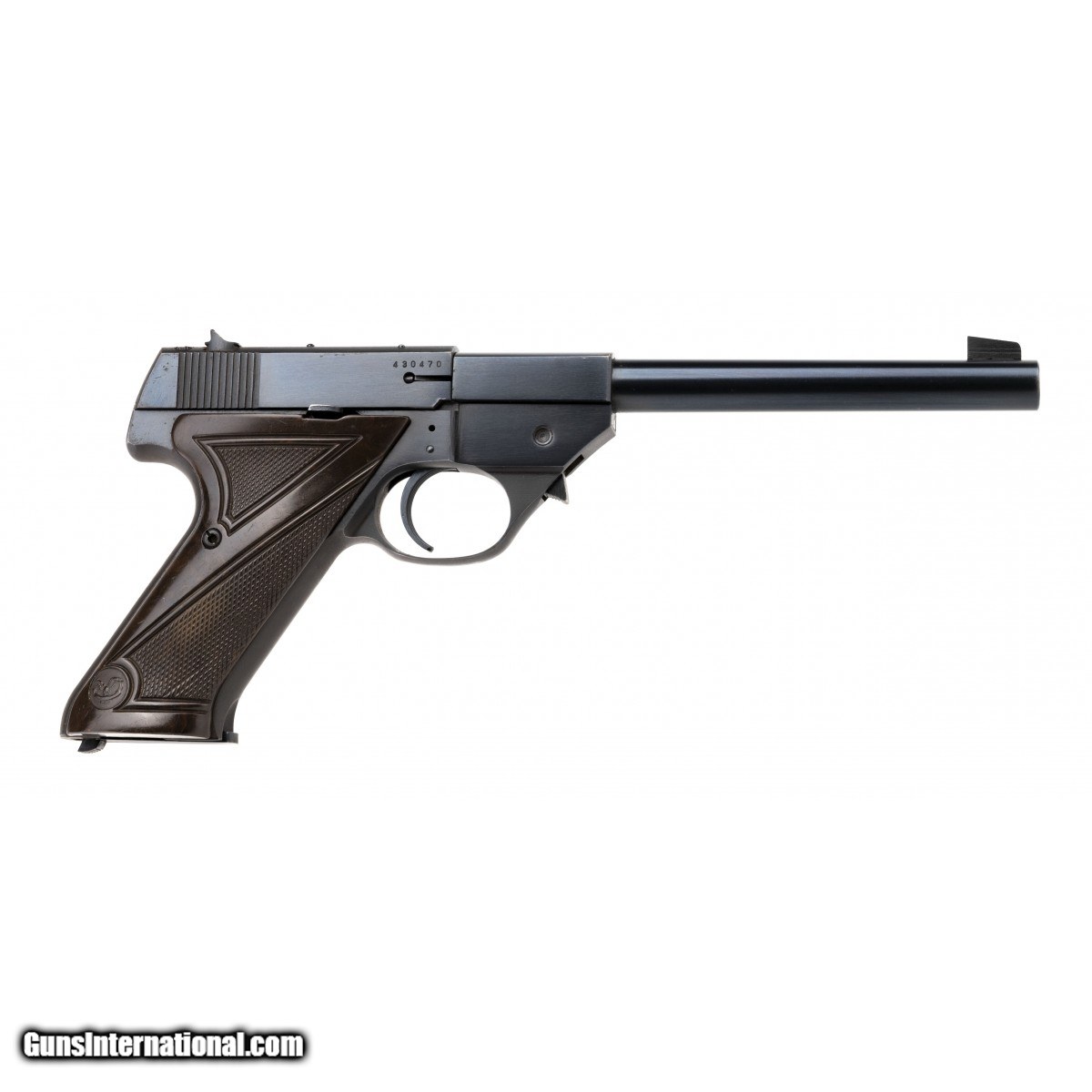 Description: " This .22LR first model Hidh Standard Sport-King is circa 1950 to 1954. The 6.75"" barrel has an excellent bore with bright, strong rifling. This gun has the desiravle slide hold back when the magazine is empty. The gun has approx. 99% blue overall. The checkered plastic grips are excellent with no cracks or chips. The action functions correctly. Don't miss this desirable long barrel Sport King. SOLD Curio/Relic: Yes |
