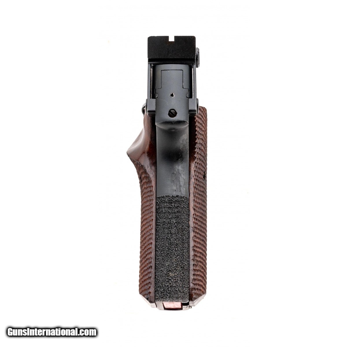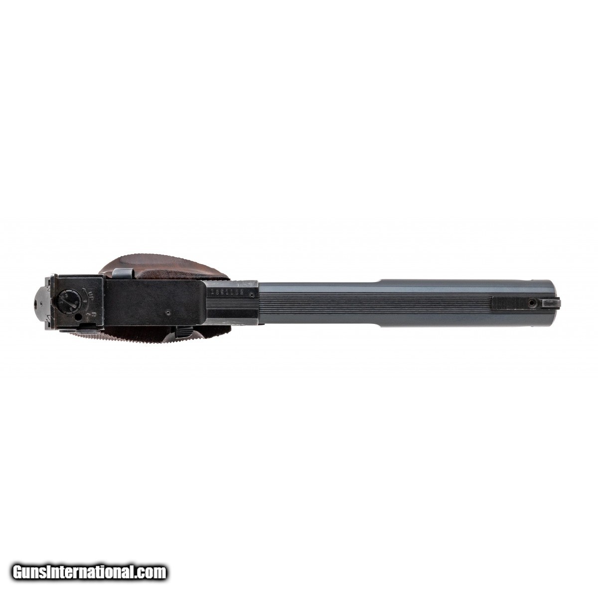 SN:1851102. Made in 1946 .22 Long rifle with a 5.5"" barrel. Bore is excellent. Semi-auto pistol with 95% original finish, has a bit of muzzle wear. Has original wood grips in excellent condition. Overall condition is very good. Consignment.
