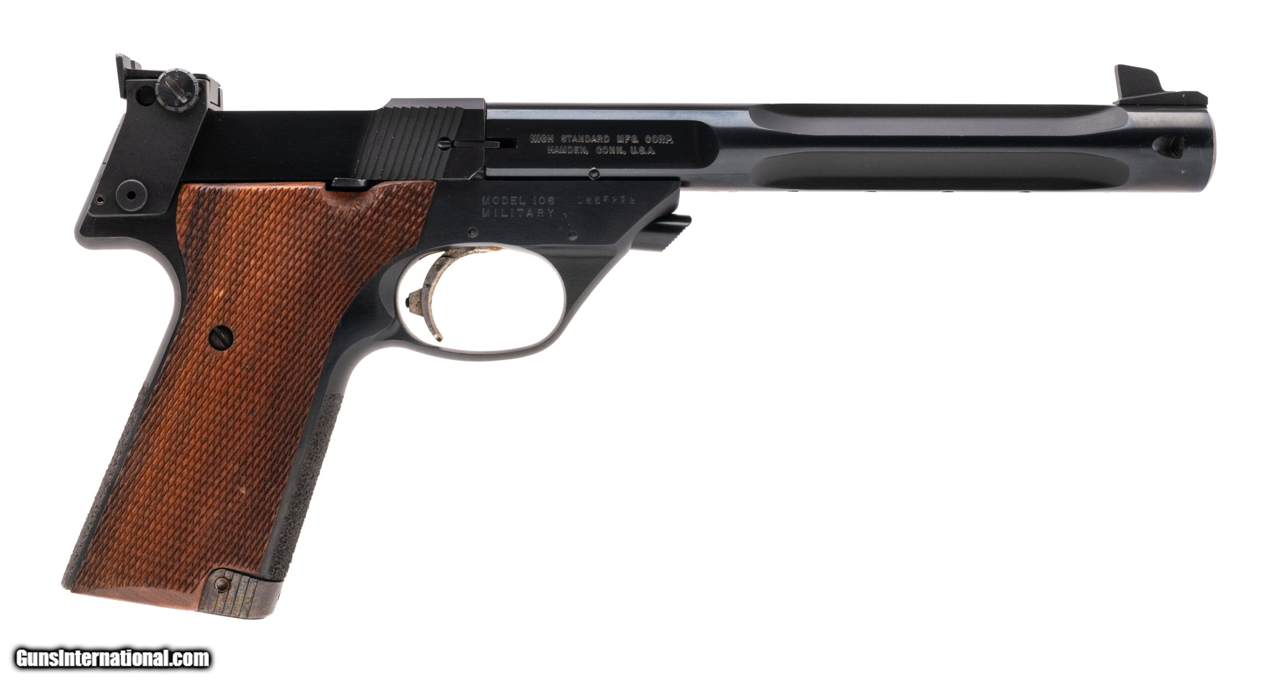Description: "SN: 1865229. Made in 1967, .22LR with a 7.25"" barrel. Model 106 Military target pistol in excellent condition with box SOLD |