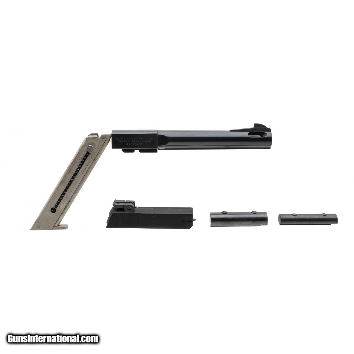 Description: " SN:722443. Made in 1956, .22Lr, with a 6.75"" barrel. Bore is excellent. Target pistol hand stamped ""USMC property"" on right side of frame. Has 99% of original finish. Grips are excellent besides one small chip. Overall in excellent condition. Comes with original box and conversion kit to .22 short. Consignment. SOLD |