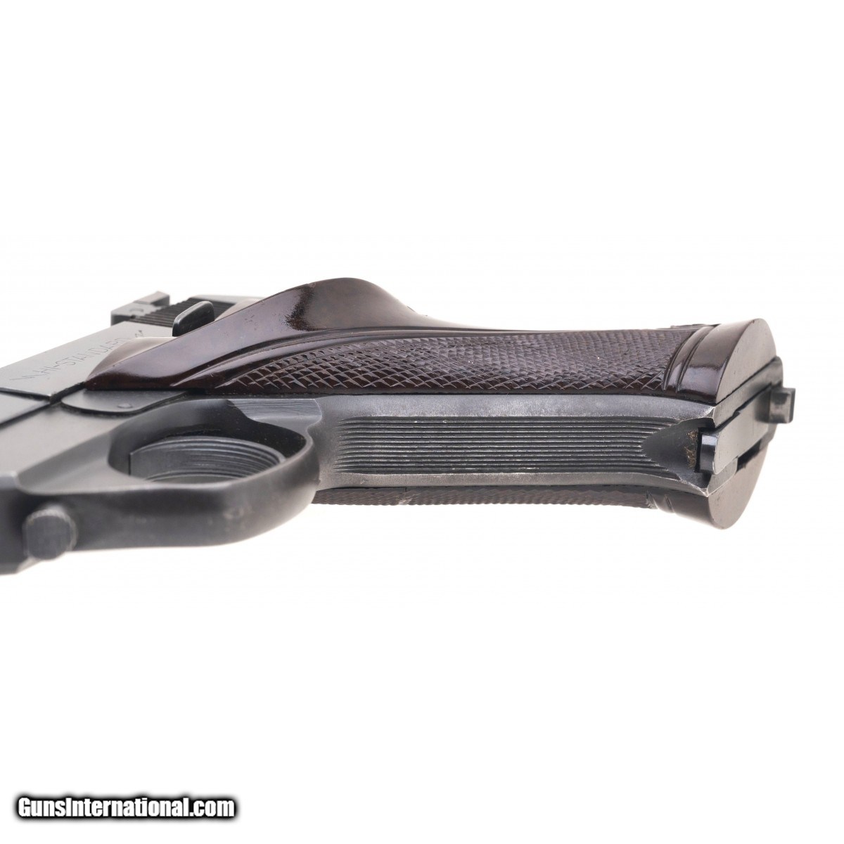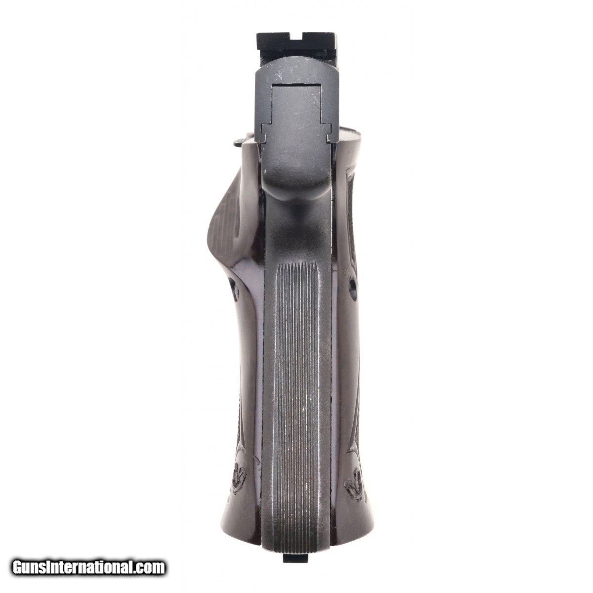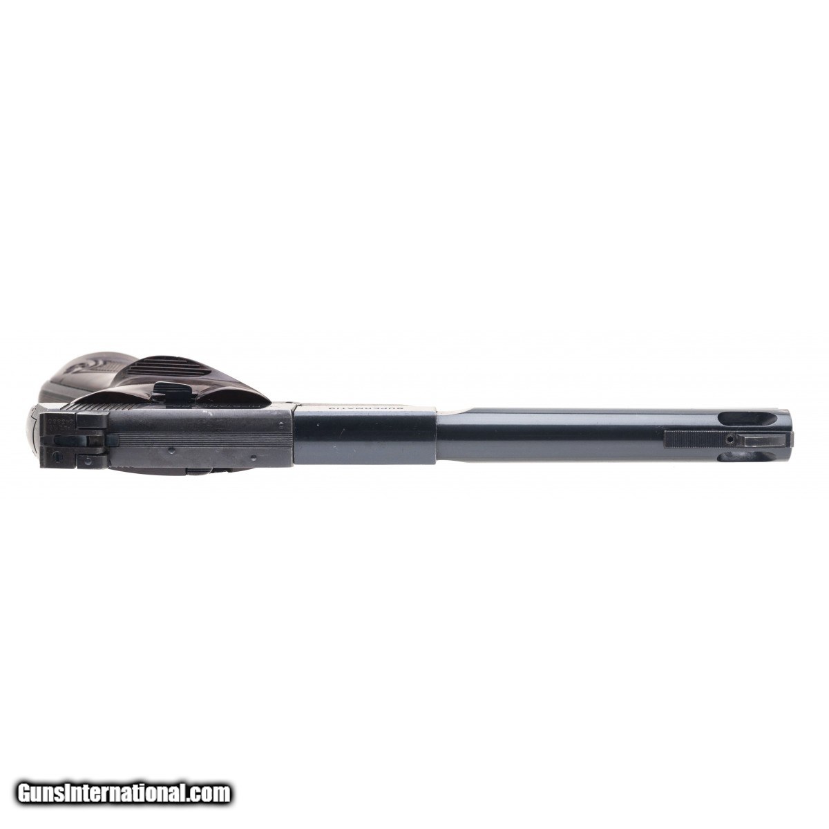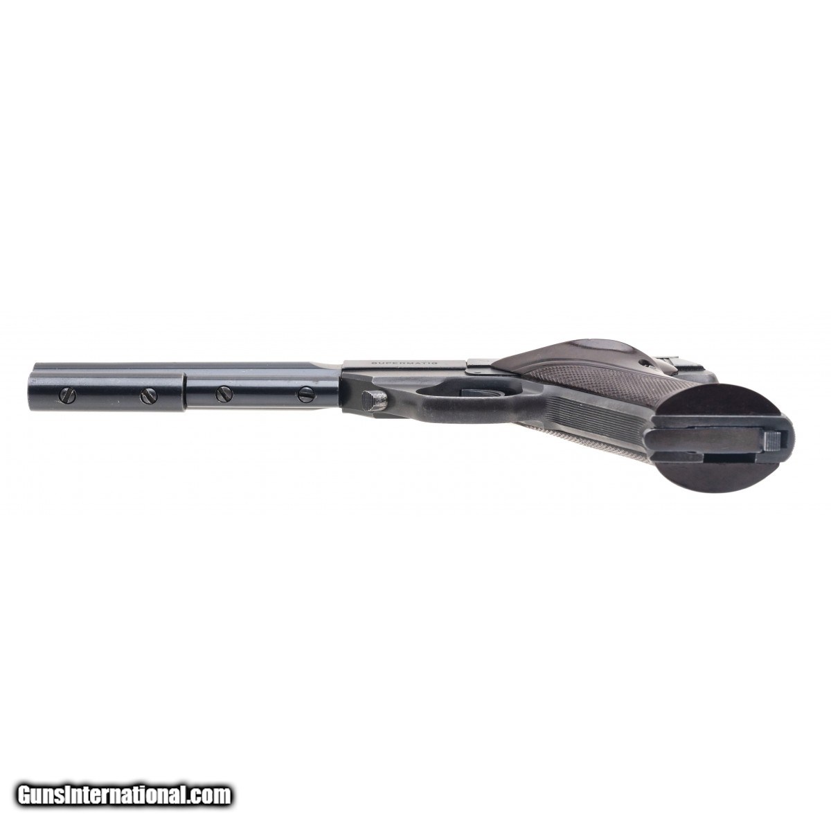 Description: "SN:760117. Made in 1956. .22LR with a 7"" barrel. Bore is in excellent condition. Semi-auto target pistol with USMC engraved on right side of frame and grips are in good condition with crack on grip. Overall condition is very good. Comes with extra Olympic .22 Short barrel, slide and case. Consignment. SOLD Curio/Relic: Yes |