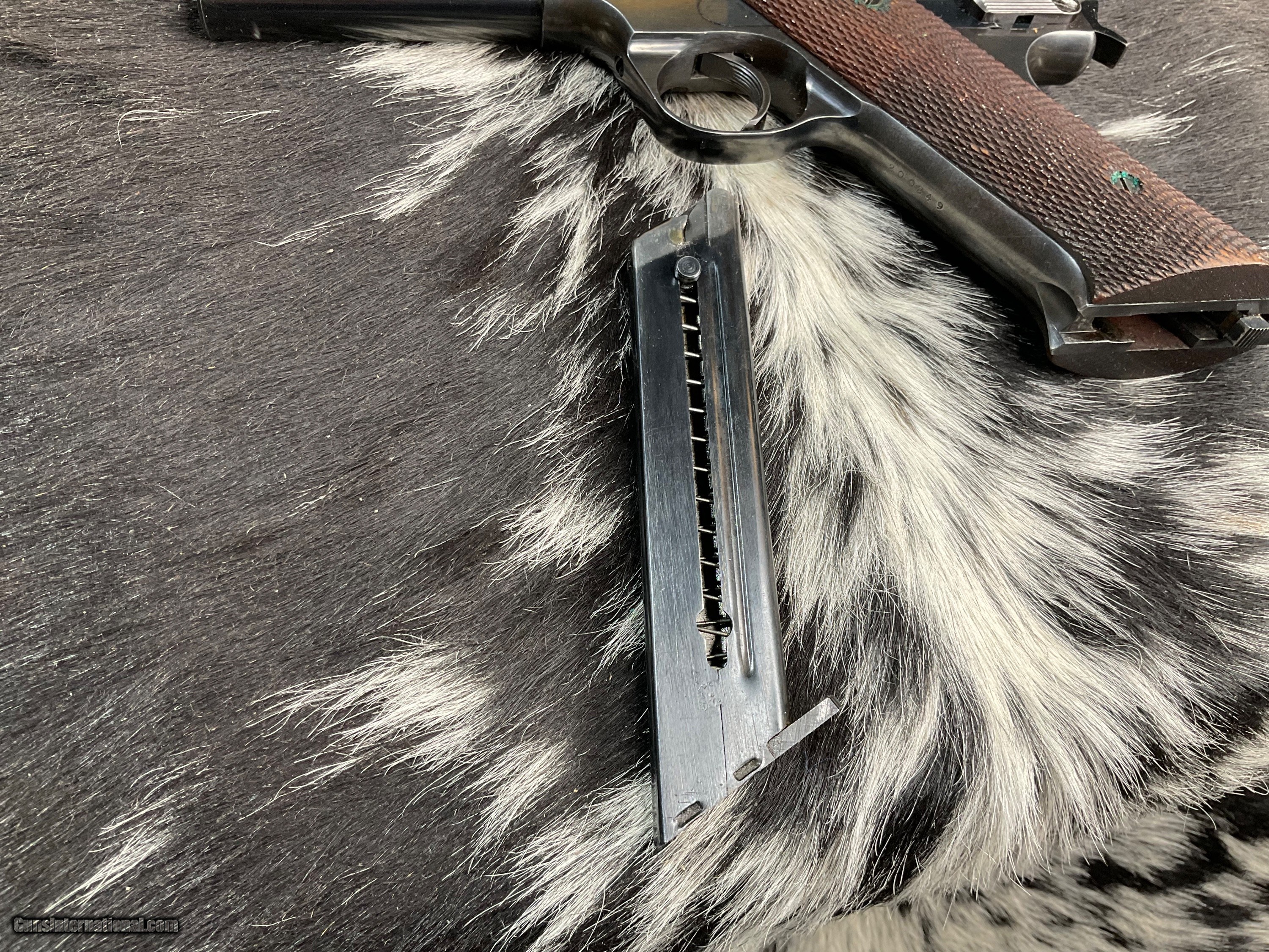Description: 1947 Mfg. High Standard HD Miltary .22 LR Pistol in original box with owners papers. 98% original Blued finish remains, full checkered wood grips,full adjustable unique rear sight, tutone magazine, heavy target barrel and exposed hammer. One glance at this package makes me think of hours of pure plinking pleasure spent as a boy with this model High Standard. Rare find in this condition with box and paperwork with the desirable 4.5 inch Bull barrel. This model was produced from 1945 to 1950. Add 3% if paying with credit card. Free shipping for all US Veterans! God Bless America from a proud American, and a Viet Nam Vet , thankful for our freedoms.. paid for by the Blood ,Sweat and Tears of our brave men and women in uniform. Ten Below Firearms is a Veteran owned and operated business. We specialize in out of production models of high quality firearms. We love to ship! We ship to all states where legal, just give us a call! Handguns normally ship for $35 and Long guns for $50 and up for extra length long guns. That's 2-3 day USPS Priority shipping, Delivery conformation and with tracking number. Optional Postal insurance is additional $1.75 per $100 and highly recommended. We are OPEN BY APPOINTMENT ONLY FOR IN PERSON VISITS, We trade, sometimes. All payments sent via mail must be received within five days of date of purchase or item will be relisted for sale. Layaway:If needed we offer a 60 day layaway program. Terms, 1/3 of purchase price down, 1/3 due in 30 days, and the final third to include card fees and shipping due at 60 days. Funds are non transferable and non refundable .Layaway is not available on negotiated prices. SOLD Curio/Relic: Yes Handgun Caliber: .22 Long Rifle Manufacturer: High Standard Model: HD MILITARY Barrel Length: 4.5 inch Condition: Excellent Metal Condition: Excellent Wood Condition: Excellent Bore Condition: Excellent Barrel Type: Heavy Bull Target Action: Semi auto Triggers: SA Finish: Blued Sights: Adjustable target Manufacture Date: 1947 Case: Box Item Location: Mn |