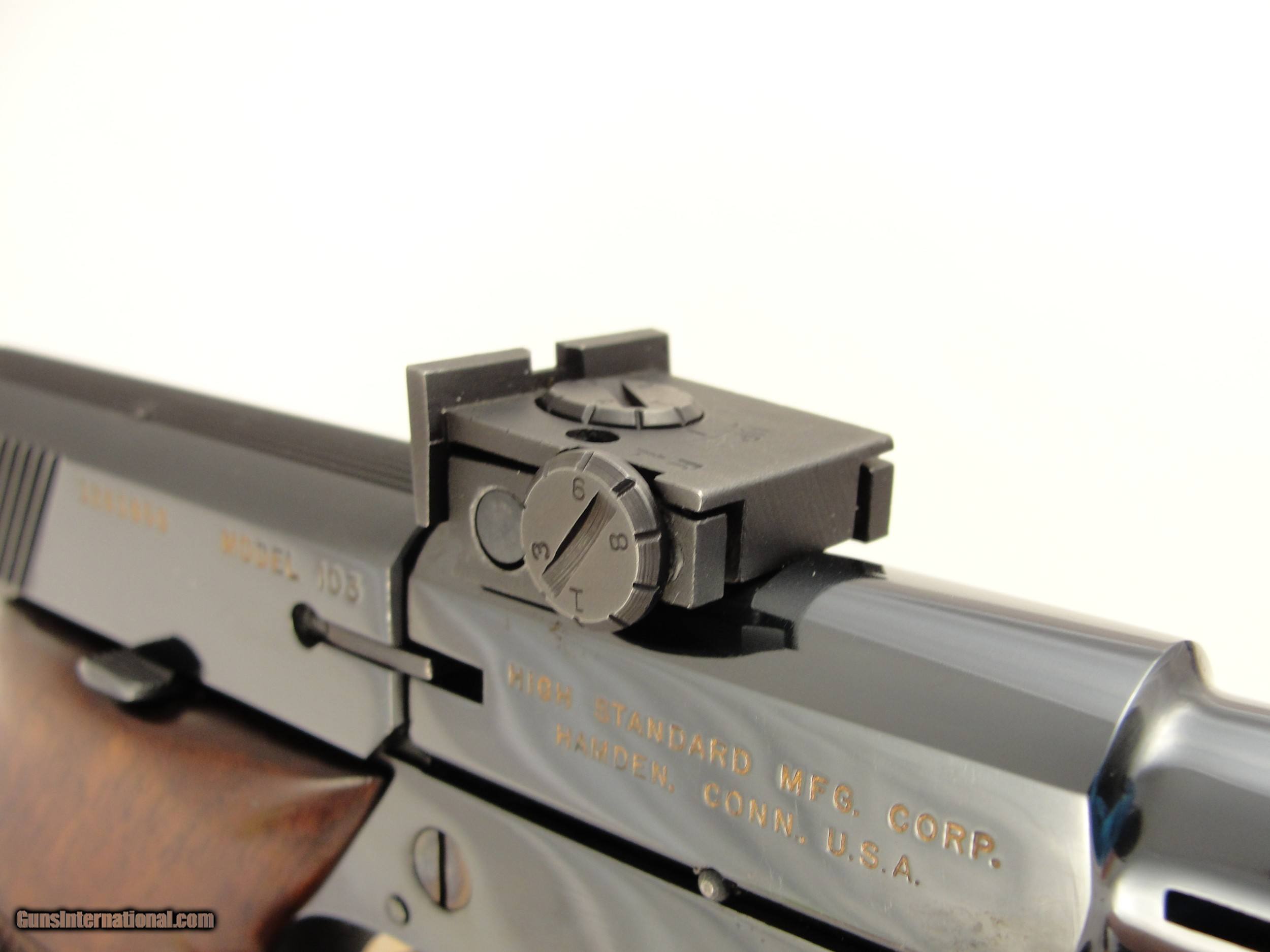 Description: Sold Pending Funds - A beautiful 1962 first year HI-STANDARD Supermatic Trophy Model 103 “Spacegun” in the rarest tapered barrel length of 10” with a muzzle brake and SANDERSON TARGET STOCKS. It is in the original factory High Gloss polish of the Trophy Line as opposed to the lesser polished Citation. As such, it has the gold trigger, gold safety button and gold inlaid lettering. For the 103 Series pistols, the Trophy was the highest grade target pistol destined to become one of the most important pistols in the Hi-Standard line. The rakish lines of the 103 Series guns along with some of the very unusual barrel profiles were unconventional in their day and remain so today. This pistol is particularly interesting because it comes with the very scarce 10-inch "Space Gun" tapered barrel. This unusual, odd-looking barrel features a tapered round/thin profile with a large diameter muzzle atop which sat the front sight. This fat muzzle section acted as a vibration damper and also had slots which served as anchor points for a detachable muzzle brake. The length of the barrel was also grooved for the attachment of barrel weights, both of which are included. The rear sight was mounted on the rear of the barrel, above the chamber. Pistols shipped with the standard shorter barrels had the rear sight mounted in a dovetail on the slide. Since this pistol has no slide dovetail it is safe to assume it shipped with the long space gun barrel. The frame and slide have matching serial numbers. The excellent original factory finish has evidence of careful usage and collector type markings associated with a well-cared for 57-year old firearm, but no rust or pitting. The mechanics appear to be in perfect working order and the bore is mirror bright with sharp rifling. It comes with one factory 10-shot magazine. According to the serial number, this pistol was produced in 1962. Please view the photos here for the purpose of evaluating the condition for yourself. This item qualifies as a C&R. Versions of this pistol could be used in ISU rapid-fire Olympic courses of fire (.22 Short caliber), as well as standard bullseye shooting. U.S. shooters won Olympic Rapid Fire gold medals in 1952 and 1960 using High Standard pistols, the only gold medals ever won in this event with an American made pistol. The Supermatic features various barrel lengths with integrally machined muzzle brake, removable barrel weight options, finely adjustable rear sight and a two-stage trigger that breaks like the proverbial glass rod at 2.5 pounds with zero over-travel due to an integral screw stop system. Shipping: $45 No International or California sales. Buyer is responsible for knowing their own local and state laws and whether or not you are prohibited from taking possession of, or owning this firearm. By participating, you are attesting to being of at least 21 years of age. ***The purchaser assumes all risks and should have a qualified Gunsmith evaluate the firearm before attempting to shoot it. *** Please contact me within 3 days of close of for payment. Payment must be by bank certified (cashiers) check or Postal Money Order. Shipping & insurance by FedEx is $45 to eligible lower 47 states. Shipping to AK or HI will have additional costs for which buyer is responsible. I will need a copy of an FFL dealer license or C&R with copy of Driver’s License to ship the gun. There is a 3 day, no-shoot, no disassembly inspection period and the buyer is responsible for cost of shipping both ways if returned. If your FFL dealer will not accept shipment from an individual, I will need an additional $35 to ship through my FFL SOLD Curio/Relic: Yes Manufacturer: High Standard - Hi Standard Model: Supermatic Trophy Model 103 Caliber Info: .22 LR Manufacture Date: 1962 Extras: Sanderson Target Stocks |