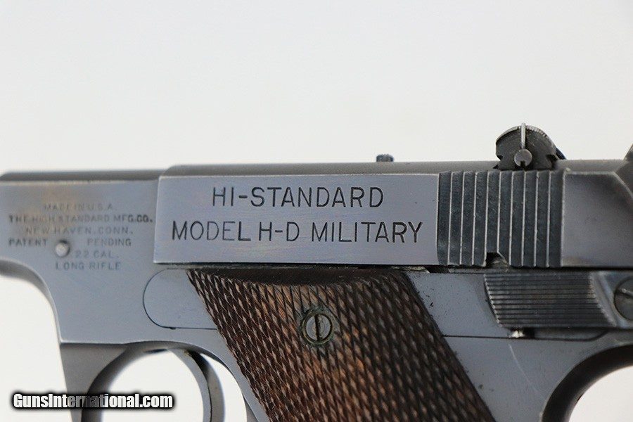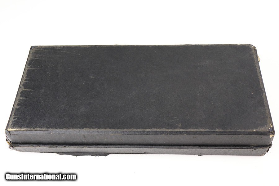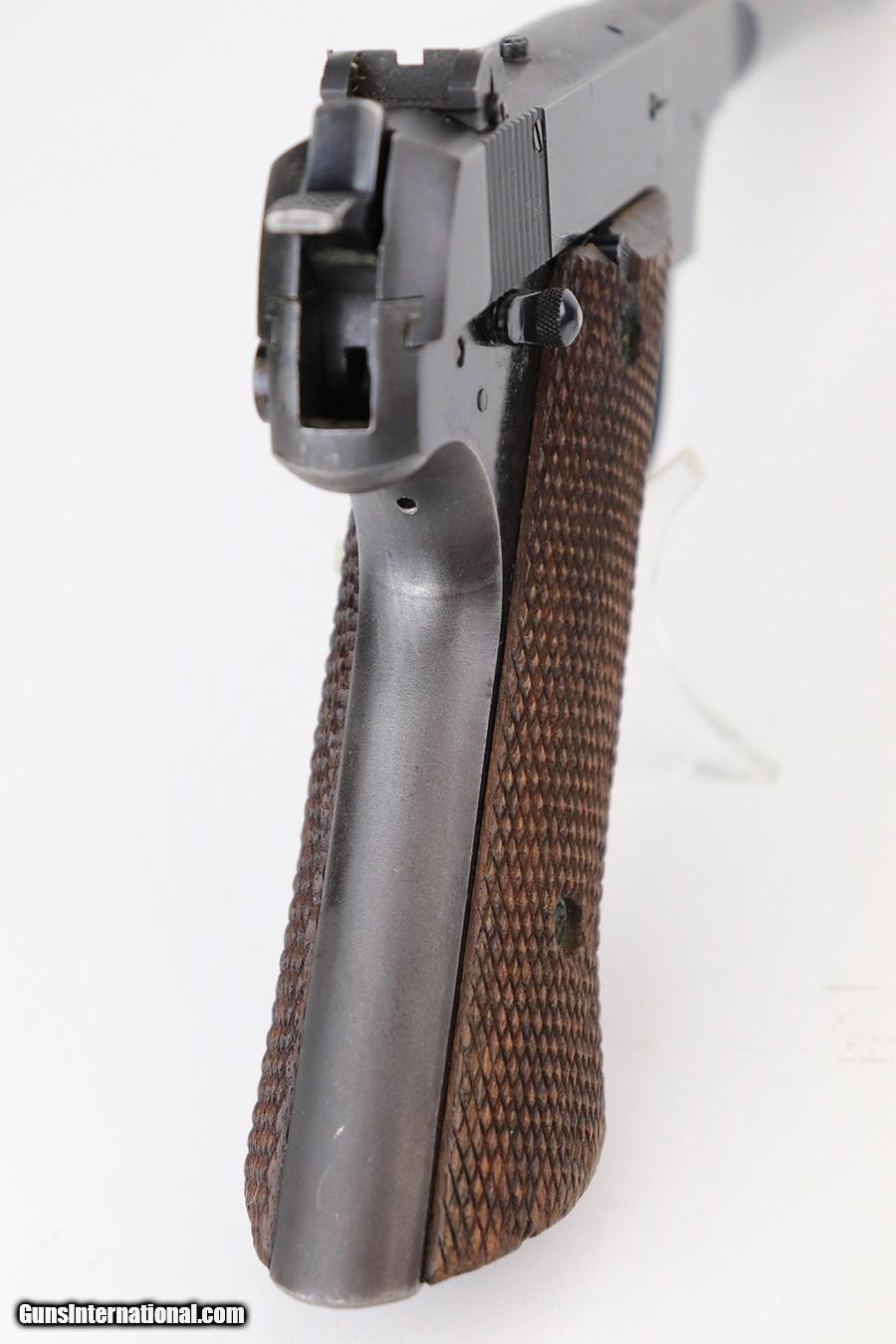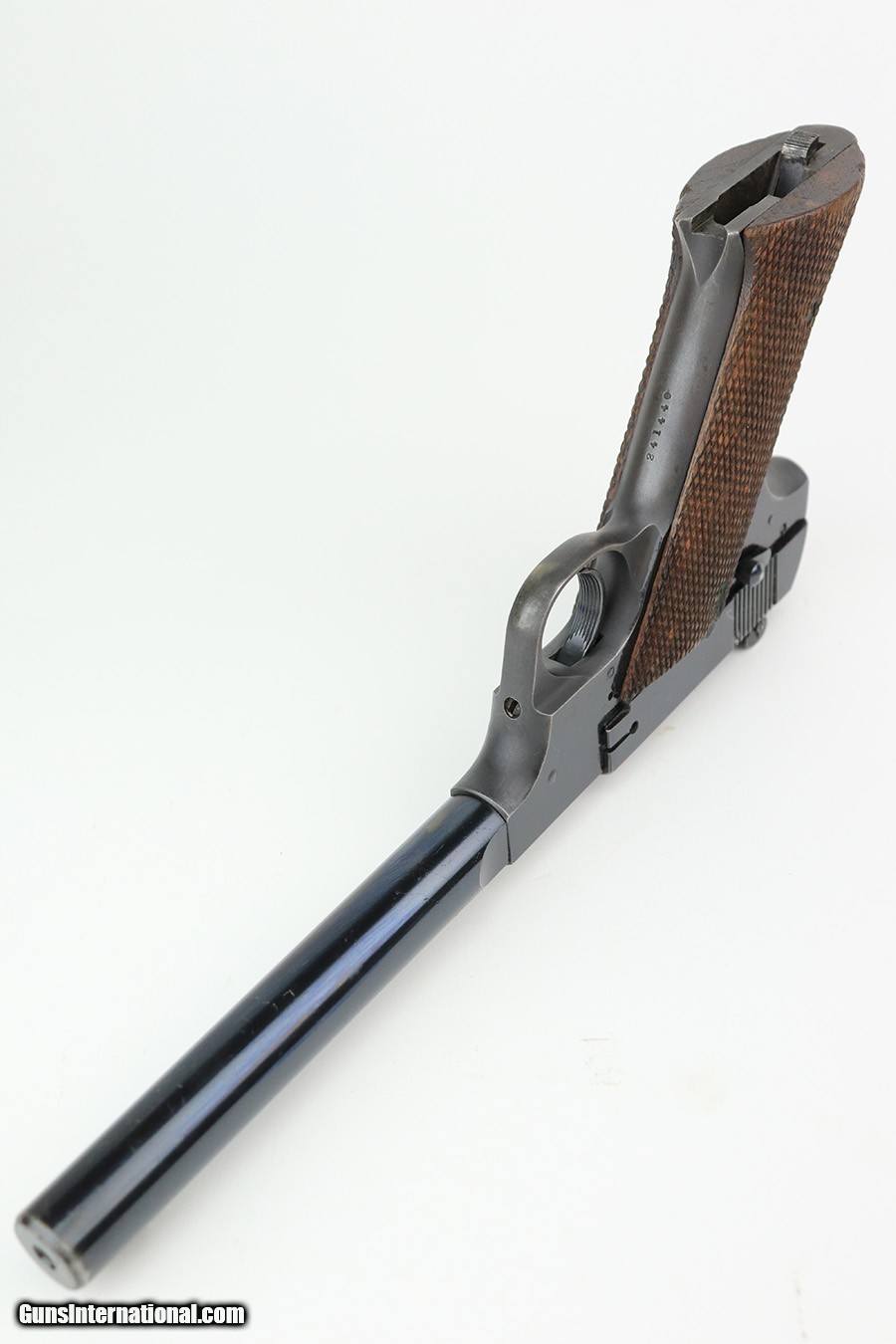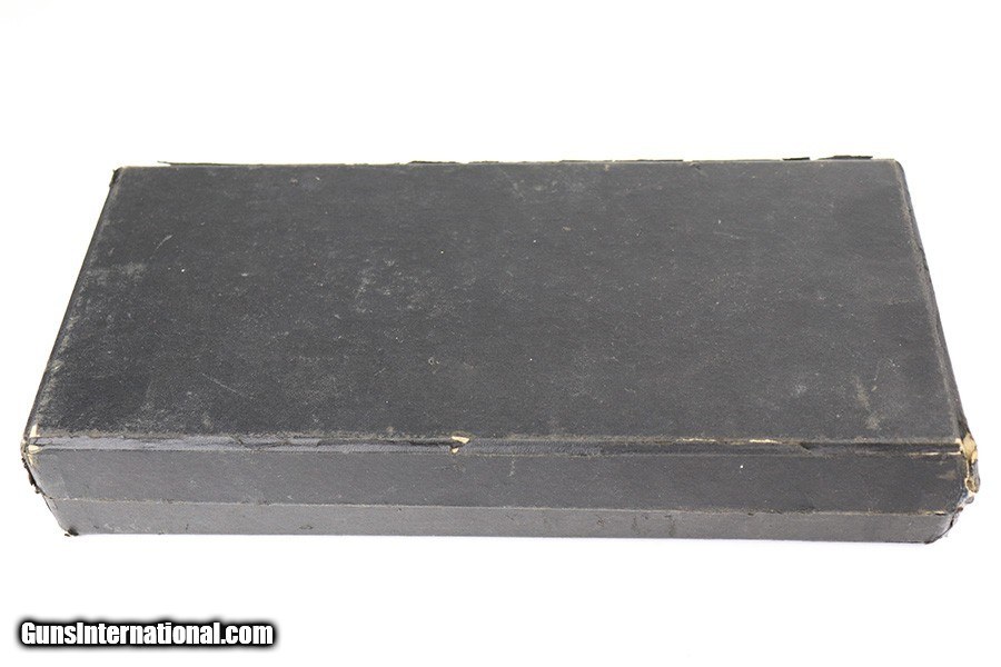 Description: This is a very nice example of a Hi Standard H-D Military pistol manufactured between 1946-1955. The gun is matching and comes with its original matching box (numbering is faint), owners manual, original wrapping, and even the original signed transfer paperwork from the Phoenix Police Department that has the original owner's information and this gun's serial number on it. The gun itself has retained about 93% of its original high polish bluing with most of the finish loss being on the grip straps. There is also some light scratchy wear along the barrel, minor muzzle wear, and a small spot of discoloration and pin-pricking on the left side of the frame. Comes with excellent wood grips and a proper magazine. Mint bore. SOLD Curio/Relic: Yes Handgun Caliber: .22 Long Rifle Bore: Mint Condition: ~93% |