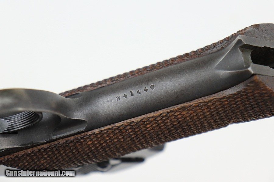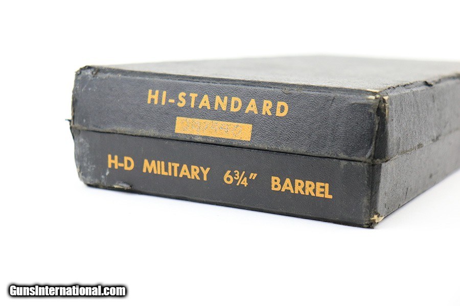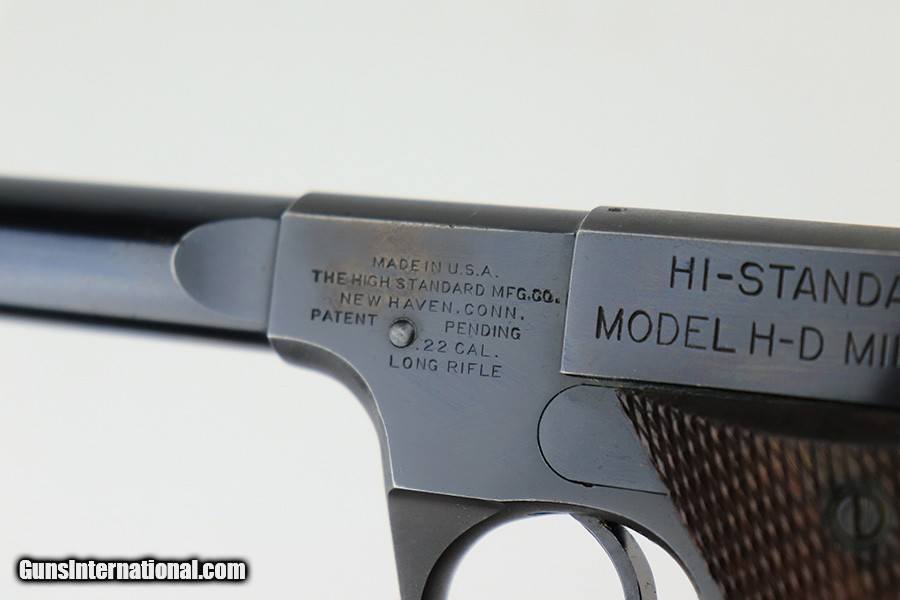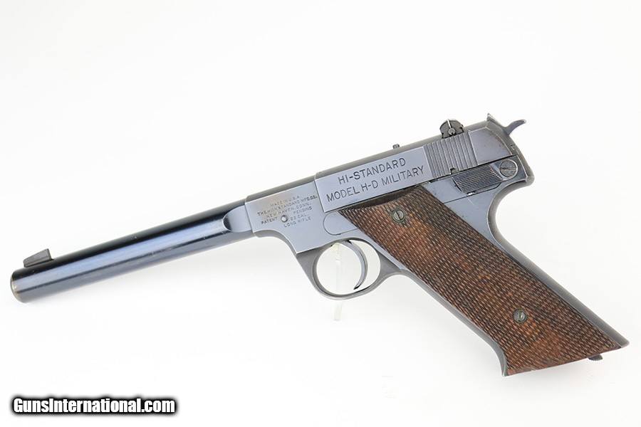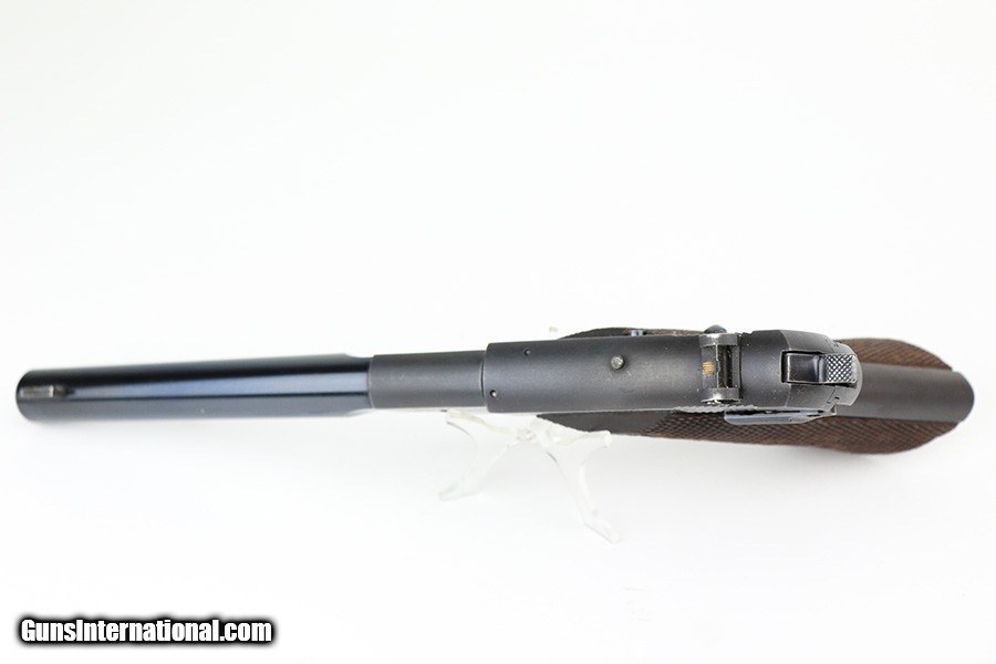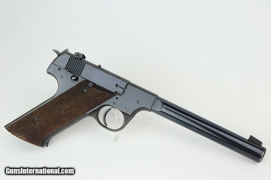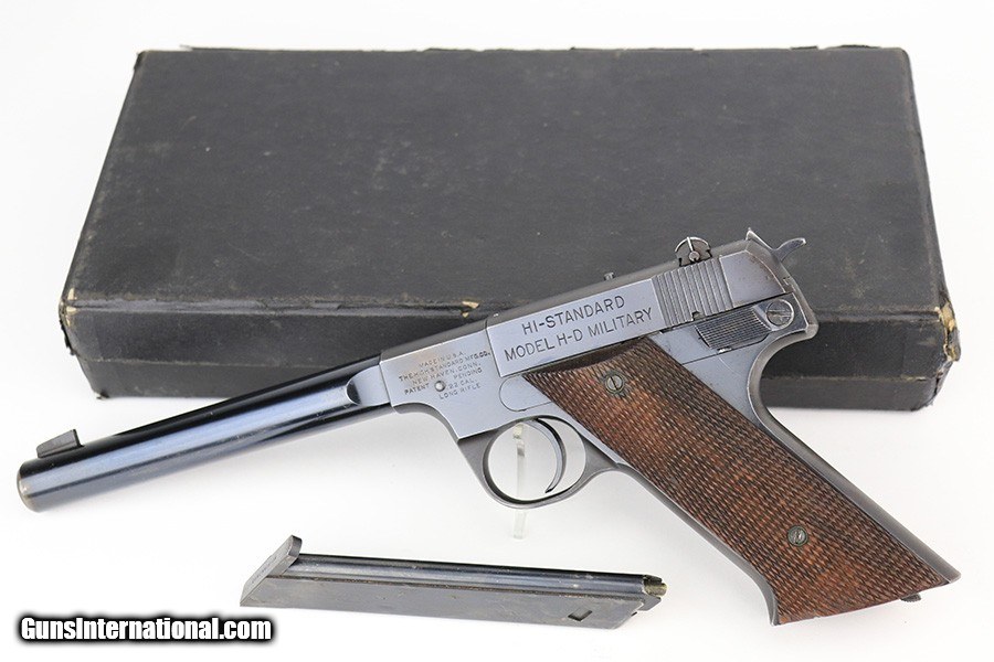 Description: This is a very nice example of a Hi Standard H-D Military pistol manufactured between 1946-1955. The gun is matching and comes with its original matching box (numbering is faint), owners manual, original wrapping, and even the original signed transfer paperwork from the Phoenix Police Department that has the original owner's information and this gun's serial number on it. The gun itself has retained about 93% of its original high polish bluing with most of the finish loss being on the grip straps. There is also some light scratchy wear along the barrel, minor muzzle wear, and a small spot of discoloration and pin-pricking on the left side of the frame. Comes with excellent wood grips and a proper magazine. Mint bore. SOLD Curio/Relic: Yes Handgun Caliber: .22 Long Rifle Bore: Mint Condition: ~93% |