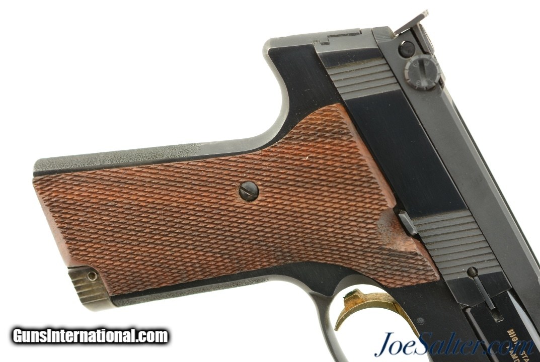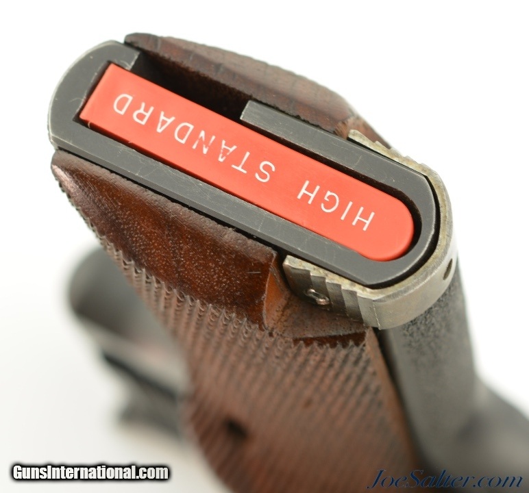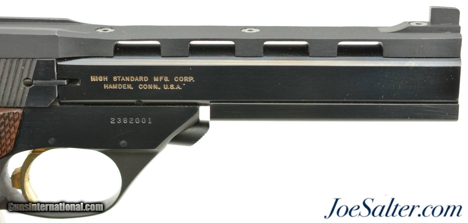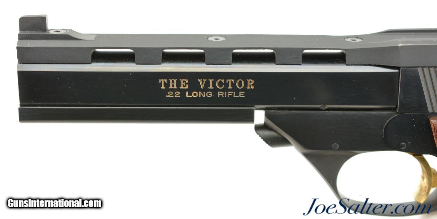 Description: Serial #2382001, .22LR, 5.5 inch barrel with a bright, excellent bore. This is the High Standard Model "The Victor" #9217 manufactured by High Standard in Hamden, CT in 1972 featuring slabbed barrel with ventilated steel rib and attached barrel weight and a red bottom High Standard marked 10 round magazine. In Excellent condition the barrel, frame and slide retain virtually all, 97-99% of the original blue and matte blue finishes with some very minor handling and use marks. The checkered walnut thumb rest grips rate excellent with crisp checkering. It comes in the original cardboard box numbered to the gun with a later copy of the manual. An excellent example of a highly desirable, early Hamden made Victor. FFL or C&R SOLD |