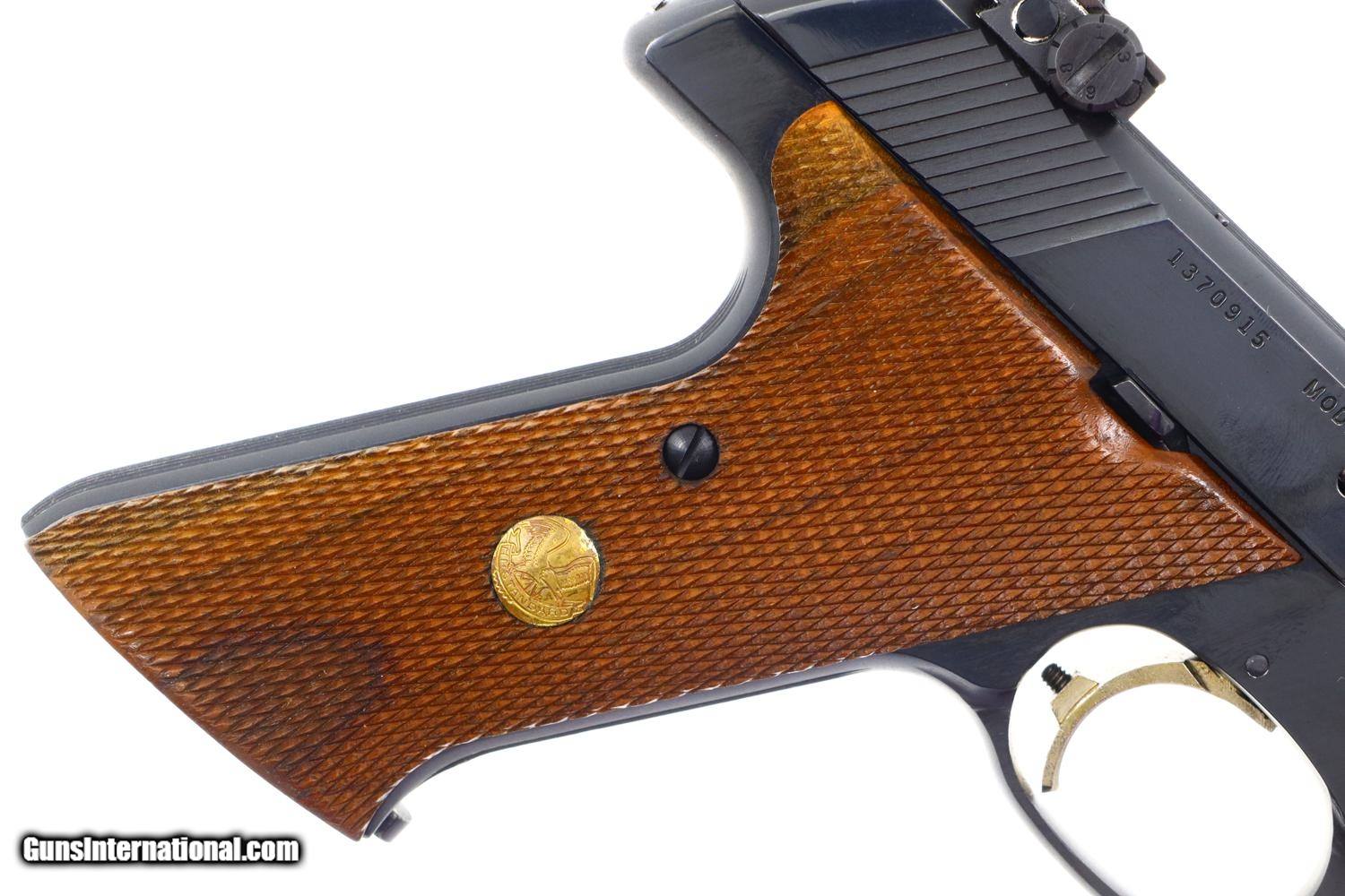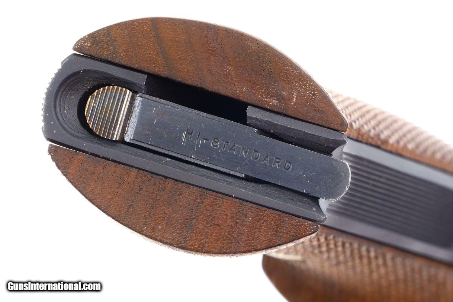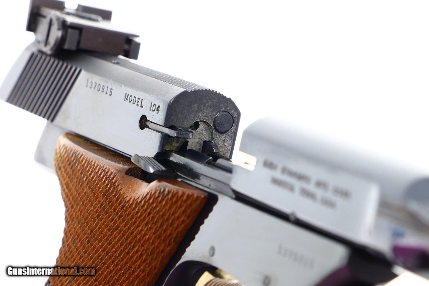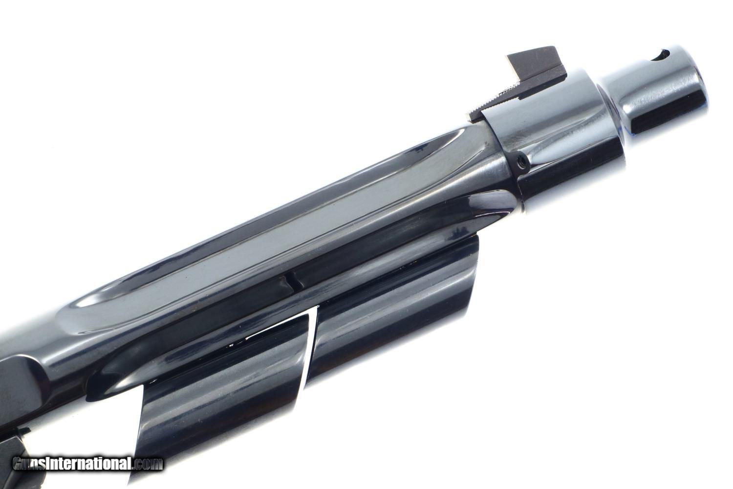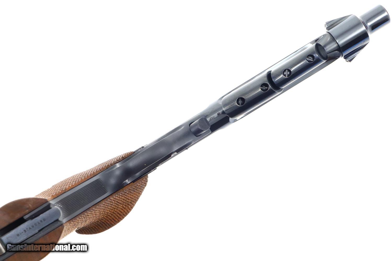 Description: Synopsis: Gorgeous High Standard 104 Supermatic Trophy with Weights, 1370915, FB01146 Description: Beautiful High Standard 104 Supermatic Trophy with 7.25in. fluted barrel complete with muzzle brake and both weights. One of the most charismatic of the space gun pistols, this example having been made in the mid 1960s. Left side of pistol marked with the caliber, model and ‘HI-STANDARD”. The right side is marked with the model, serial number (repeated on slide and frame), and HS location in Hamden, Conn. Usual patridge front sight and fully adjustable rear sight with push button take down, gold plated safety and trigger, and checkered walnut grips, the left panel with thumb rest, each panel with the HS medalions. Complete with fully blued magazine with integral floorplate marked HI-STANDARD. Condition: Approximately 99% bright original blue, except for a flew light flecks of oxidation on the left wing of the muzzle brake. Minimal bubbling of the gold plate on trigger. Virtually all blue on front and backstrap. EXC grips with crisp checkering. Magazine with scattered flecks of oxidation and mild insertional wear as imaged. Mirror bore. Perfect manual mechanics. A stunning high polish “Super Blue” High Standard 104 space pistol from the mid 1960s that deserves a correct box. ~~Insured shipping fee of $65; most packages shipped using FedEx 2nd Day.~~ SOLD Manufacturer: Hi-Standard Serial Number: 1370915 Caliber Info: .22 Long Rifle |