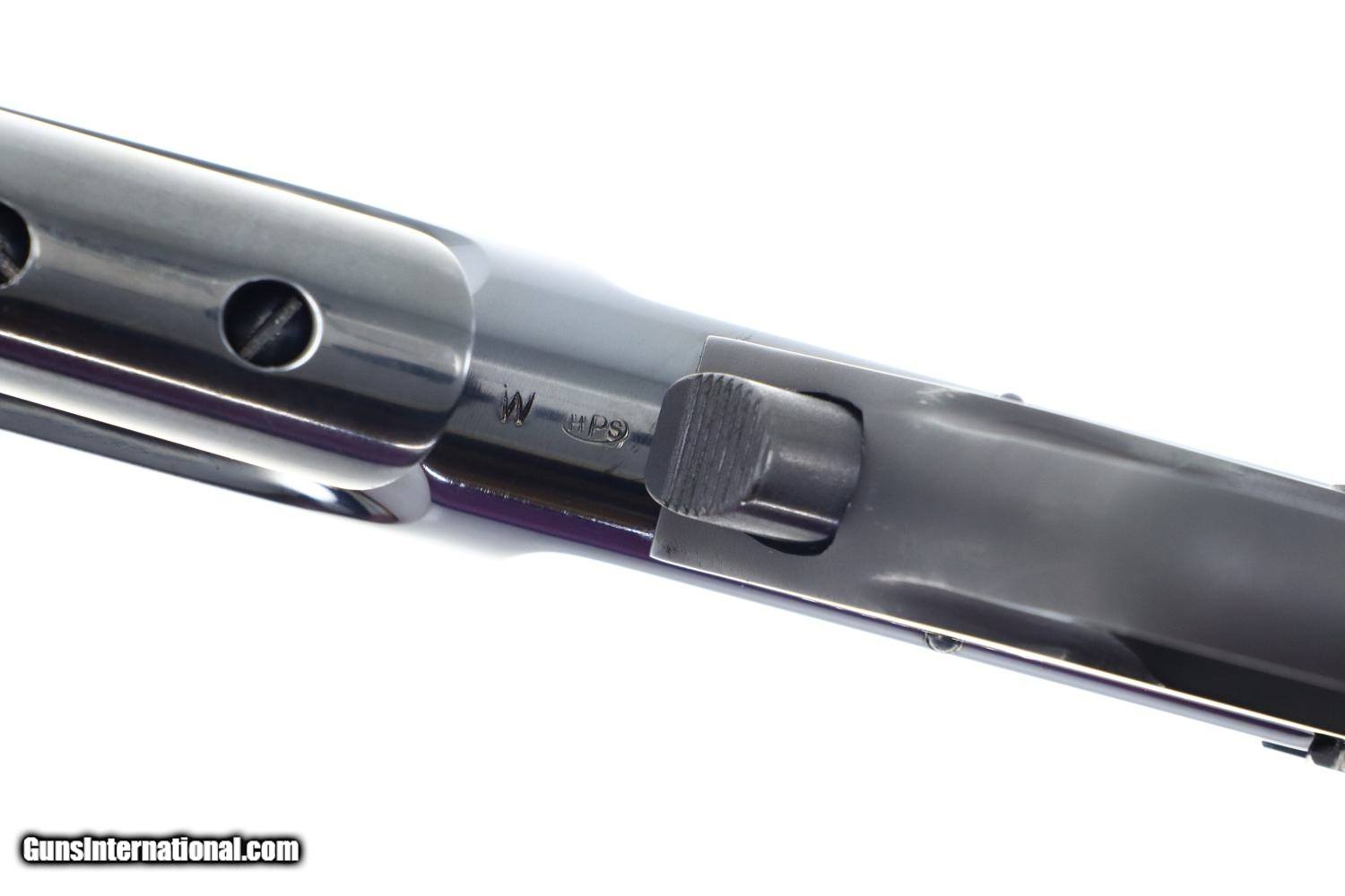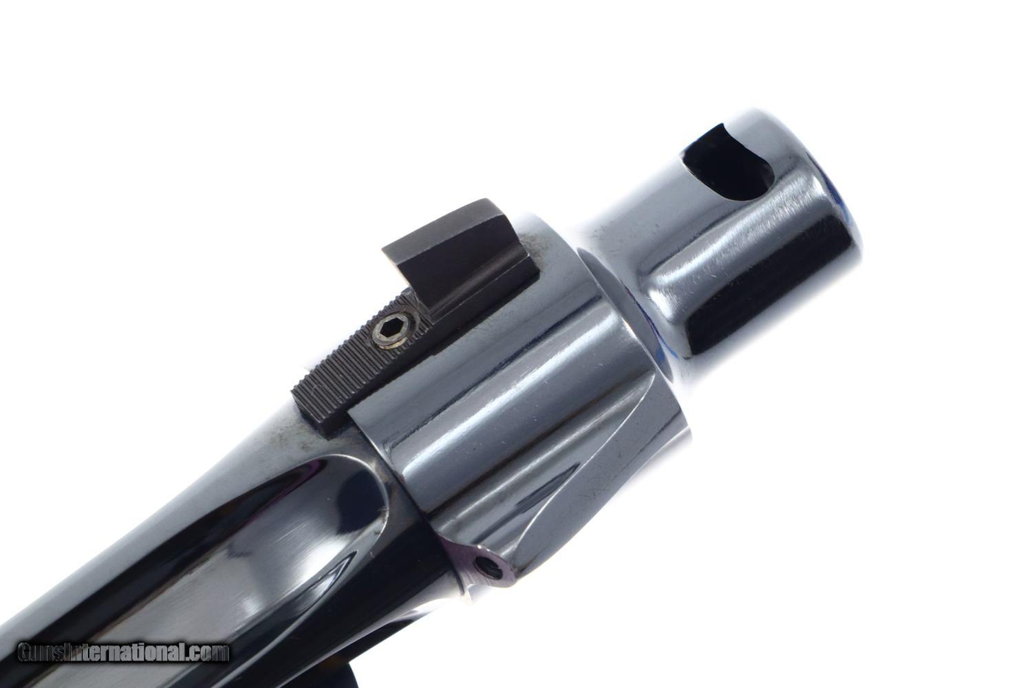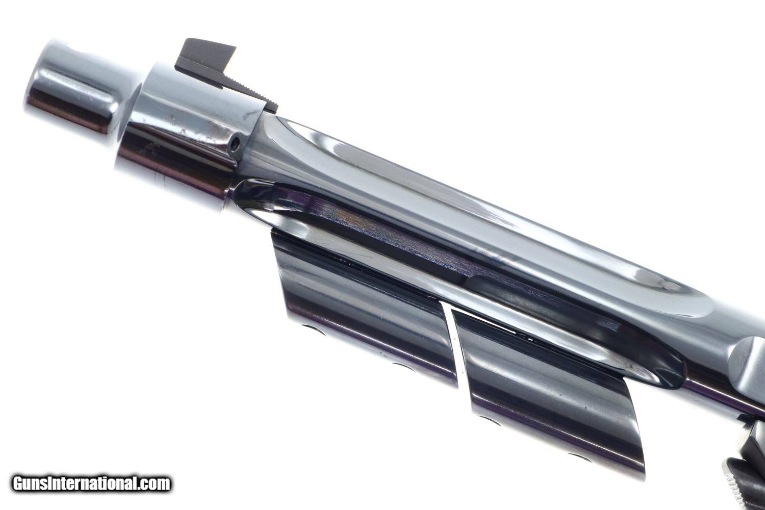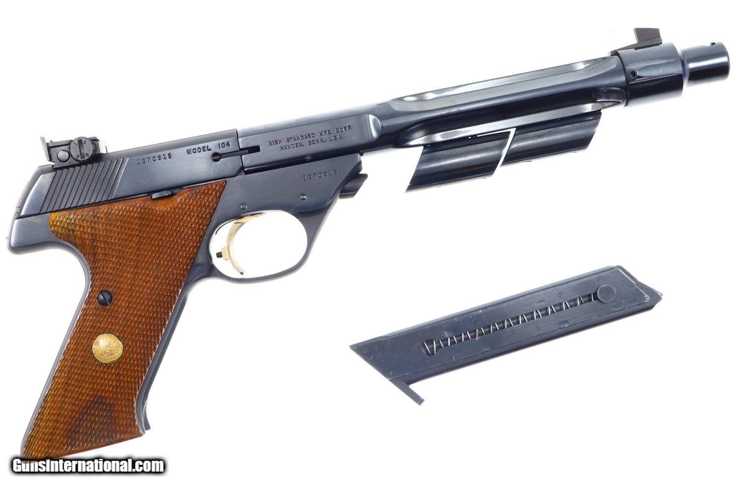 Description: Synopsis: Gorgeous High Standard 104 Supermatic Trophy with Weights, 1370915, FB01146 Description: Beautiful High Standard 104 Supermatic Trophy with 7.25in. fluted barrel complete with muzzle brake and both weights. One of the most charismatic of the space gun pistols, this example having been made in the mid 1960s. Left side of pistol marked with the caliber, model and ‘HI-STANDARD”. The right side is marked with the model, serial number (repeated on slide and frame), and HS location in Hamden, Conn. Usual patridge front sight and fully adjustable rear sight with push button take down, gold plated safety and trigger, and checkered walnut grips, the left panel with thumb rest, each panel with the HS medalions. Complete with fully blued magazine with integral floorplate marked HI-STANDARD. Condition: Approximately 99% bright original blue, except for a flew light flecks of oxidation on the left wing of the muzzle brake. Minimal bubbling of the gold plate on trigger. Virtually all blue on front and backstrap. EXC grips with crisp checkering. Magazine with scattered flecks of oxidation and mild insertional wear as imaged. Mirror bore. Perfect manual mechanics. A stunning high polish “Super Blue” High Standard 104 space pistol from the mid 1960s that deserves a correct box. ~~Insured shipping fee of $65; most packages shipped using FedEx 2nd Day.~~ SOLD Manufacturer: Hi-Standard Serial Number: 1370915 Caliber Info: .22 Long Rifle |
