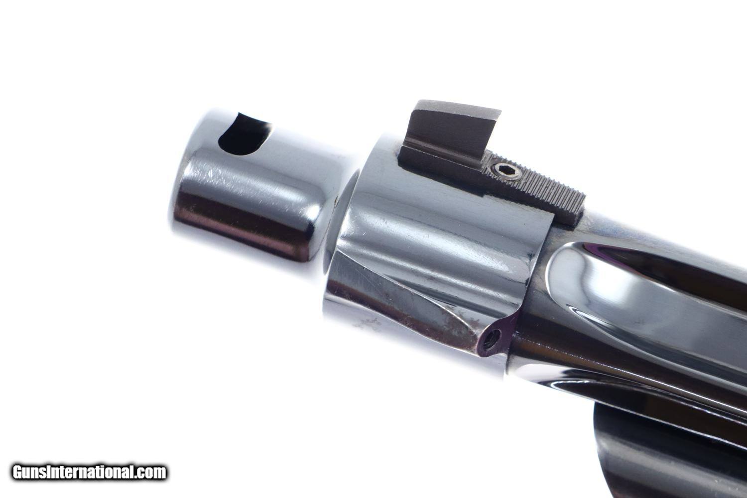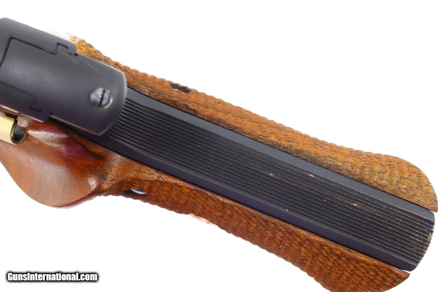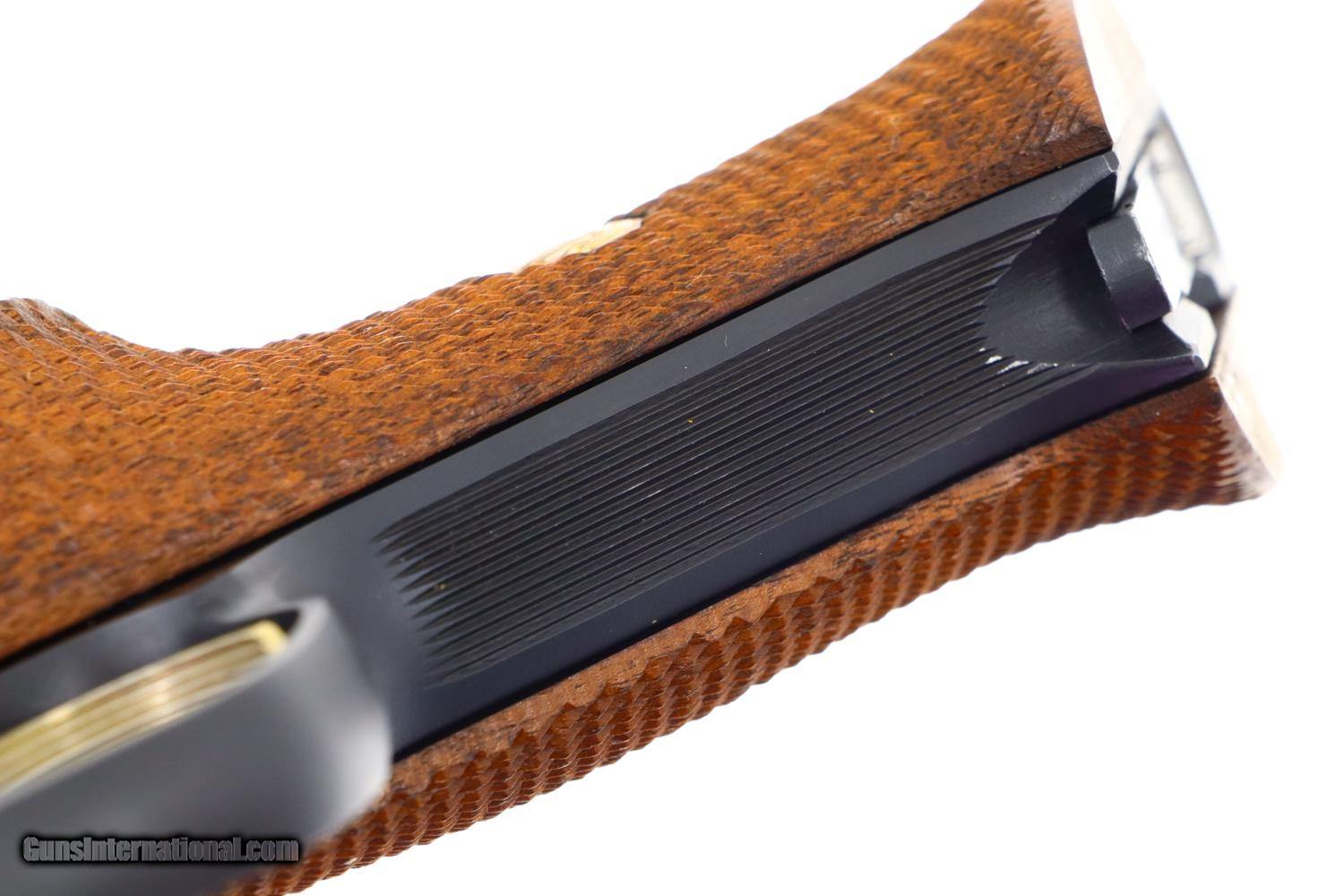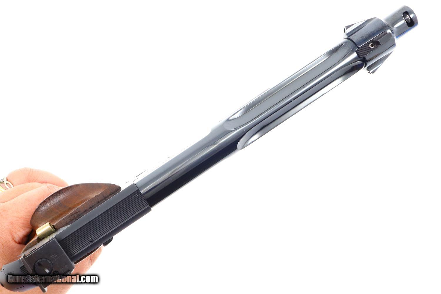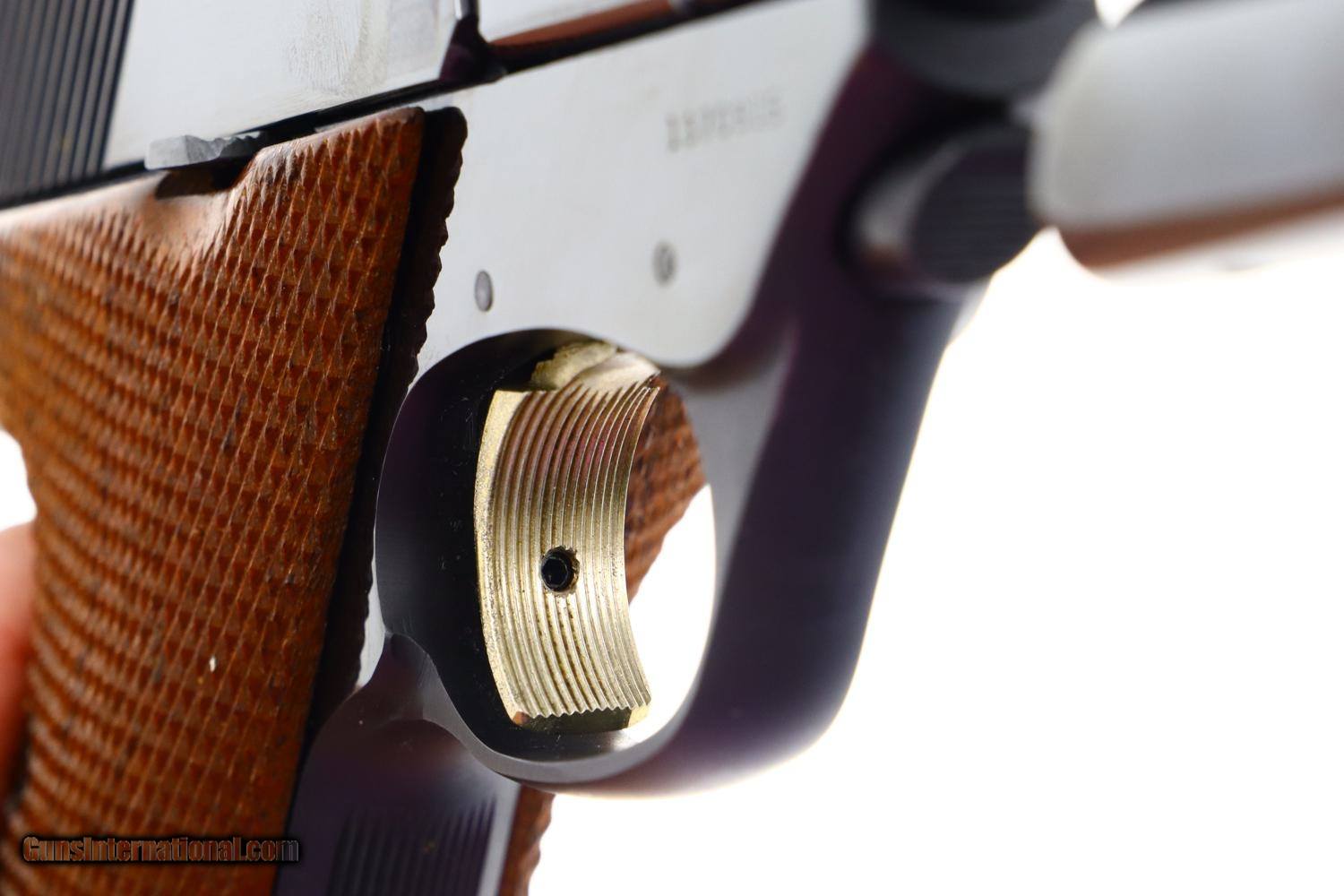 Description: Synopsis: Gorgeous High Standard 104 Supermatic Trophy with Weights, 1370915, FB01146 Description: Beautiful High Standard 104 Supermatic Trophy with 7.25in. fluted barrel complete with muzzle brake and both weights. One of the most charismatic of the space gun pistols, this example having been made in the mid 1960s. Left side of pistol marked with the caliber, model and ‘HI-STANDARD”. The right side is marked with the model, serial number (repeated on slide and frame), and HS location in Hamden, Conn. Usual patridge front sight and fully adjustable rear sight with push button take down, gold plated safety and trigger, and checkered walnut grips, the left panel with thumb rest, each panel with the HS medalions. Complete with fully blued magazine with integral floorplate marked HI-STANDARD. Condition: Approximately 99% bright original blue, except for a flew light flecks of oxidation on the left wing of the muzzle brake. Minimal bubbling of the gold plate on trigger. Virtually all blue on front and backstrap. EXC grips with crisp checkering. Magazine with scattered flecks of oxidation and mild insertional wear as imaged. Mirror bore. Perfect manual mechanics. A stunning high polish “Super Blue” High Standard 104 space pistol from the mid 1960s that deserves a correct box. ~~Insured shipping fee of $65; most packages shipped using FedEx 2nd Day.~~ SOLD Manufacturer: Hi-Standard Serial Number: 1370915 Caliber Info: .22 Long Rifle |