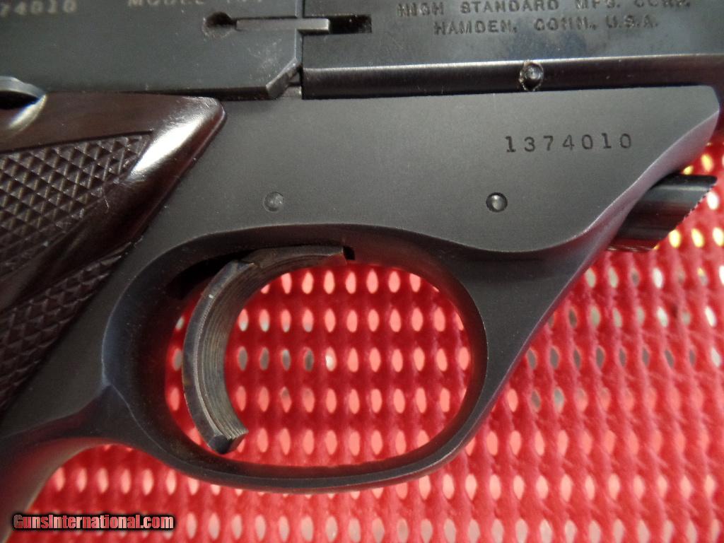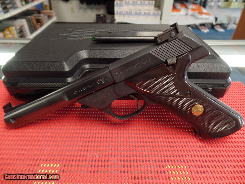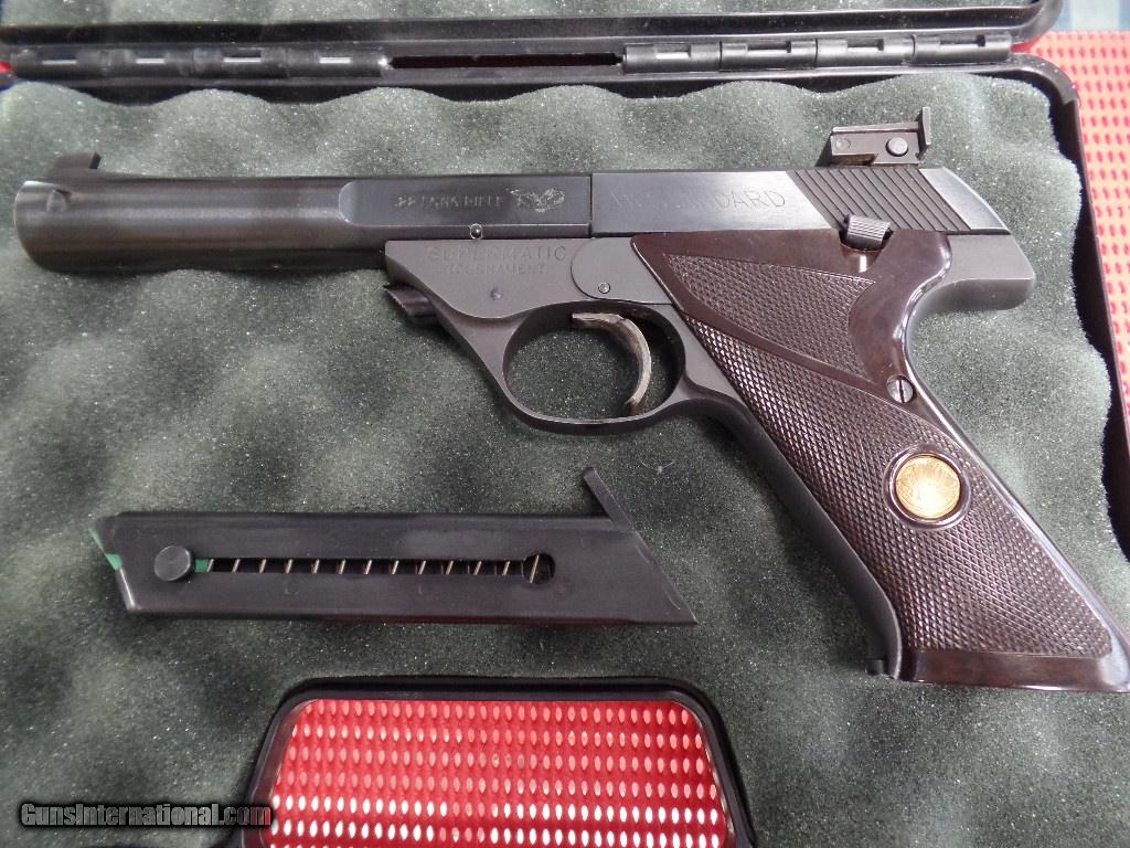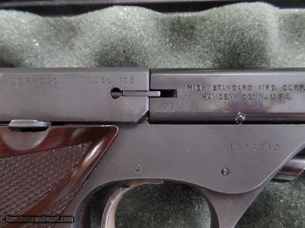 Description: USED: Great Condition Hi-Standard Model 103 Supermatic Tournament .22LR Pistol, 5.5" Barrel, 2-10Rd Mags, Manufactured in 1963 SHIPPING: Shipping and handling charge will be $30.00. All firearms must be shipped to a FFL transfer dealer. We ship to the continental US ONLY. It is your responsibility to make sure you comply with the laws of your county, state, and city on this item. We ship via USPS Priority Mail or UPS with insurance. PAYMENT: We accept Money Orders and Cashier’s Checks. We also accept Discover, MasterCard, and Visa but add 3% credit card processing fee. We must collect sales tax if you live in Illinois (6.75%). We are a licensed FFL dealer. Thank you for your interest! SOLD Manufacturer: Hi-Standard Model: 103 Supermatic Tournament Serial Number: 1374010 Caliber Info: .22LR Condition: Great Barrels: 5.5 Action: Semi-Auto Case: Plastic Case Item Location: Lovington IL |