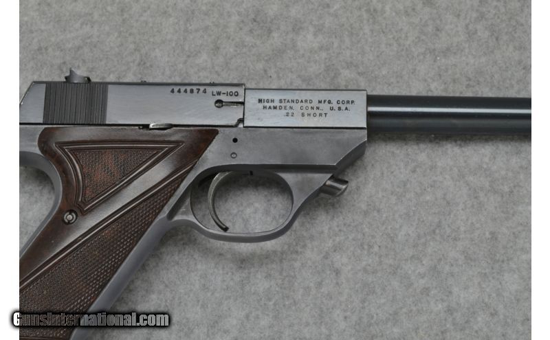 Description: Used, A fine example of this hard to find .22 short only semi-auto pistol. SOLD Manufacturer: 1953-1959 S/N 4448xx Caliber Info: .22 Short Metal Condition: Good to Very Good - some finish wear around muzzle, a few nicks on slide and barrel. Very Nice Bluing Bore Condition: Bright and sharp Barrels: 6 3/4" Blued Triggers: Grooved, Blued Stock: Brown Plastic Bakelite Checkered Grips with Thumb Rest and Eagle Logo Weight: 25 oz. Sights: Front: square notch with anti-glare serrations Rear: Square Notch, Adjustable for Windage Extras: Includes One Magazine Item Location: Sun Prairie, WI |